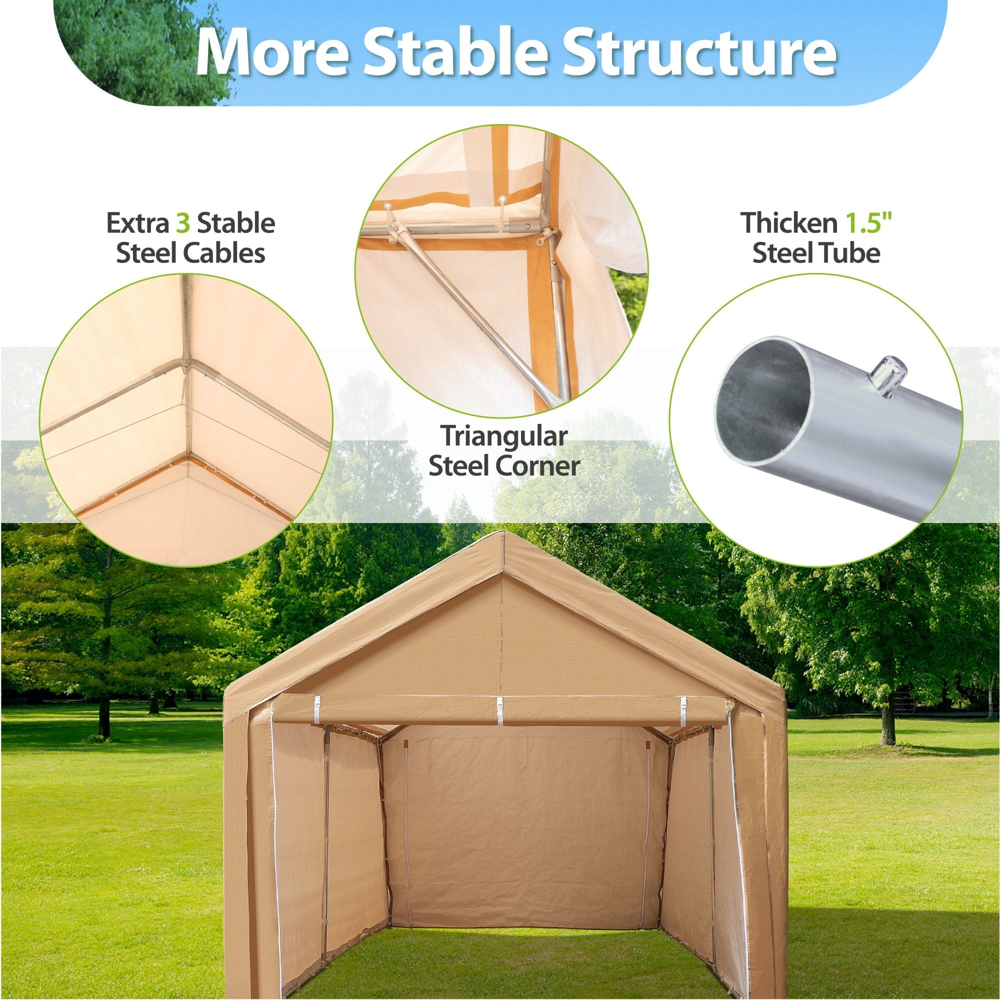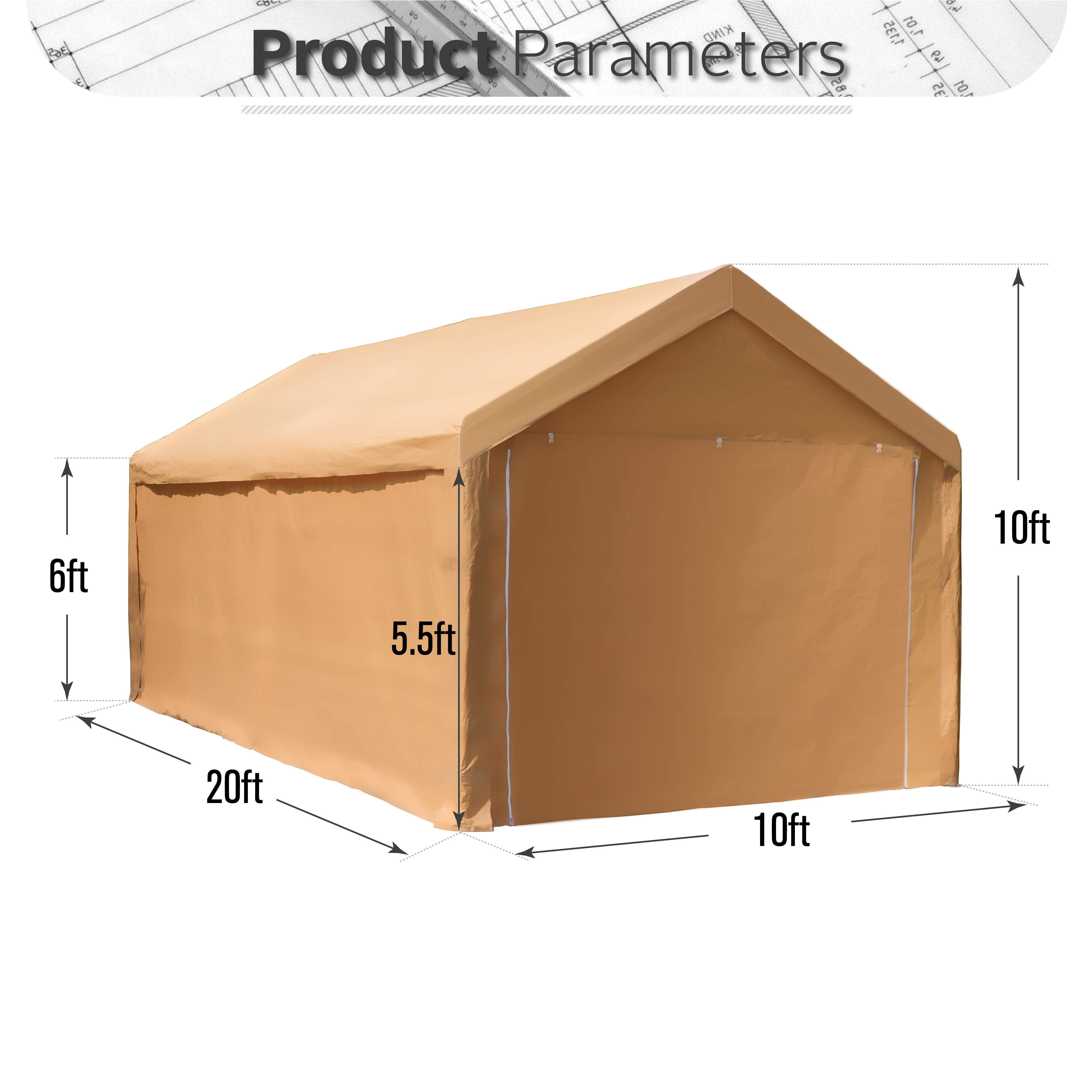 10ft x 20ft Carport Garage Boat Shelter Party Tent Weather is so unpredictable so protect your vehicle, boat, motorcycle, bike, etc with this heavy duty portable carport that is designed with quality materials and finishes. Of course, it can also be used for whatever you like: camping canopy, wedding, party, picnic, sporting event, business, car garage, car canopy etc. Using strong 1.5-inch diameter alloy steel, the frame is durable and strong, great for many seasons to come. Extra-thick 180g polyethylene fabric, durable anti-UV, waterproof, tear resistance cover can provide your vehicles maximum weather damage protection against harmful UV, rain, snow, dirt and scratches. Protect your car or vehicle every day with this carport from Sophia&William. 100% Waterproof Canopy Cover: This carport is made of 180g polyethylene fabric, which is Anti-UV, Waterproof and can protect your car or boats against all four season elements, like sun, wind, rain, dust, hail and snow. Superior Quality Reinforced Triangular Beam: Triangle support brings stability. Triangular reinforcement beams on top and sides of main body frame, which effectively reduce the risk of anti-twisting and collapsing of shelves under severe outdoor weather conditions. Multi-stability Design: Connector using art-welding, elastic ball strap fasten the canopy to the frame, Come with ground stakes and guy ropes for extra support. keep your belongings safe and secure. Removable Sidewalls And Doors: The second option carport shelter has 2 removable sidewalls and two removable doors with zippers. You can roll the doors up or down when needed. You can also remove all the sidewalls and doors, only leave canopy cover on for outdoor activities. Easy to Set Up: The tool-free frame makes its set-up super quick and easy. Step-by-step instructions are included. Usually, two or more adults can install this portable car tent in half an hour. And you can use it for party, fairs, Birthday, also for storage shelters like boats, truck, lawn and garden equipment, etc. What’s Included? Steel Frame 2 Wall Sides Installation Hardware Mounting/Anchoring Kit Specifications: