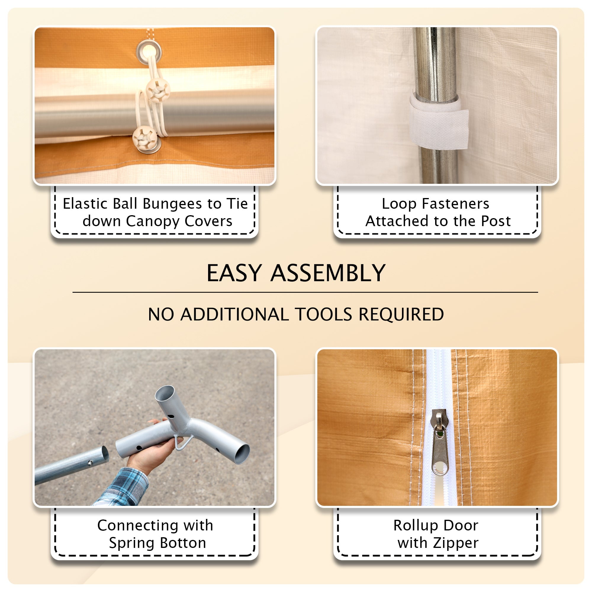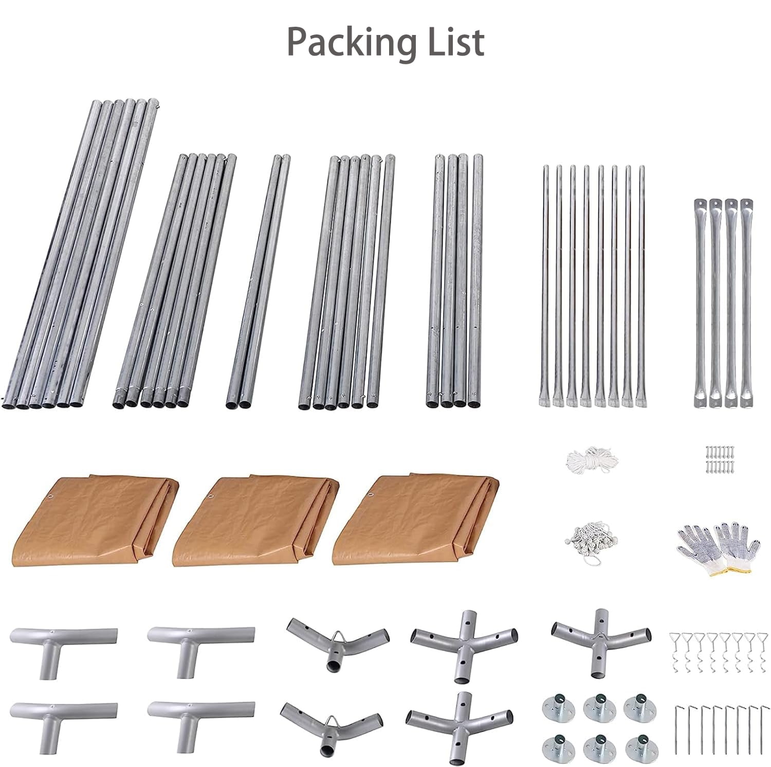 Pole Materials: 1.5Inch(38mm), Updated Rust-free Galvanized Steel Cover Materials: 180g Polyethylene, Anti-UV, Water-proof, tear-proof Top peak Height: 9.5ft Sidewall Height: 6.5ft Wide Usage: perfect for Car, Truck, Party, Wedding, Boats, Storage, Shelter, Horse Shade, Motorcycle, etc. Note: In the event of severe weather conditions such as snowstorms, heavy rain, or strong winds, it is crucial to take down the PE cover to prevent it from being damaged or blown away by the elements.