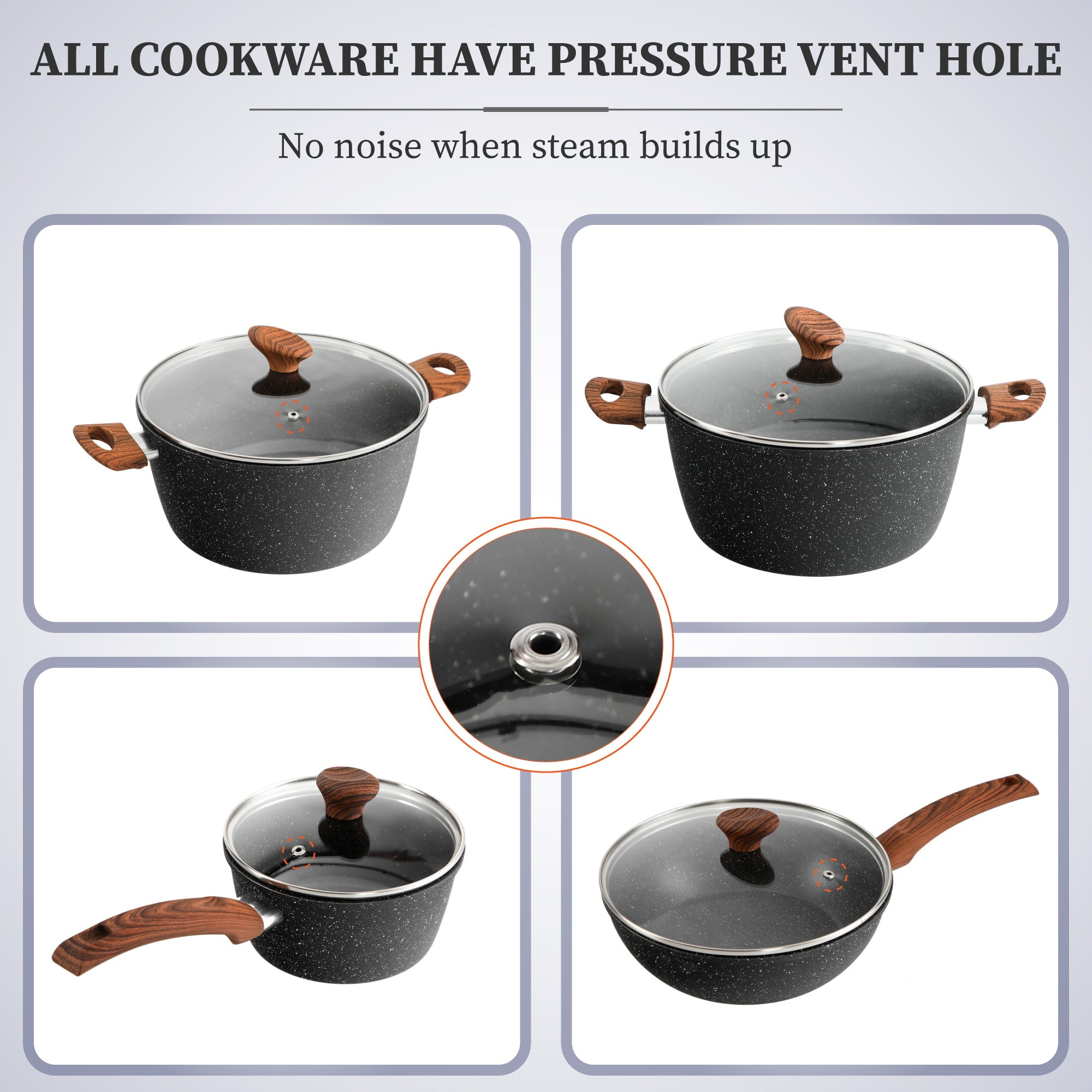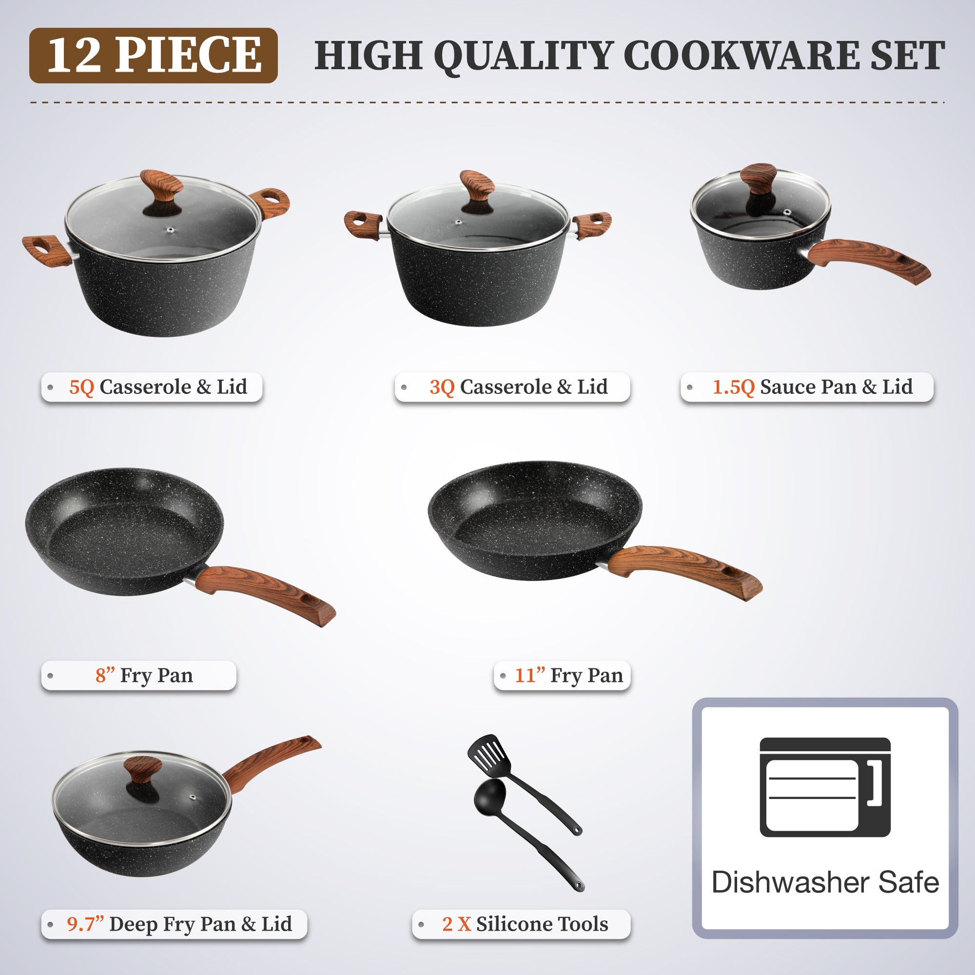 Introducing our 12 Pieces Nonstick Granite Coating Cookware Set on Clearance– the ultimate kitchen set for the modern home chef! Crafted with precision and designed for perfection, this granite pot and pan set combines style, functionality, and health-conscious features to elevate your cooking experience. Detailed Introduction 【Healthy Cooking】: Say goodbye to unhealthy fumes and excessive smoke in your kitchen. Our cookware features a non-stick granite coating that not only ensures a smokeless cooking experience but also promotes healthy, oil-free cooking. Savor the flavors of your dishes without the worry of harmful toxins. 【Efficient Heating】: With an aluminum core, our cookware heats up quickly and distributes heat evenly across the surface, eliminating hot spots. This ensures that your food cooks to perfection every time, whether you’re searing, sautéing, or simmering. 【Versatility Feature】: Versatility is key, and our cookware doesn’t disappoint. It’s compatible with all major cooktops, including induction, gas, ceramic, electric, and halogen, making it a fantastic addition to any kitchen. 【Easy to Clean】: Cleaning up after a delicious meal is a breeze with our non-stick granite coating. You’ll spend less time scrubbing and more time enjoying your culinary creations. 【Safe】: Rest assured that our cookware is free of any harmful toxins. Your health and well-being are our top priorities. 【Stylish and Durable】: The sleek black finish adds a touch of elegance to your kitchen, while the wooden handles and knobs provide a comfortable grip. The tempered glass lids allow you to monitor your dishes’ progress without lifting the lid. Specification Material: Aluminum body + tempered glass lid + wooden handle and knob + silicone utensils Finish: Granite coating Color: Black Complete 12-Piece Set: This set includes everything you need to tackle any culinary challenge: 8” fry pan 11” fry pan 9.7” deep fry pan with lid 1.5 qt saucepan with lid 3 qt casserole with lid 5 qt casserole with lid 2 pieces silicone utensils
