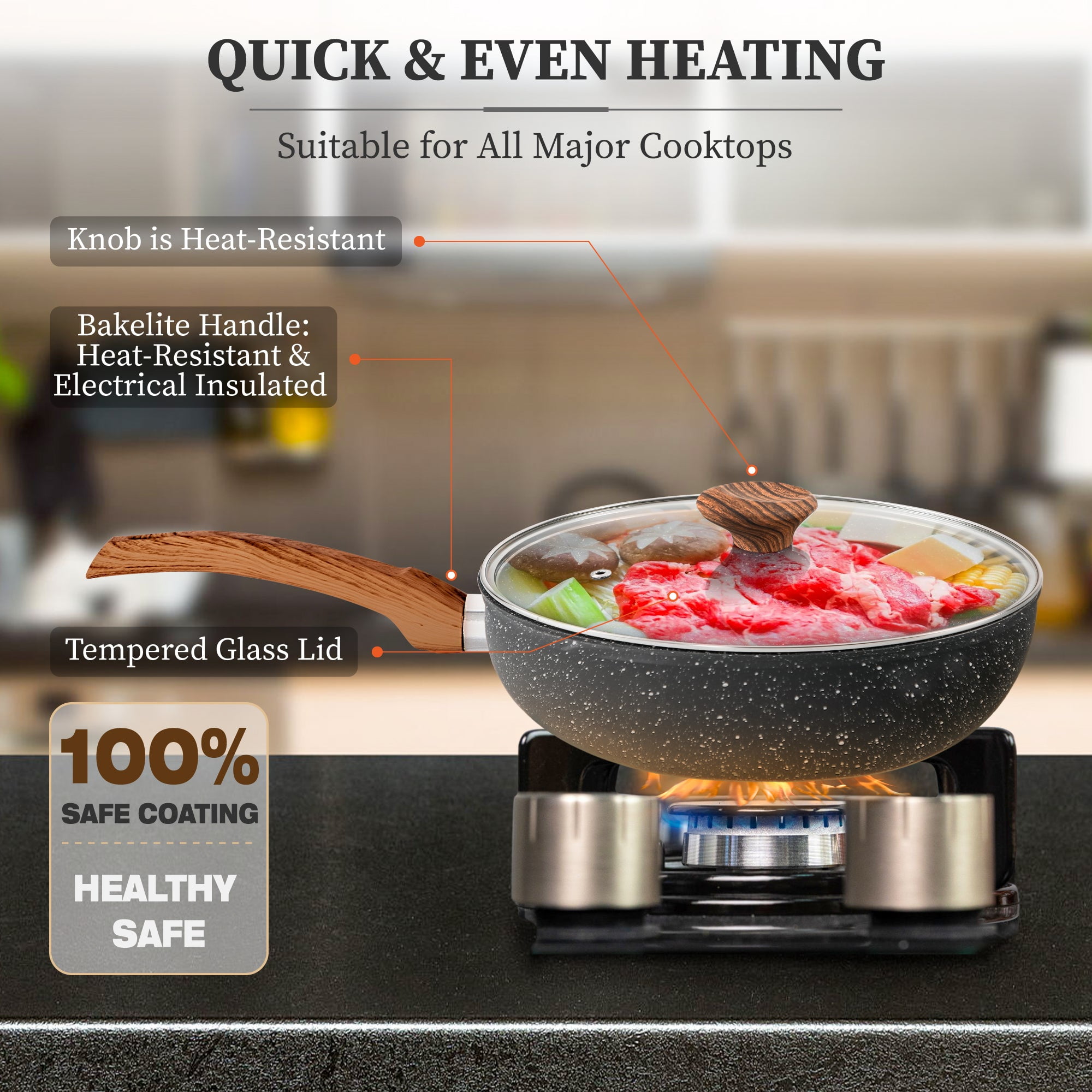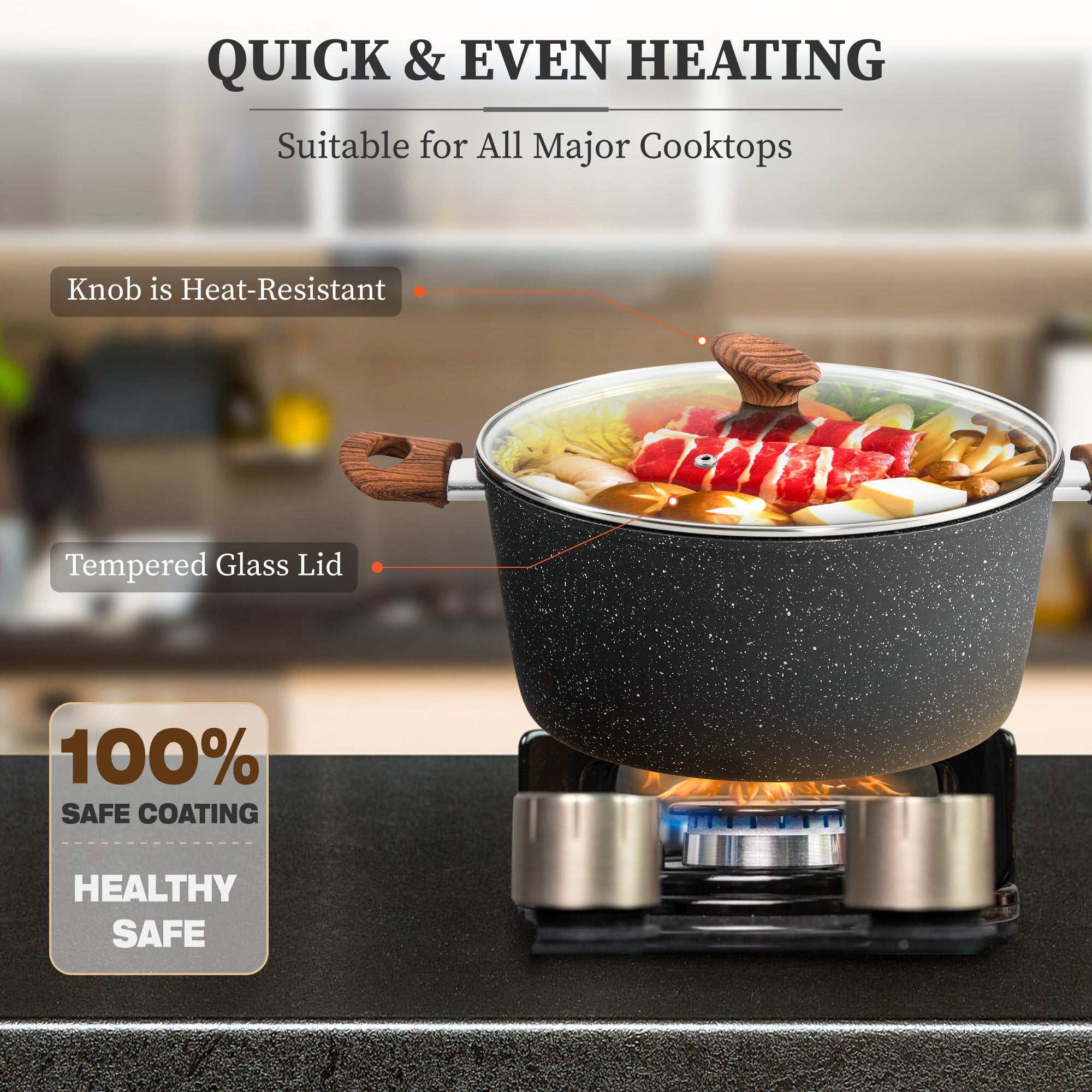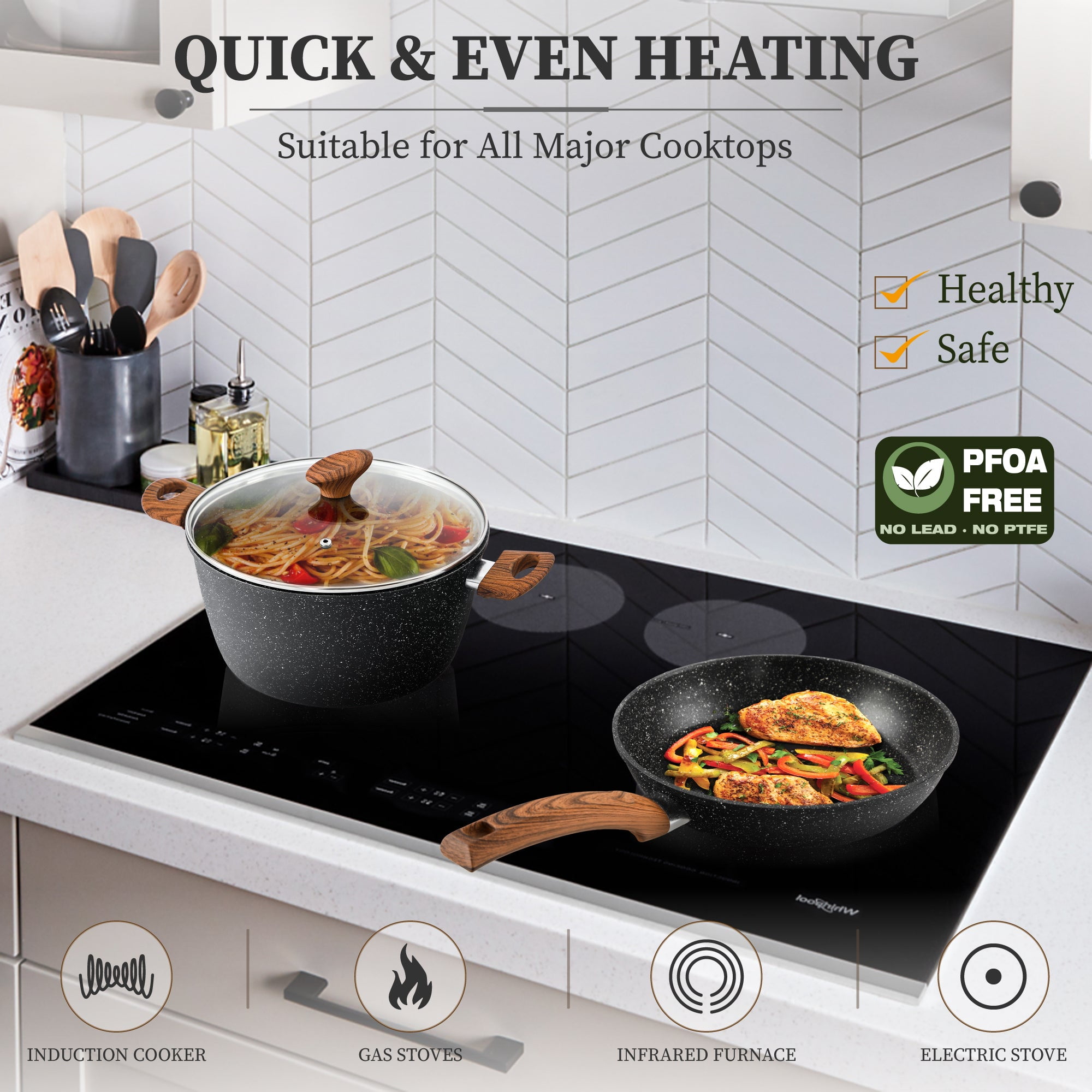Sophia & William 12 Pieces Cookware set Nonstick Granite Coating Aluminum core conducts heat faster Free of any toxins and safe Fast and even heating Compatible with all major cooktops
