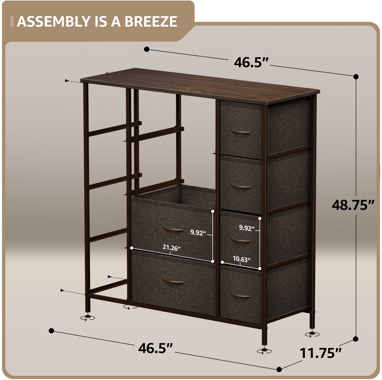 5-drawer dresser (black frame/charcoal gray drawers). Lightweight and easy to assemble. Hardware and instructions INCLUDED. Drawers made of non-woven (polyester) fabric. Frame made of steel and MDF wood with brown finish. Accessories shown in image NOT INCLUDED. Measures approximately 46.5” L x 11.75” W x 48.75” H. Larger drawers measure approximately 21.26″ x 9.92″, small drawers measure approximately 10.63″ x 9.92″