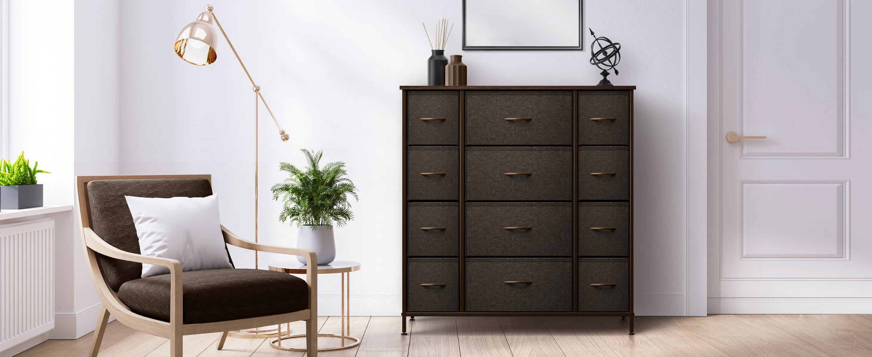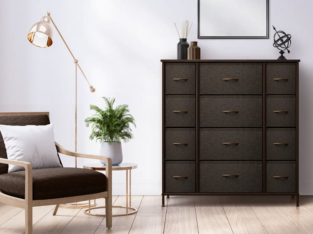 Tuck away your essentials in the Sorbus 12-Drawer Dresser! Sleek and minimal, this versatile storage solution features a faux wood top surface and a durable steel frame. Twelve spacious fabric drawers pull out smoothly, offering plenty of room for clothing, linens, accessories, and more. Ideal for bedrooms, walk-in closets, college dorms, or home offices, it helps you stay organized while enhancing your space. Lightweight and easy to move, the frame is portable, and the drawers fold flat for compact storage when not in use. Style it solo or coordinate with matching pieces from the Sorbus Furniture Collection. Great for any room. Add this charming dresser to your primary bedroom, guest room, or closet for a clutter-free look. Store everyday essentials or seasonal items and use the top surface to display decorative accents like framed photos, candles, or plants. Wherever it’s placed, this dresser brings practical storage with a touch of modern style.