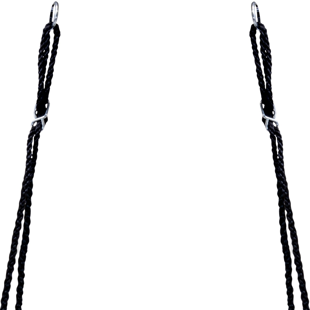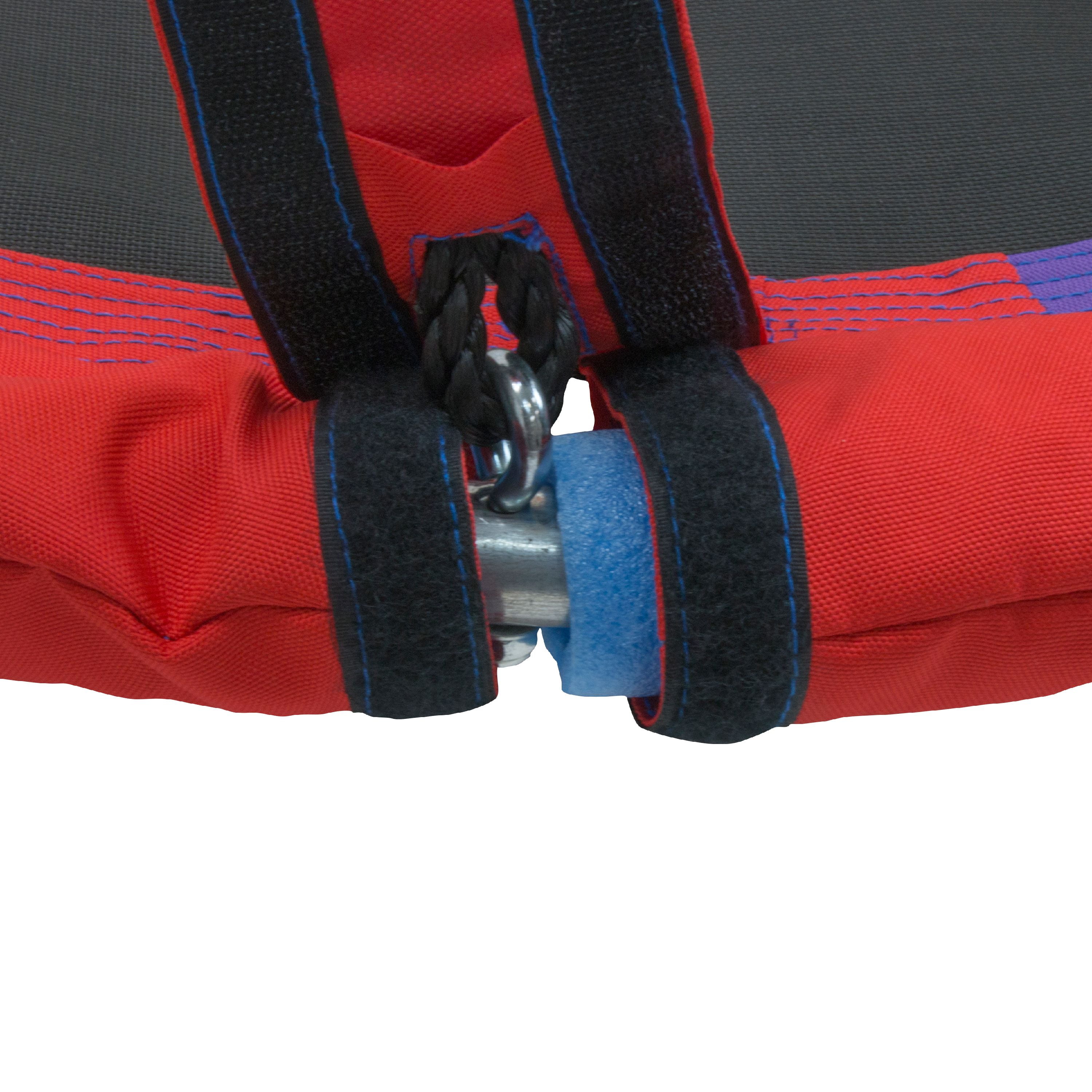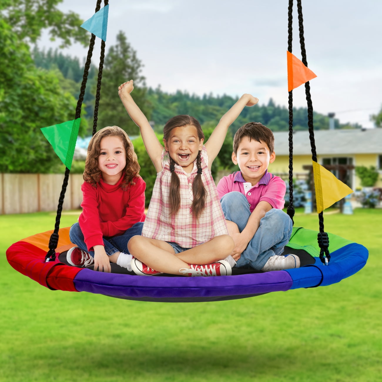 40” SAUCER MAT SWING ((BLACK/MULTI-COLOR) — Provides a fun hang out spot for kids (and adults) to safely swing into action for playtime or relaxation — Fits 2-3 kids FOR INDOOR/OUTDOOR FUN — Great for backyards, playgrounds, indoor play areas, etc — Low grade weatherproof — Can be used as chair swing for tree, hammock swing for swingset, nest swing chair, swings for playsets — Fun way to play, lounge, and enjoy imaginative play with friends and family — Gentle swing movement encourages balance, supports sensory needs, hyperactivity, and more — Makes a great gift — Perfect for parties and play dates COMFY HANGING SEAT — Mat seat provides super comfy and sturdy ride — Holds up to 220 lbs for safe riding experience — Provides superior strength while keeping swing in place QUICK & EASY ASSEMBLY — Hangs from 2 points for swinging — Top of ropes have steel rings which connect to adjustable suspension rope up to 63” long from seat to connection point — Hangs almost anywhere whether mounted from tree, swing set, or beam in the house — Designed for secure installation STURDY DESIGN & PADDED FRAME — Seat made of heavy-duty (PP) polypropylene and oxford fabric in black — Multi-color rainbow frame, orange, yellow, green, blue, purple — Rope made of PE (Polyethylene) — Steel tube frame padded with NBR foam (approx. 1.6” thick) — Includes saucer swing, flags, hardware, and instructions — Adult supervision and assembly required — Recommended for children 3+ years — Maximum weight is 330 pounds — Spot clean — Maximum Tilt is 45° — Measures approx 40” D x 63” H
