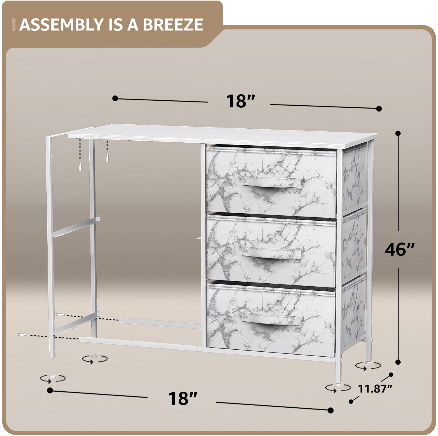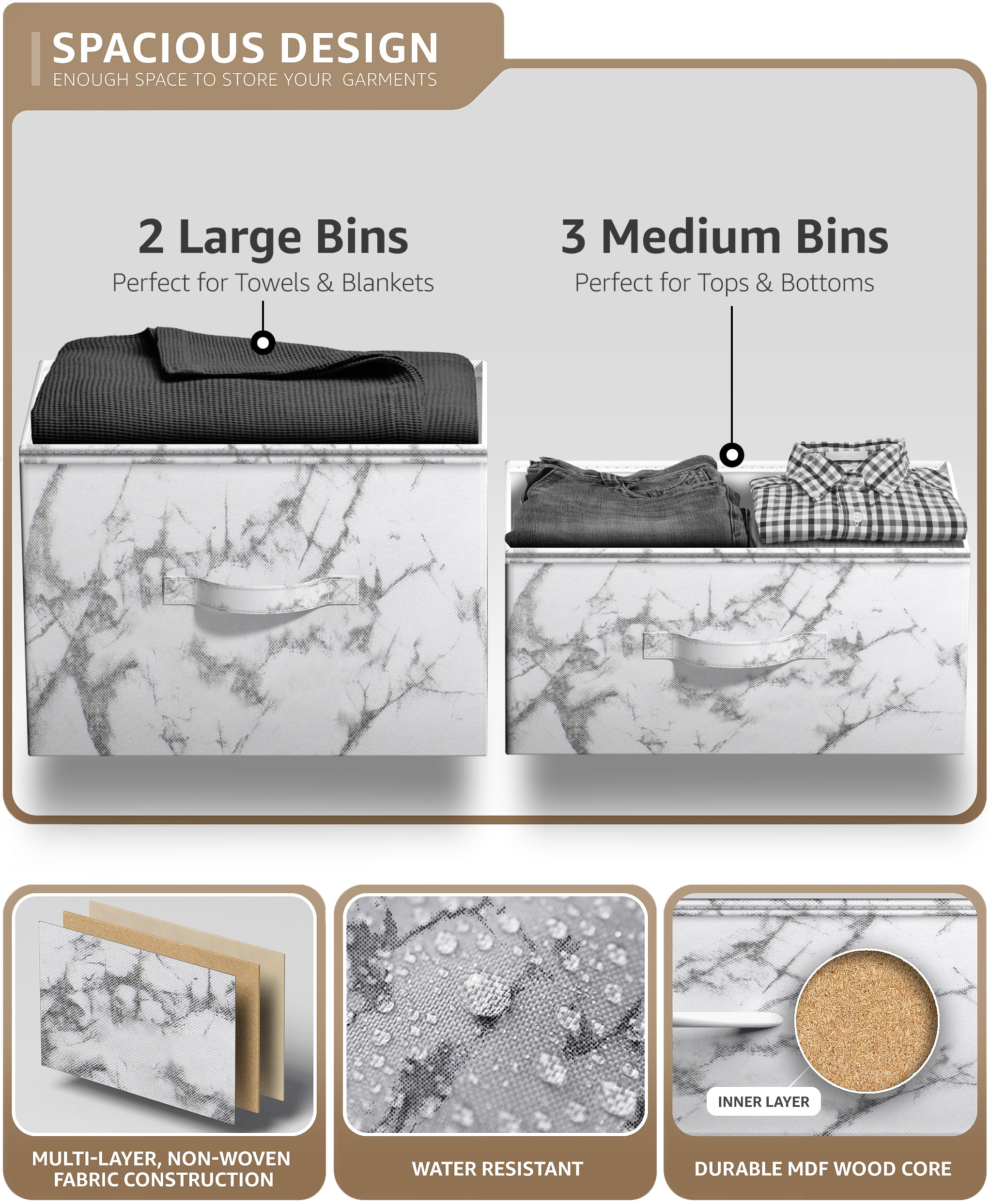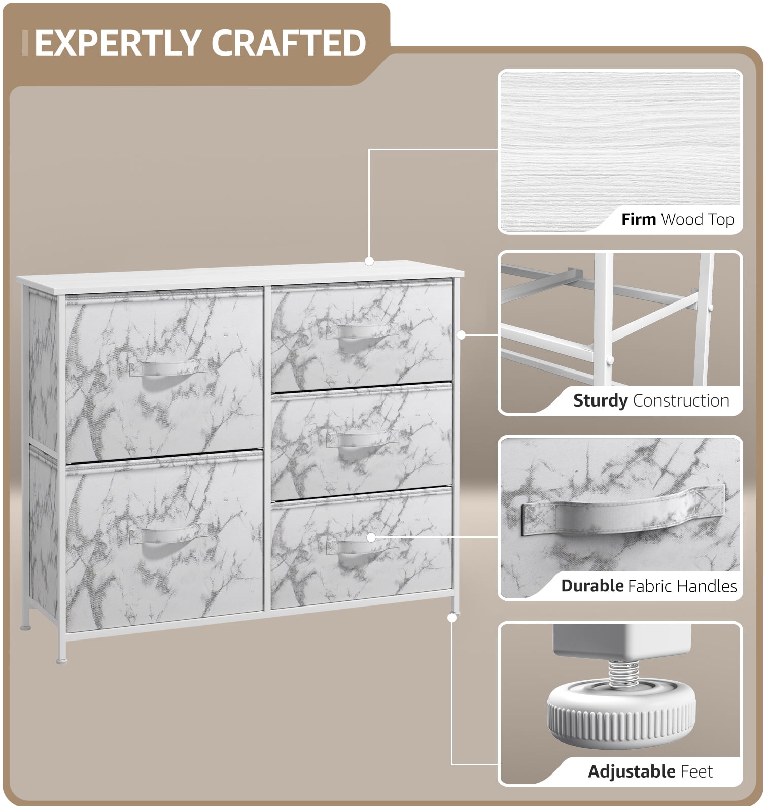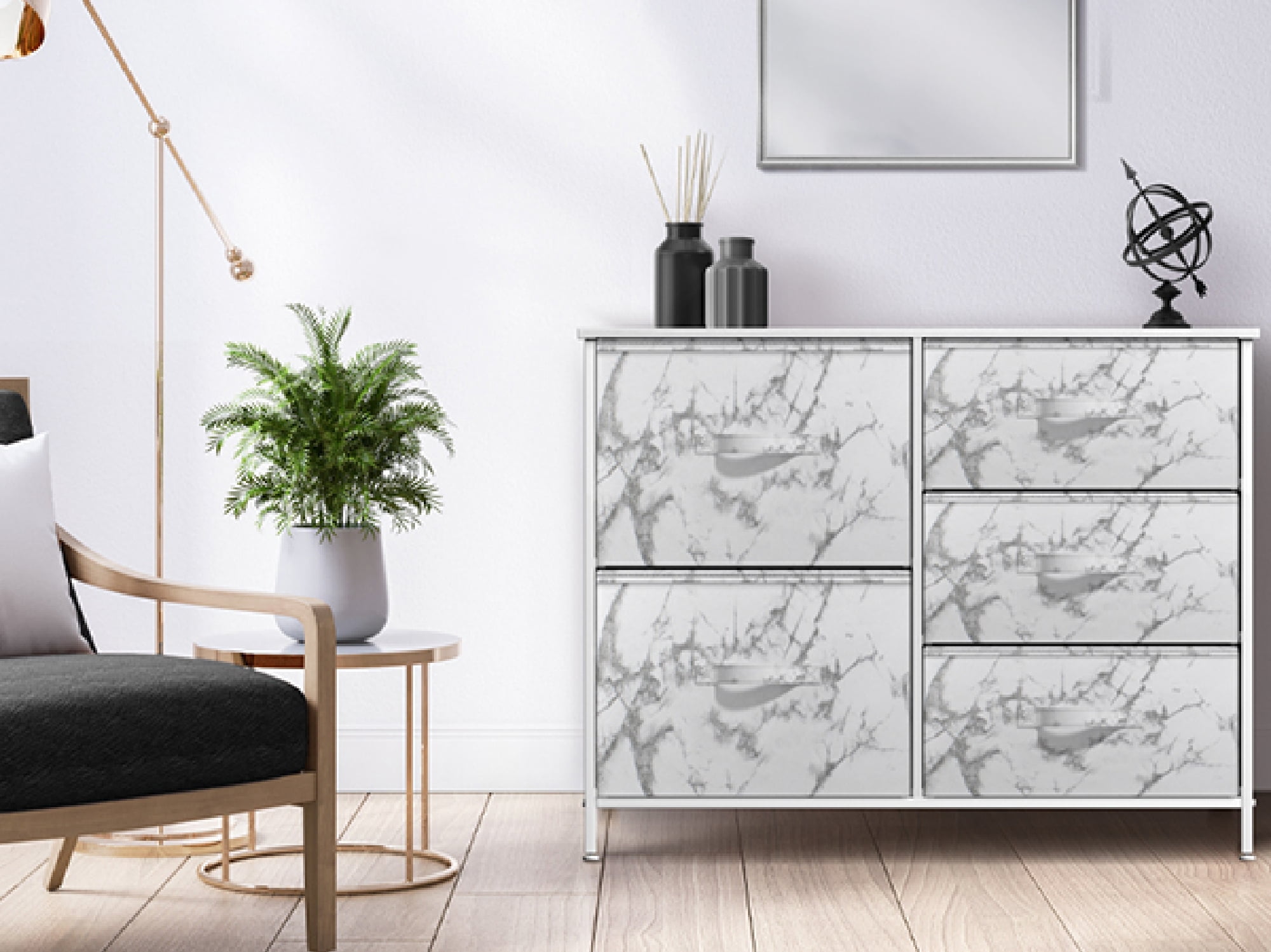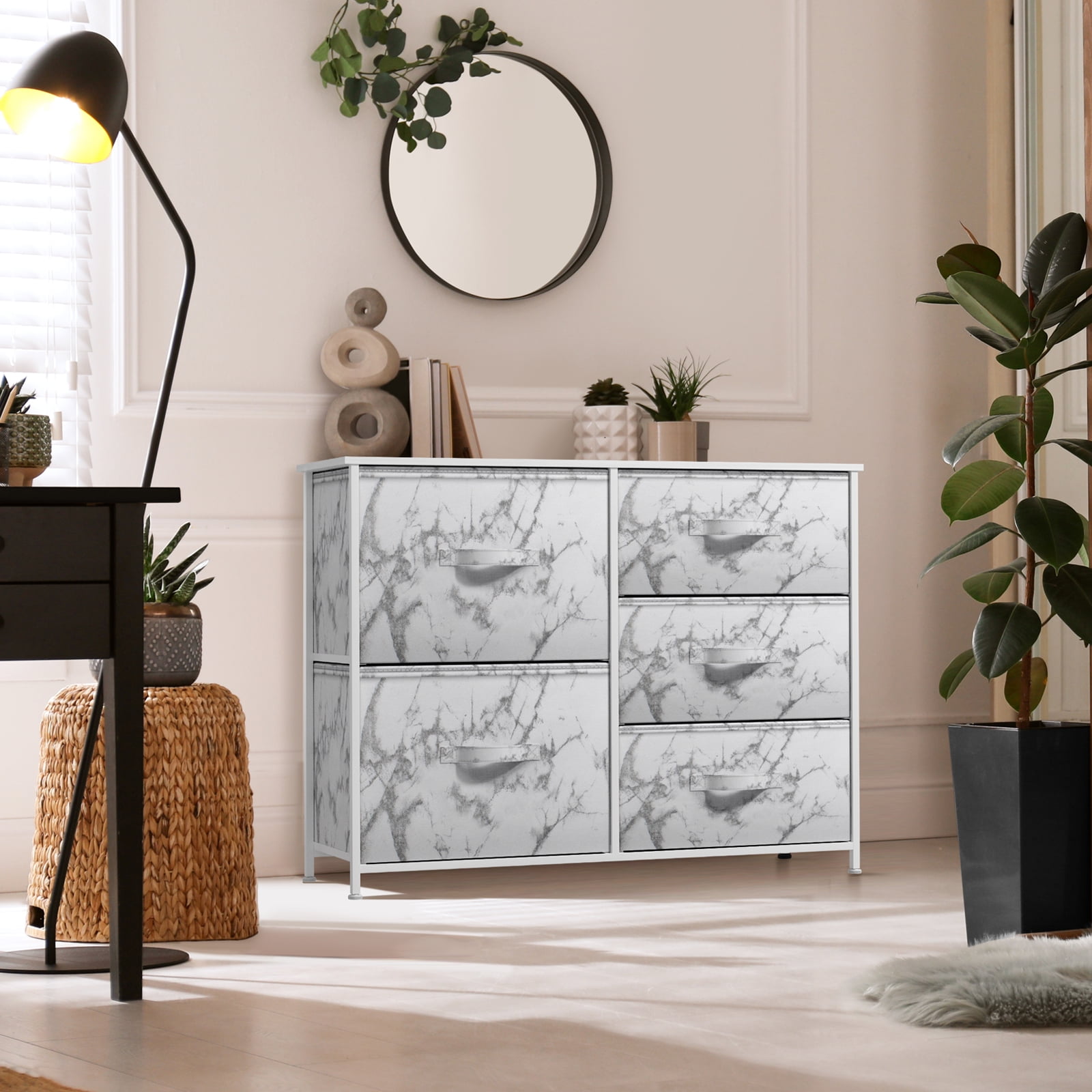 Create an organized and stylish space with the Sorbus 5-Drawer Dresser and TV Stand from the Marble Collection. With its black and gray marble inspired pattern, this dresser chest adds a touch of contemporary elegance to any room. The tabletop surface and deep pull-out drawers provide ample space for storing clothing, linens, and household clutter, while the lightweight frame makes it easy to move around and fold the non-woven fabric drawers flat for storage. Use it as a single unit or mix and match with other pieces from the Sorbus Furniture Collection. Features: 5-drawer dresser with built-in handles Lightweight and easy to assemble Deep drawers for maximum storage Sturdy steel frame and MDF wood top Marble inspired print adds a touch of elegance