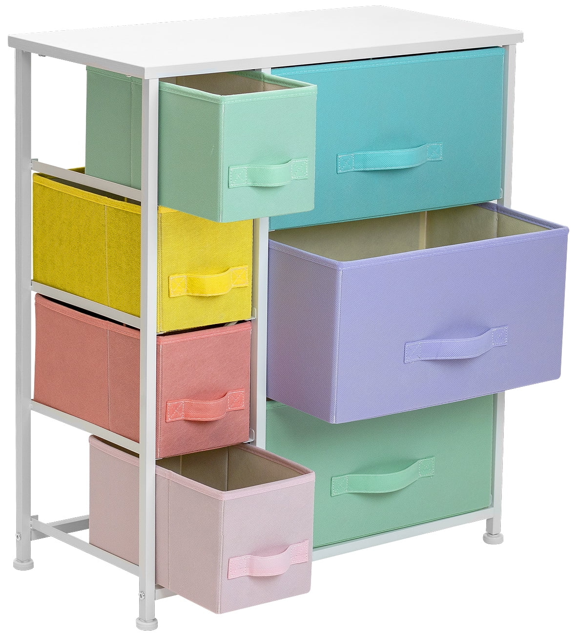 Versatile Use: Suitable for the nursery, playroom, kids’ room, tween/teen bedroom, guest room, closet, hallway, dorm, and small apartments. It can be used as a dresser, storage cube dresser, small closet dresser, storage chest, living room dresser, sofa end table, office supply storage, kids’ nightstand, or baby nursery table. Foldable Drawers: Soft fabric drawers with a reinforced base and easy pull handles for quiet opening and closing. The drawers are removable and fold flat for easy storage when not in use. The entire unit is portable, lightweight, and easy to relocate. Kid-Friendly Design: Made with a strong steel frame and durable MDF wood top with a smooth white finish. The breathable, non-woven fabric drawers come in pastel colors of teal, yellow, peach, pink, aqua, and purple. Easy to clean and requires minimal assembly, with hardware and instructions included. Measures approximately 25” L x 11.87” W x 28.75” H.