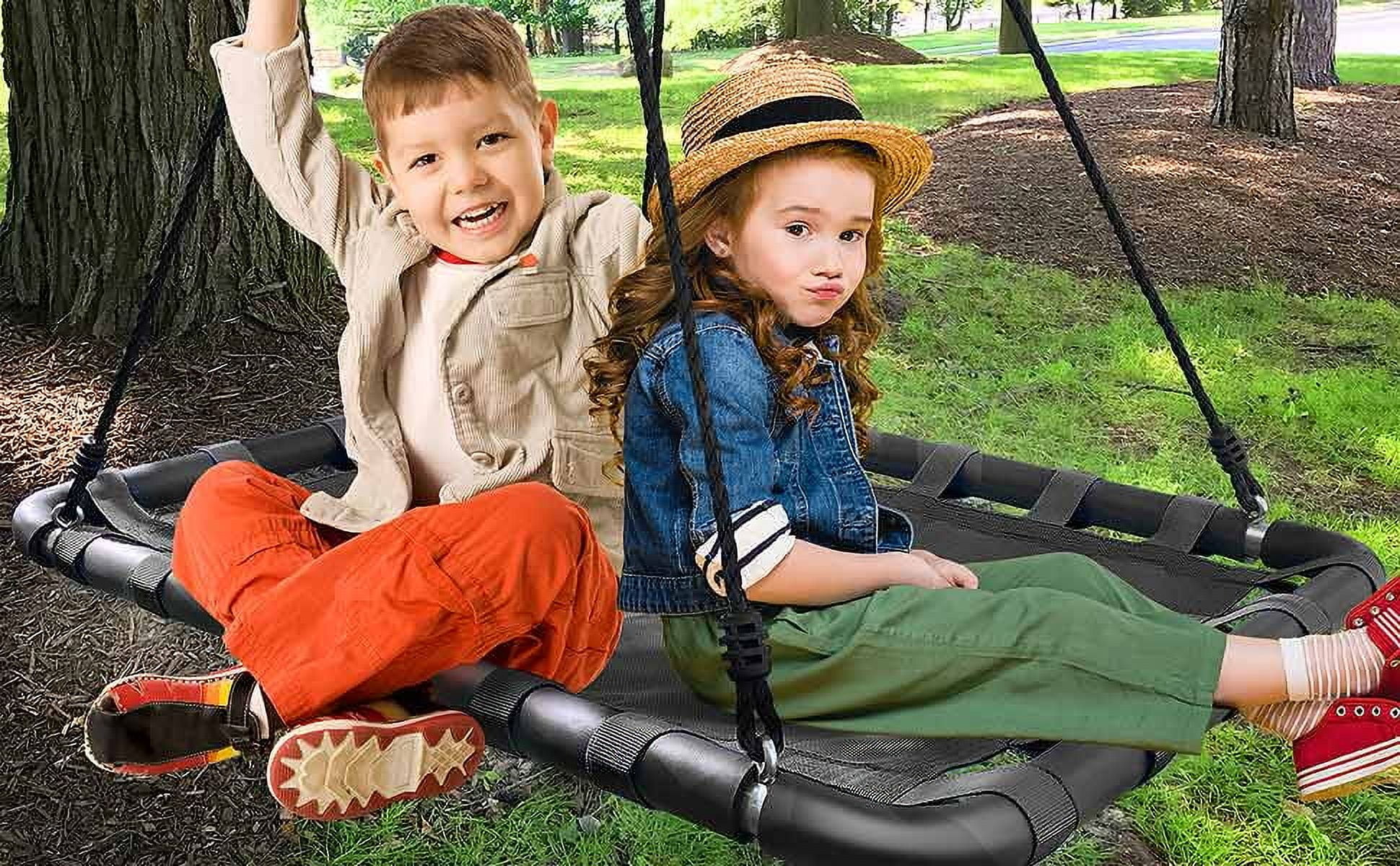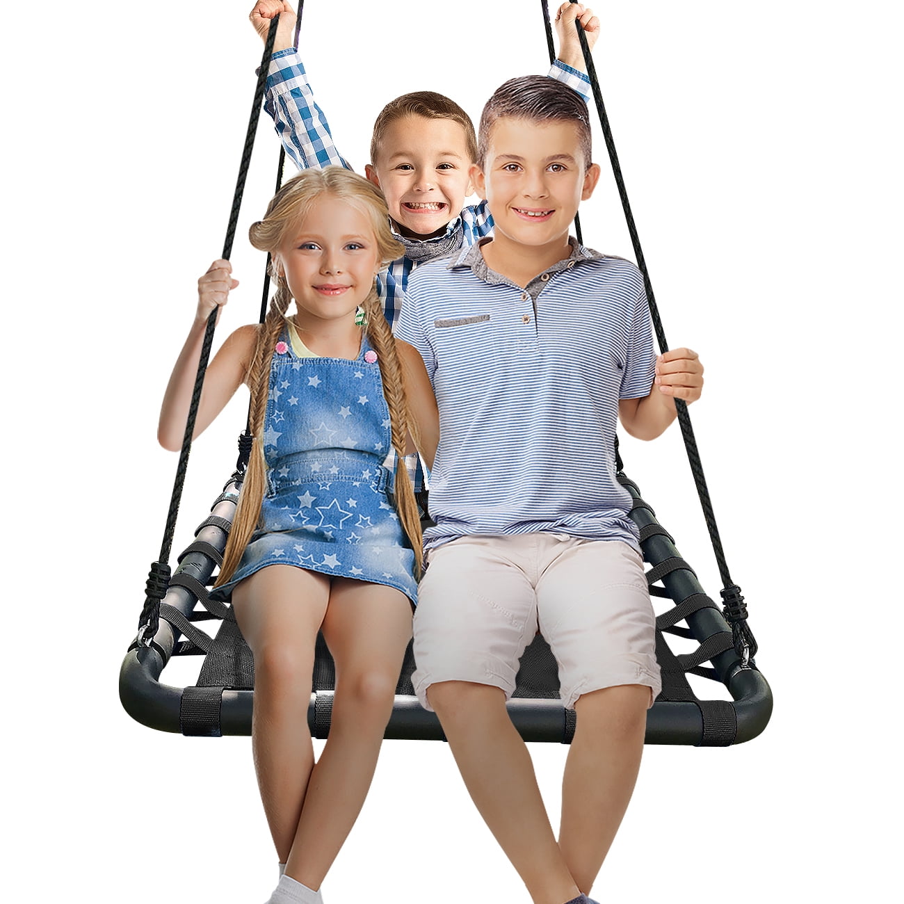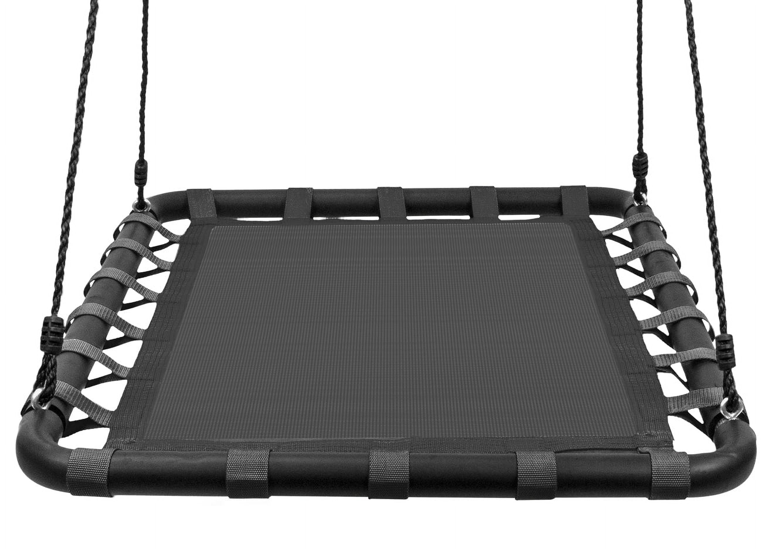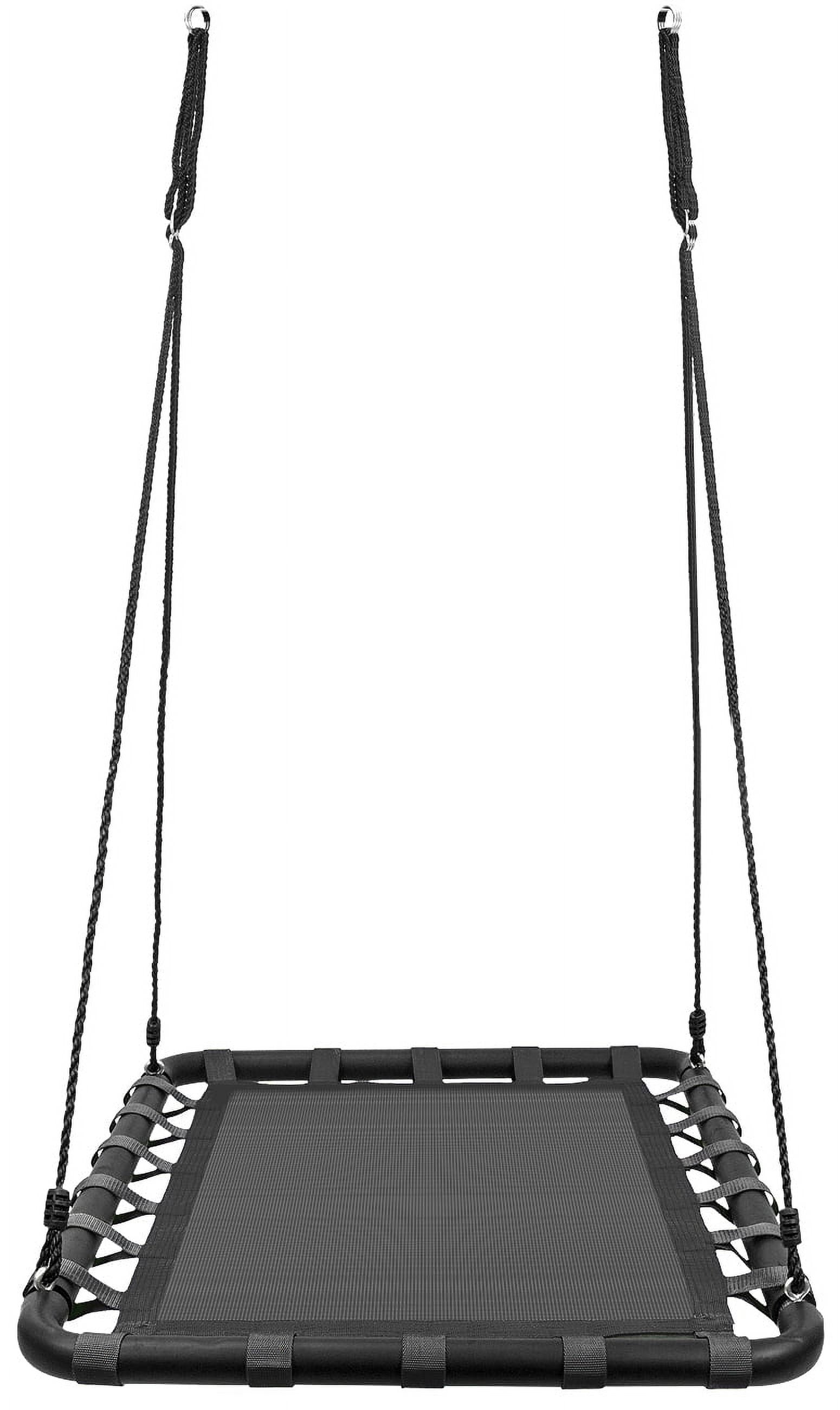 Platform Mat Swing (Black) — Provides a fun hangout spot for children (and adults) to safely swing into action for playtime or relaxation — Fits 2-3 children For Indoor/Outdoor Fun — Great for backyards, playgrounds, indoor play areas, etc. — Weather resistant — Can be used as a chair swing for a tree, hammock swing for a swing set, nest swing chair, or swings for playsets — Encourages balance and supports sensory needs Comfy Hanging Seat — Mat seat provides a super comfy and sturdy ride — Holds up to 220 lbs. for a safe riding experience Quick & Easy Assembly — Hangs from 2 points for swinging — Top of ropes have steel rings which connect to sturdy suspension rope up to approximately 68” long from base to connection point — Designed for secure installation Sturdy Design & Padded Frame — Rectangular mesh seat made of heavy-duty polypropene — Steel tube frame padded with NBR foam for support — Package includes mat swing, mounting accessories, and instructions — Adult supervision and assembly required — Recommended for children 3+ years. Measures approximately 40″(L) x 30″(W) x 68″(H) and 1.6″(Thick). Maximum tilt is 45°