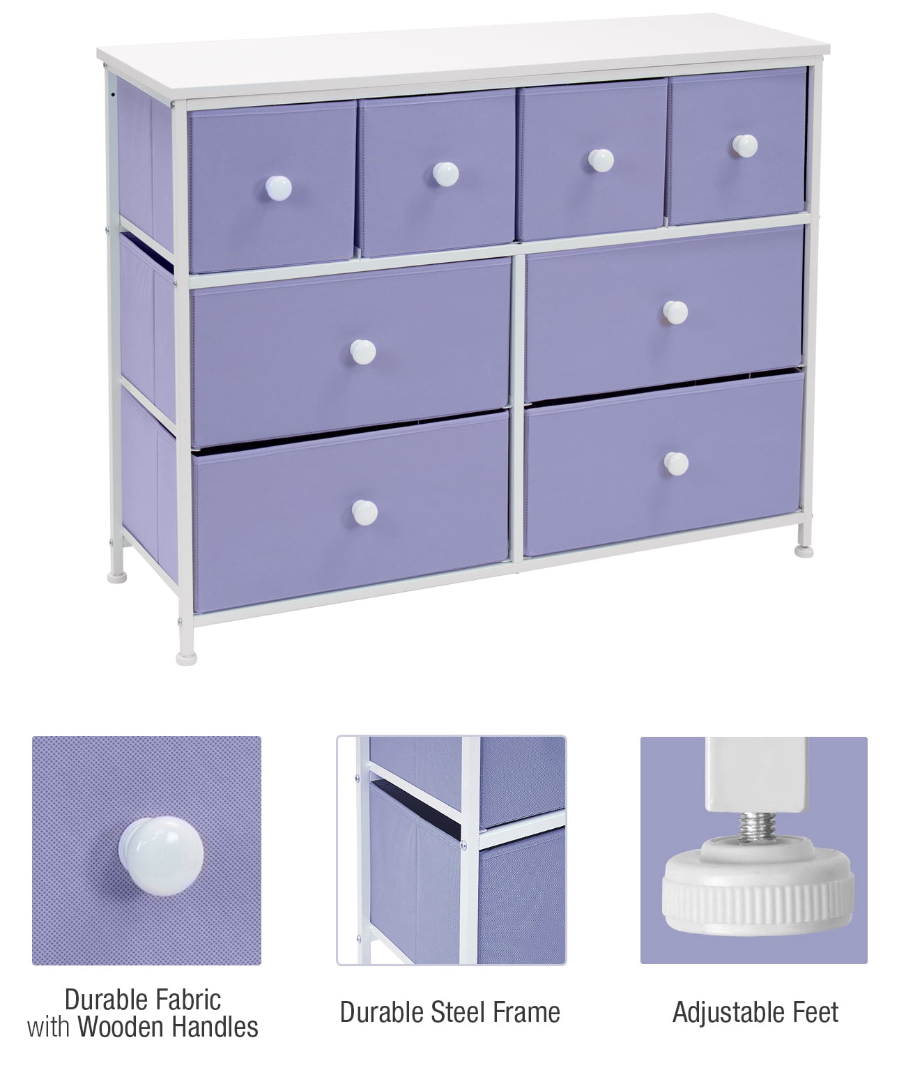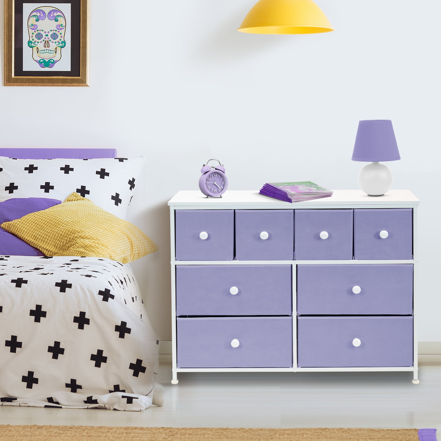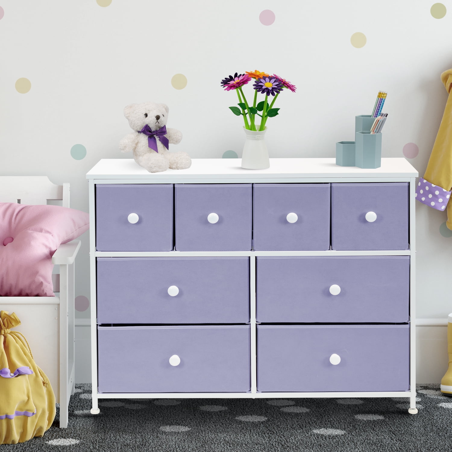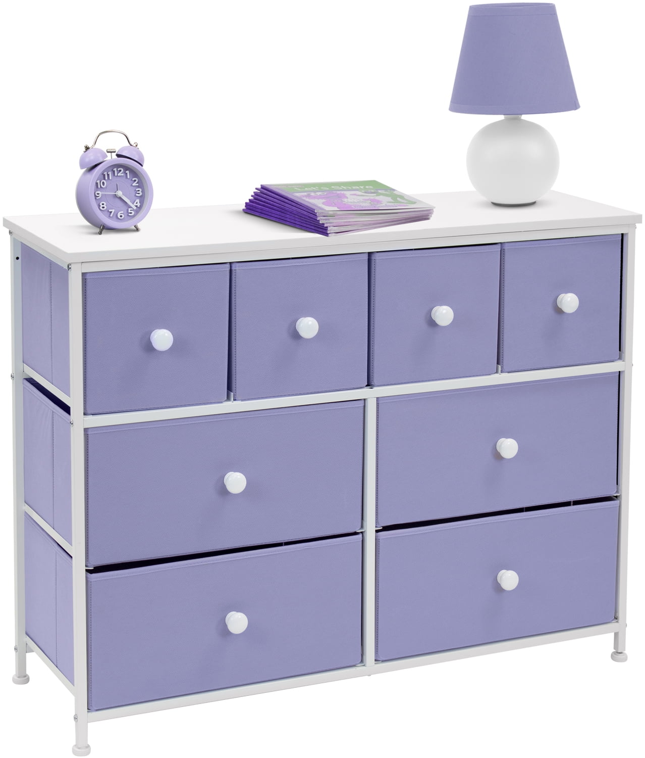 Tuck away your essentials in the Sorbus 8-Drawer Dresser! Sleek and minimal, this furniture piece features a faux wood top surface and strong steel frame. Each drawer pulls out to reveal all your clothing, linens, and more. Place anywhere from your bedroom, office, or college dorm to get organized in style. The lightweight frame makes this unit easy to transport and when not in use, simply fold the fabric drawers flat for storage. Use alone or pair with similar styles from the Sorbus Furniture Collection. Great for any room. Add this charming dresser to your primary bedroom for storage or spare room filled with blankets and towels for guests. Set a framed photo or potted plant on its tabletop surface for that final touch. Place in any walk-in closet to organize your wardrobe and accessories. Use in a college dorm or use in the nursery and playroom for toys, clothing, and baby products Kid-friendly design. 8-drawer dresser (purple). Lightweight and easy to assemble. Hardware and instructions INCLUDED. Drawers made of non-woven (polyester) fabric. Frame made of steel and MDF wood finish. Accessories shown in image NOT INCLUDED. Measures approximately 39.37″ L x 11.81″ W x 30.7″ H.
