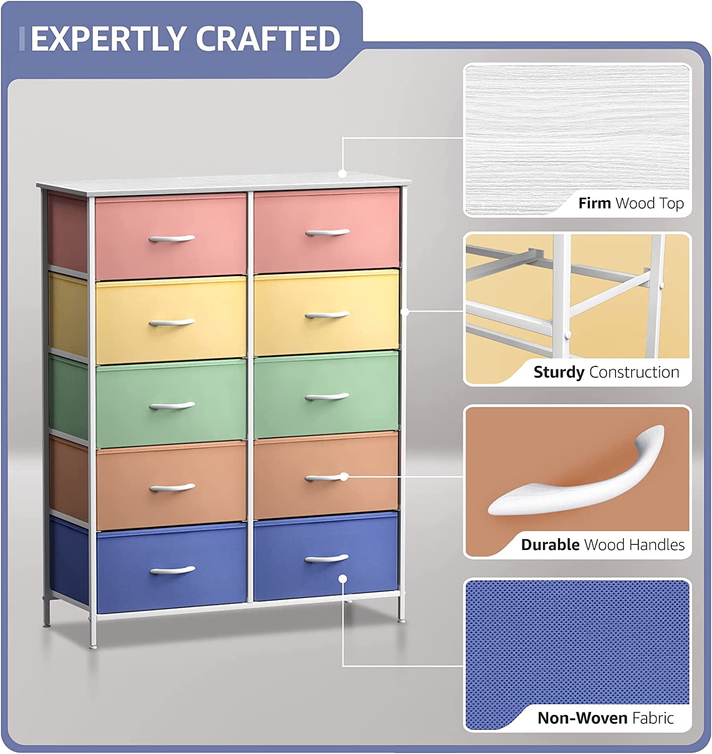 Easy Assembly — No tools necessary! Put this dresser together in minutes so you can begin organizing straight away Sturdy Design — The sturdy and durable steel frame offers stable support for your belongings – This dresser is perfect for storing light items such as socks and underwear as well as heavier items including jeans and jackets Lightweight & Portable — Due to its lightweight design, the Sorbus 10-drawer dresser is portable and easily moved from room to room Great for Kids — The colorful fabric drawers give this lightweight dresser a bright and fun design that is perfect for a kids’ room or nursery Product Details — Measures approximately 34 x 11.8 x 47.2” Bins measure approximately 15.4 x 11.2 x 8.7 ”
