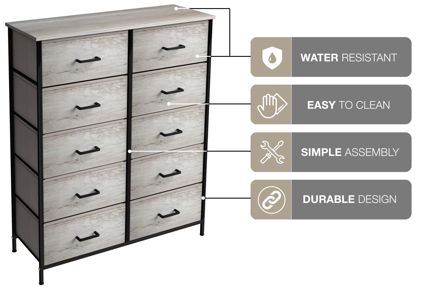 Keep your household clutter neatly tucked away in the Sorbus Portable & Tall 10-Drawer Fabric Dresser for Clothes. The lightweight design allows for effortless transport and reorganization. This chest of drawers features removable fabric drawer shelves that are great for storing clothing, toys, accessories, and any other items that are making a mess. Place this Sorbus dresser in a closet, next to your bed, use it as a tv stand, or add storage to a home office; the opportunities for organization are endless. When not in use, the fabric drawers can fold flat. For added convenience, these drawers wipe clean. This dresser is the perfect blend of rustic and modern design, featuring faux wooden fabric cubbies and contemporary black accessories. Getting organized has never looked better!