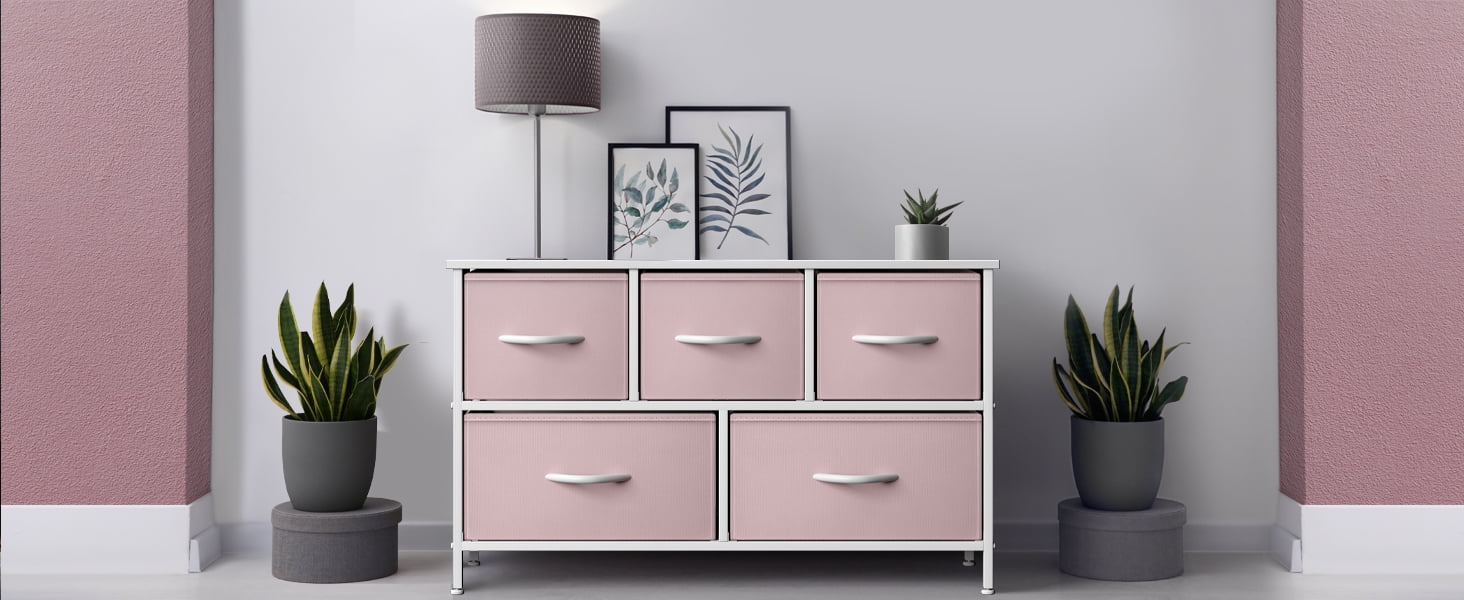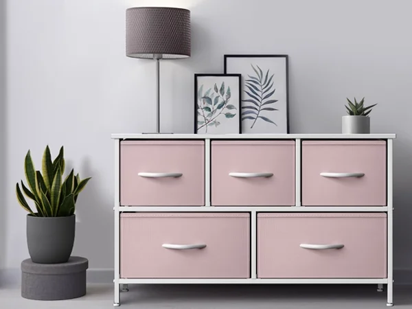 5-DRAWER DRESSER — Style meets function with this dresser chest, complete with a wood surface and colorful storage drawers — Pairs beautifully with the Sorbus Foldable Furniture Collection DISPLAY & DE-CLUTTER — Wood top provides hard surface for displaying books, lamps, alarm clocks, electronics, and more — Drawers great for storing baby and kid clothes, blankets, linens, toys, plushies, accessories, knitting supplies, and household clutter KID FRIENDLY DESIGN Sleek wide storage Made with strong steel frame and durable MDF wood top with smooth white finish Pastel color fabric drawers made of non-woven fabric Wipe clean Minimal assembly required Hardware and instructions INCLUDED Measures approximately 39.50″ L x 11.87″ W x 24.62″ H