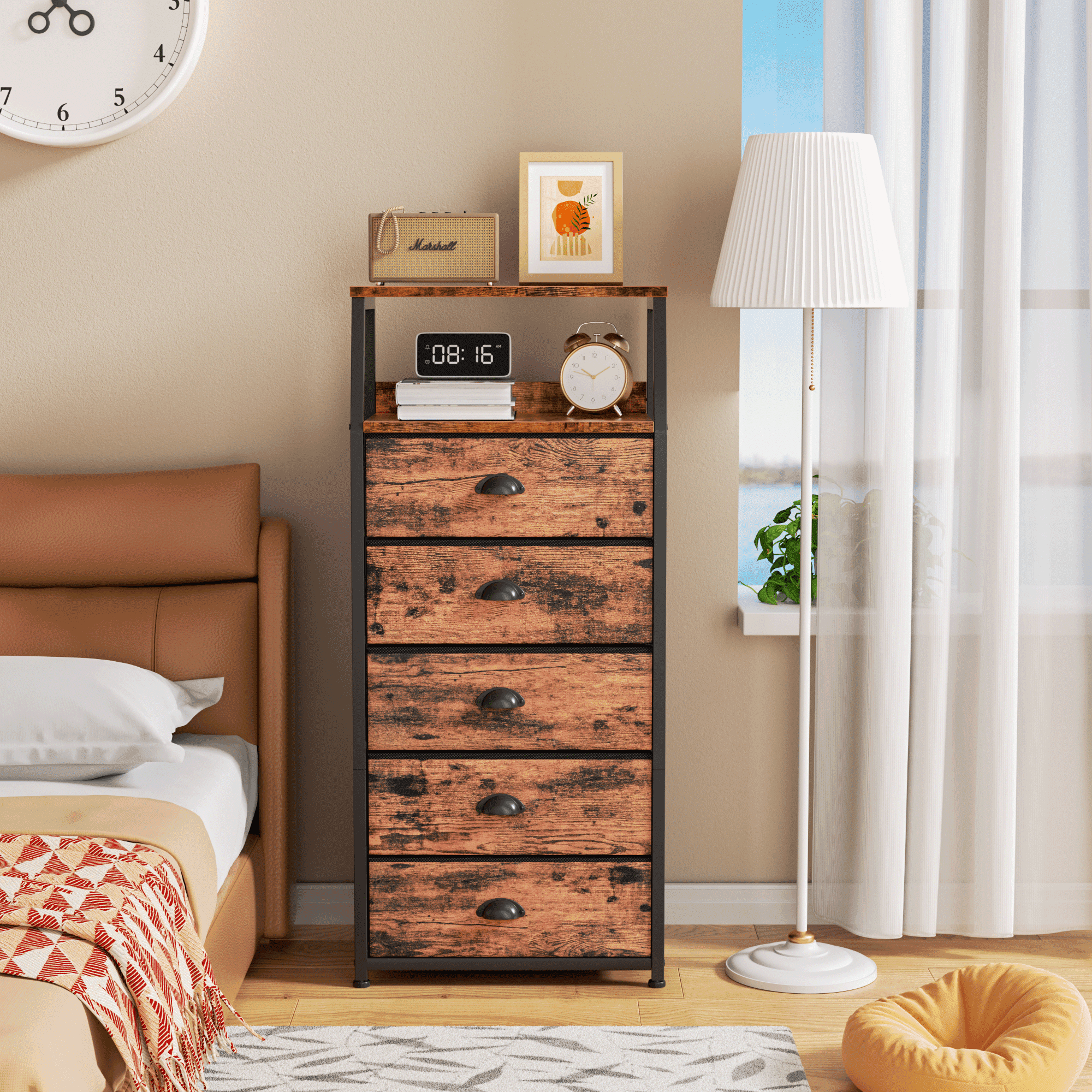Give your bedside essentials a cozy landing spot with the Sorbus 5-Drawer Dresser. This beautiful chest features a rustic tabletop surface and pull-out drawers to tuck away household clutter. The thoughtful design is compact for small living spaces and works equally well by the bed or sofa. Store anything from books, reading glasses, alarm clocks, and other bedside necessities. The lightweight frame makes this unit easy to transport around the home and when not in use, simply fold the fabric drawers flat for storage. Use alone as a single nightstand or pair with any drawer configuration from the Sorbus Furniture Collection. Versatile furniture for any room. Add this charming nightstand to your bedroom for blankets and towels while displaying fresh flowers and photo frames on the tabletop. Place in any walk-in closet to organize your already stylish wardrobe and accessories. In the nursery, this dresser keeps baby products, toys, and storybooks organized and within reach.