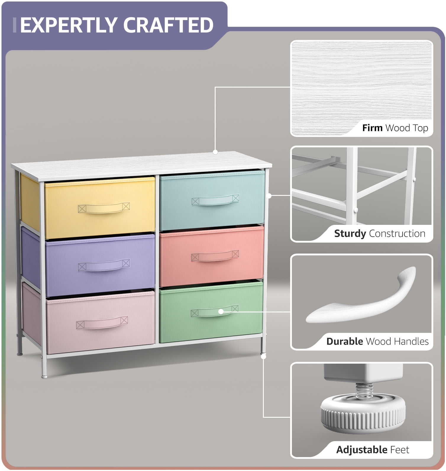 6-DRAWER DRESSER— Style meets function with our dresser chest, complete with a wood surface and storage drawers — Pairs beautifully with the Sorbus Foldable Furniture Collection DISPLAY & DE-CLUTTER — Wood top provides hard surface for displaying lamps, alarm clocks, books, eyeglasses, charging station, and more — Drawers great for storing clothes, blankets, linens, baby clothes, lingerie, purses, scarves, socks, accessories, gadgets, toiletries, cosmetics, hair/beauty products, paperwork, toys, knitting supplies, and household clutter SMART & STYLISH DESIGN — Marble inspired print — Made with strong steel frame and durable MDF wood top with smooth finish — Drawers made of breathable, non-woven fabric — Wipe clean — Minimal assembly required — Hardware and instructions INCLUDED — Measures approximately 31.50” L x 11.75” W x 24.62” H