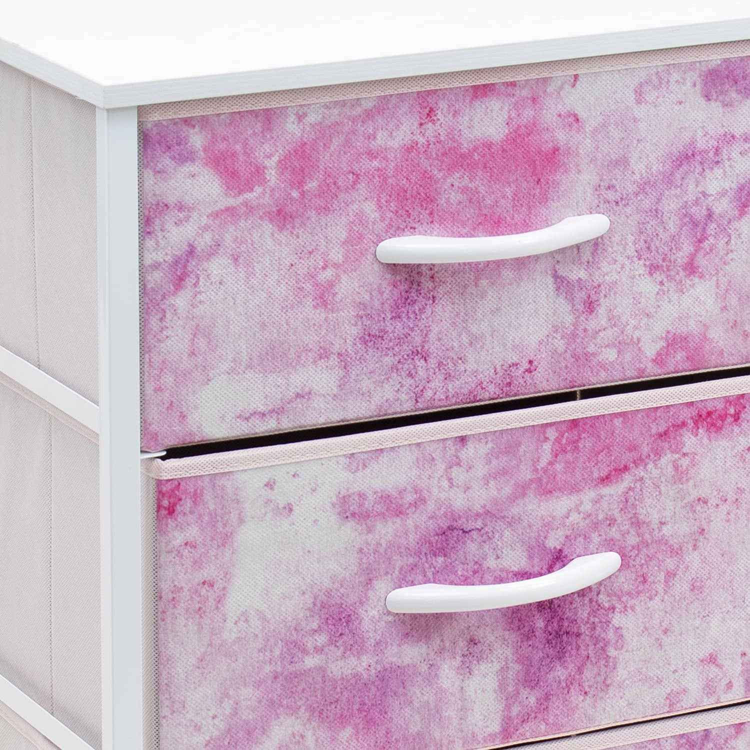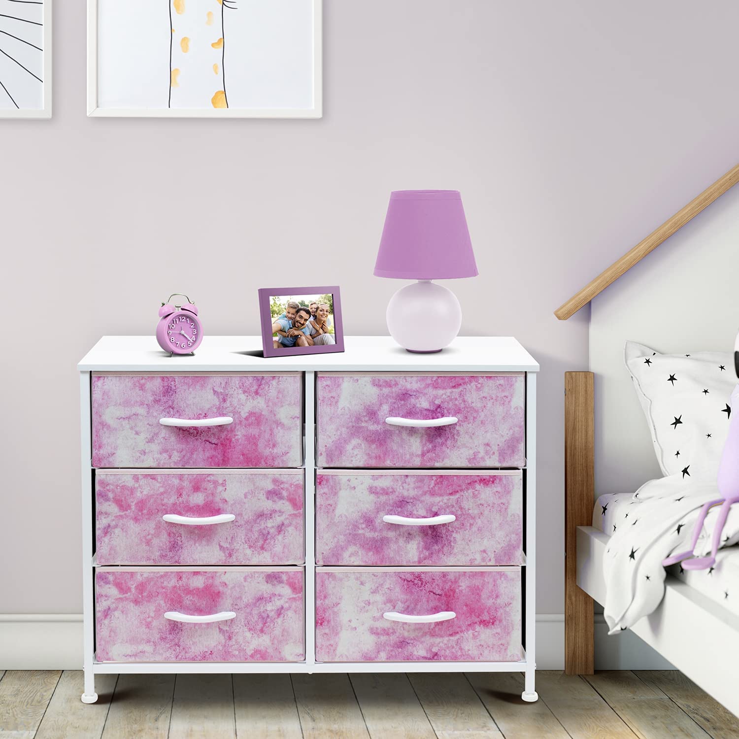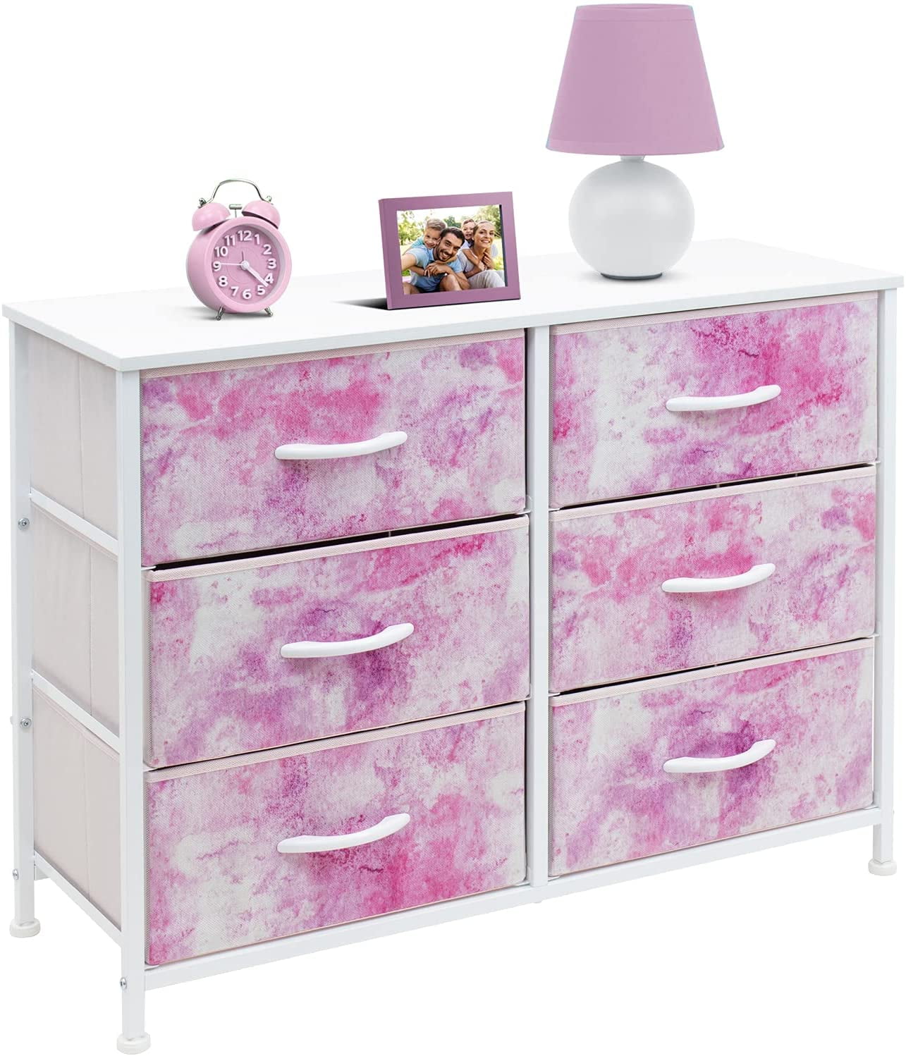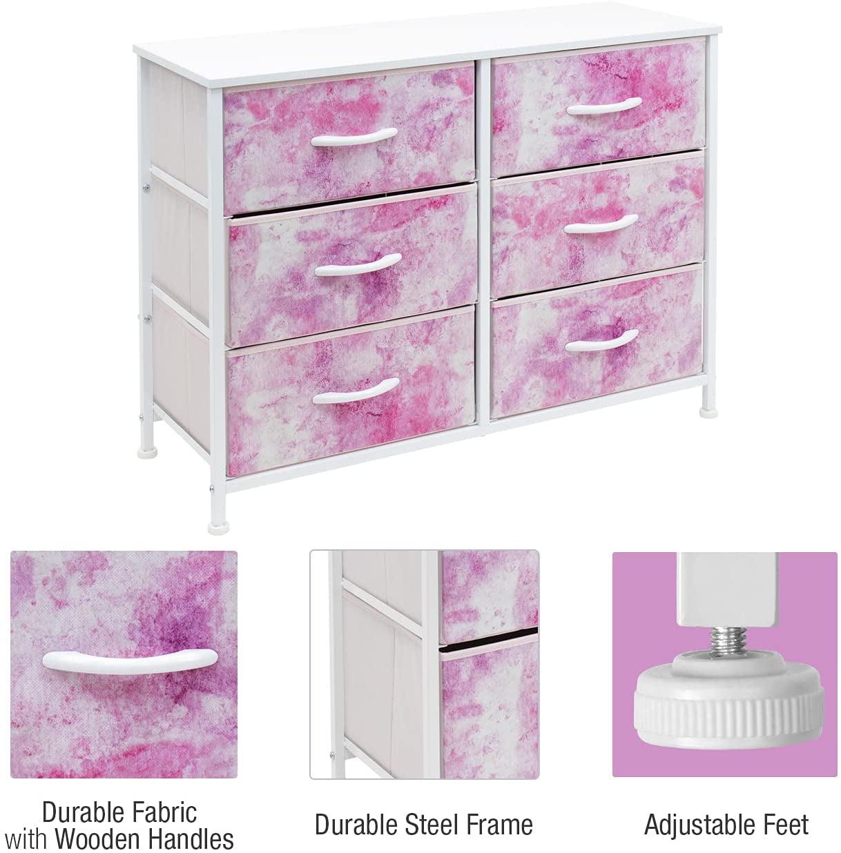 Update your child’s room with the Sorbus 6-Drawer Dresser. This colorful dresser chest features a tabletop surface and pull-out drawers to tuck away household clutter. Place all of your child’s folded t-shirts, jeans, and pajamas, or extra blankets and toys within the spacious fabric drawers. For display, the top surface can be used for lamps, books, clocks, and more. The playful tie-dye color combo makes this furniture storage charming for any nursery, playroom, or bedroom. It is lightweight for easy transport and when not in use, simply fold the fabric drawers flat for storage. Complete the look with any drawer configuration from the Sorbus Furniture Collection. Great addition to any room. Bring on the toys and blankets! Display this charming dresser in the kid’s bedroom filled with linens and clothes or play area complete with coloring books, Legos, plushies, and dolls! The soft lightweight fabric makes it easy for kids to pull out their favorite toys for play dates or easily put them away. In the nursery, this chest brightens up your little one’s sleeping space for stylish baby storage. With kids and teens in mind, it complements pastel rainbow décor, unicorn themes, and trendy ombré colors for a fun look. Trendy design with easy assembly. 6-drawer dresser (Pink). Lightweight and easy to assemble. Hardware and instructions INCLUDED. Drawers made of non-woven (polyester) fabric. Frame made of steel and MDF wood with white finish. Accessories shown in image NOT INCLUDED. Measures approximately 31.50” L x 11.75” W x 24.62” H.