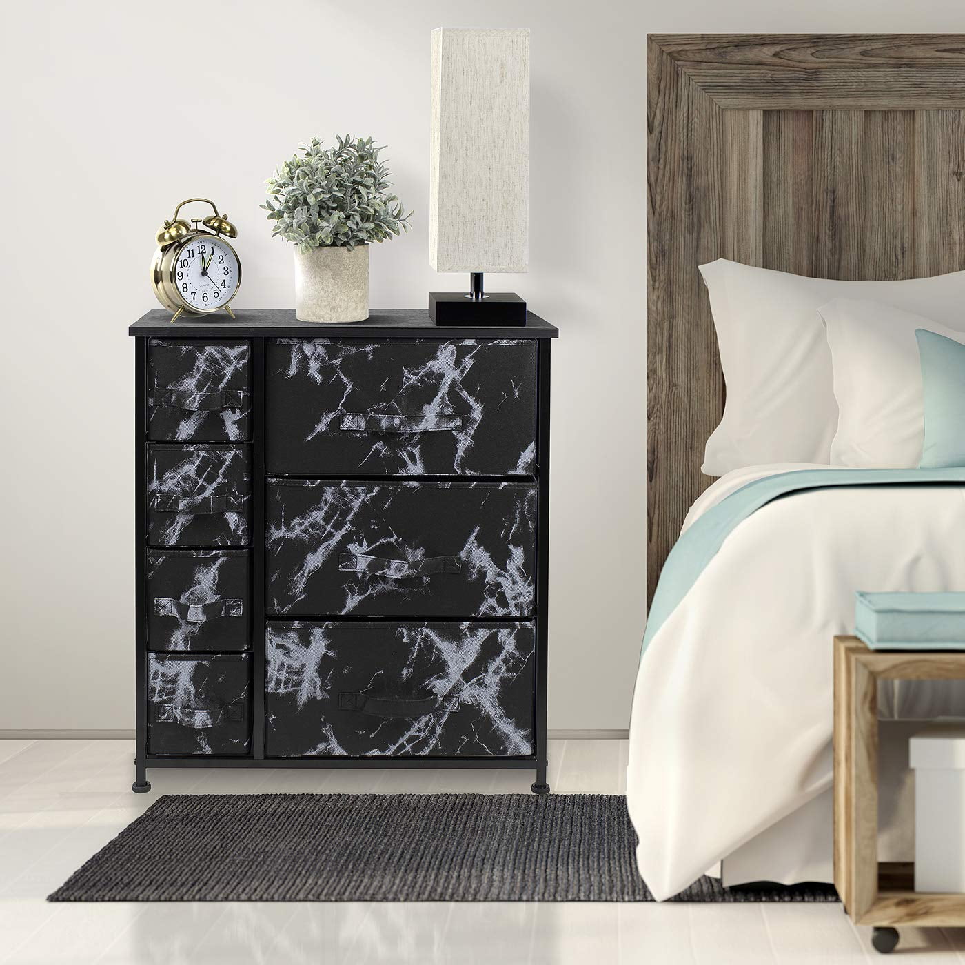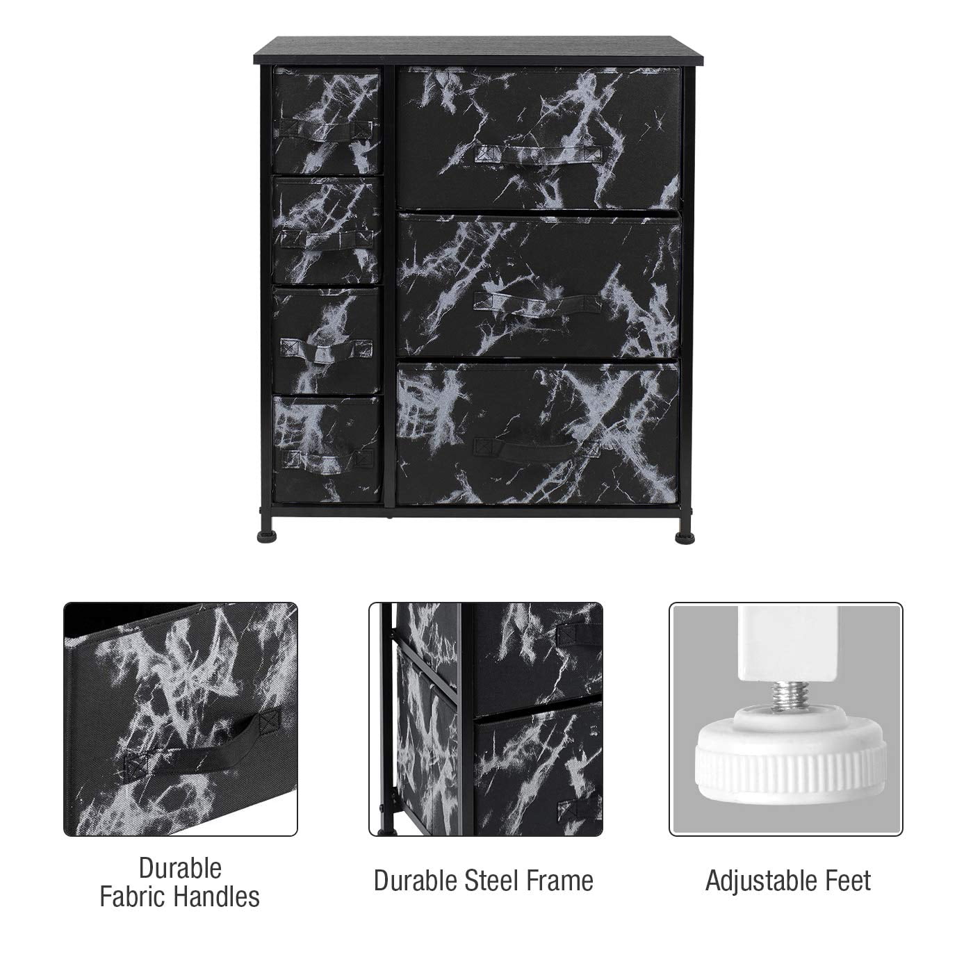 7-DRAWER DRESSER (Black- Black Marble) Style meets function with this dresser chest, complete with a wood surface and colorful storage drawers Pairs beautifully with the Sorbus Foldable Furniture Collection DISPLAY & DE-CLUTTER Wood top provides hard surface for displaying books, lamps, alarm clocks, electronics, and more Drawers great for storing baby and kid clothes, blankets, linens, toys, plushies, accessories, knitting supplies, and household clutter KID FRIENDLY DESIGN Sleek wide storage Made with strong steel frame and durable MDF wood top with smooth white finish Drawers made of breathable, non-woven fabric Pastel colors in teal, yellow, peach, pink, aqua, purple Wipe clean Minimal assembly required Hardware and instructions INCLUDED