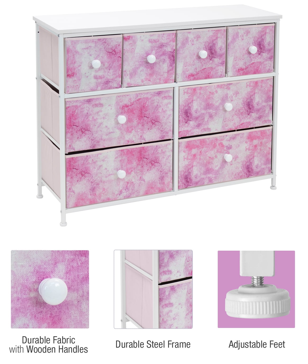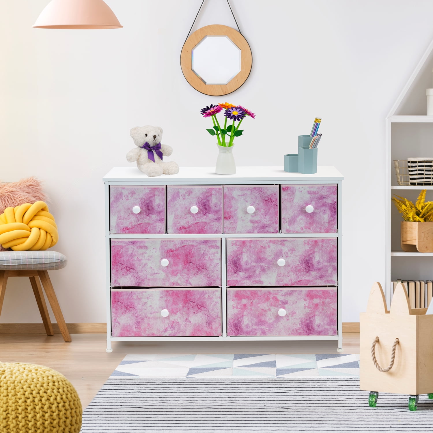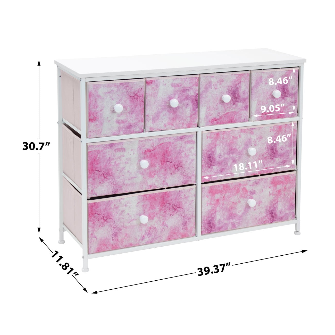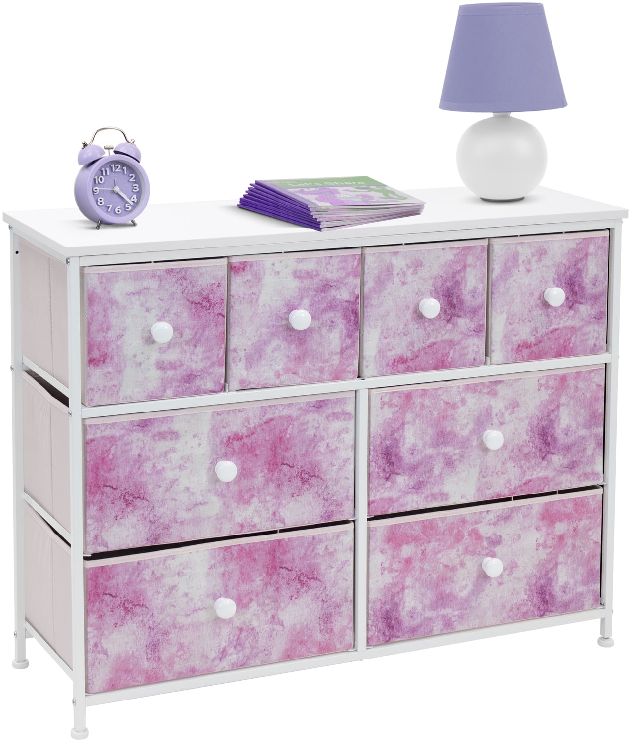 Tuck away your essentials in the Sorbus 8-Drawer Dresser! Sleek and minimal, this furniture piece features a faux wood top surface and strong steel frame. Each drawer pulls out to reveal all your clothing, linens, and more. Place anywhere from your bedroom, office, or college dorm to get organized in style. The lightweight frame makes this unit easy to transport and when not in use, simply fold the fabric drawers flat for storage. Use alone or pair with similar styles from the Sorbus Furniture Collection. Great for any room. Add this charming dresser to your primary bedroom for storage or spare room filled with blankets and towels for guests. Set a framed photo or potted plant on its tabletop surface for that final touch. Place in any walk-in closet to organize your wardrobe and accessories. Use in a college dorm or use in the nursery and playroom for toys, clothing, and baby products About the design: 8-drawer dresser (tie-dye pink). Lightweight and easy to assemble. Hardware and instructions INCLUDED. Drawers made of non-woven (polyester) fabric. Frame made of steel and MDF wood with white finish. Accessories shown in image NOT INCLUDED. Measures approx 39.37″ L x 11.81″ W x 30.7″ H.