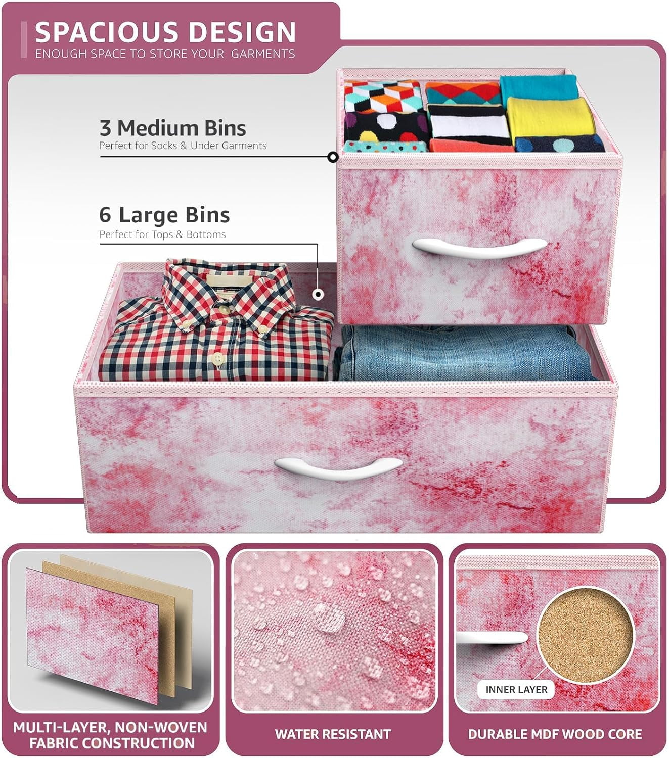 Pull Handles: Wood handles for easy opening/closing and transporting drawer bins. Deep Storage: Great for concealing clothes, blankets, linens, toys, and household items. Sturdy Design: Made with a steel frame, durable MDF wood top, and stable feet for support. Trendy design with easy assembly. 9-drawer dresser (Tie-dye Pink). Lightweight and easy to assemble. Hardware and instructions are included. Drawers are made of non-woven (polyester) fabric. Frame made of steel and MDF wood with a white finish. The accessories shown in the image are not included. Measures approximately 39.5″ L x 11.5″ W x 39.5″ H.