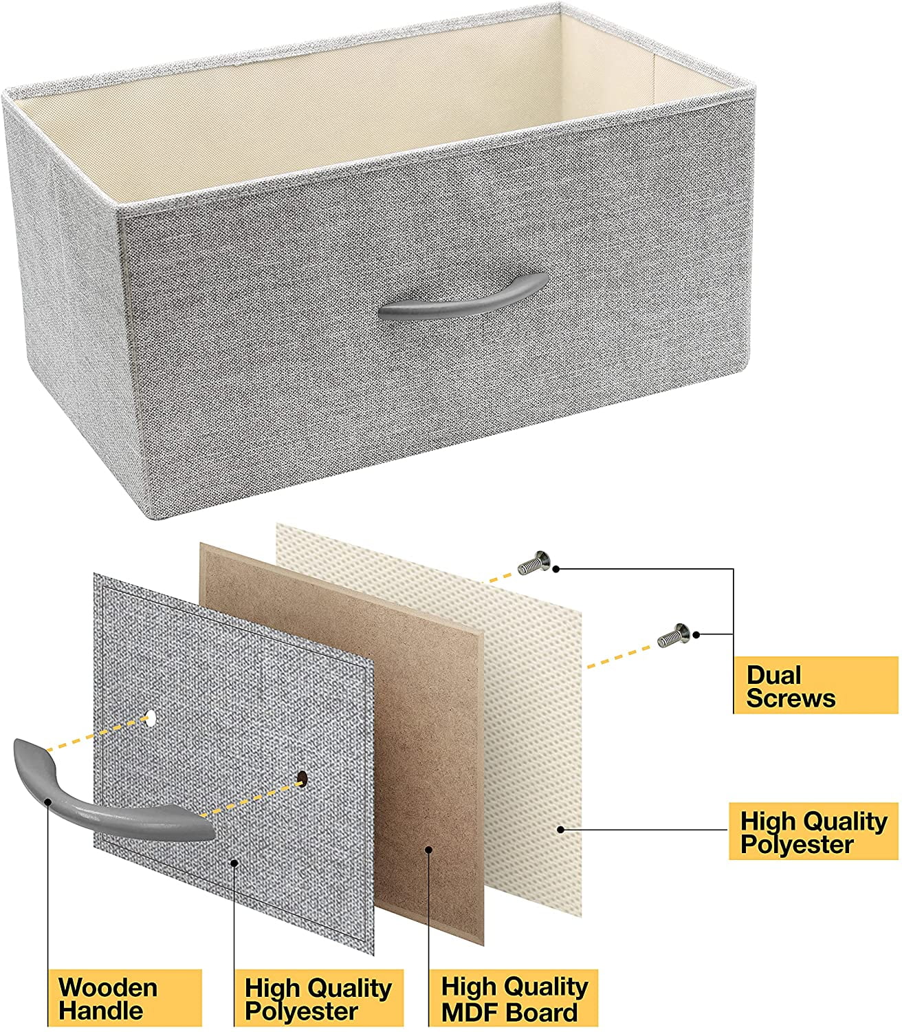 Deep Storage: Great for concealing clothes, toys, and more. Drawers fold flat for storage. Pull Handle: Wood handles for easy opening/closing and transporting drawer bins. Sturdy Design: Made with a steel frame, durable MDF wood top, and stable feet for support. Measures approximately 17.75″ L x 11.87″ W x 46″ H.