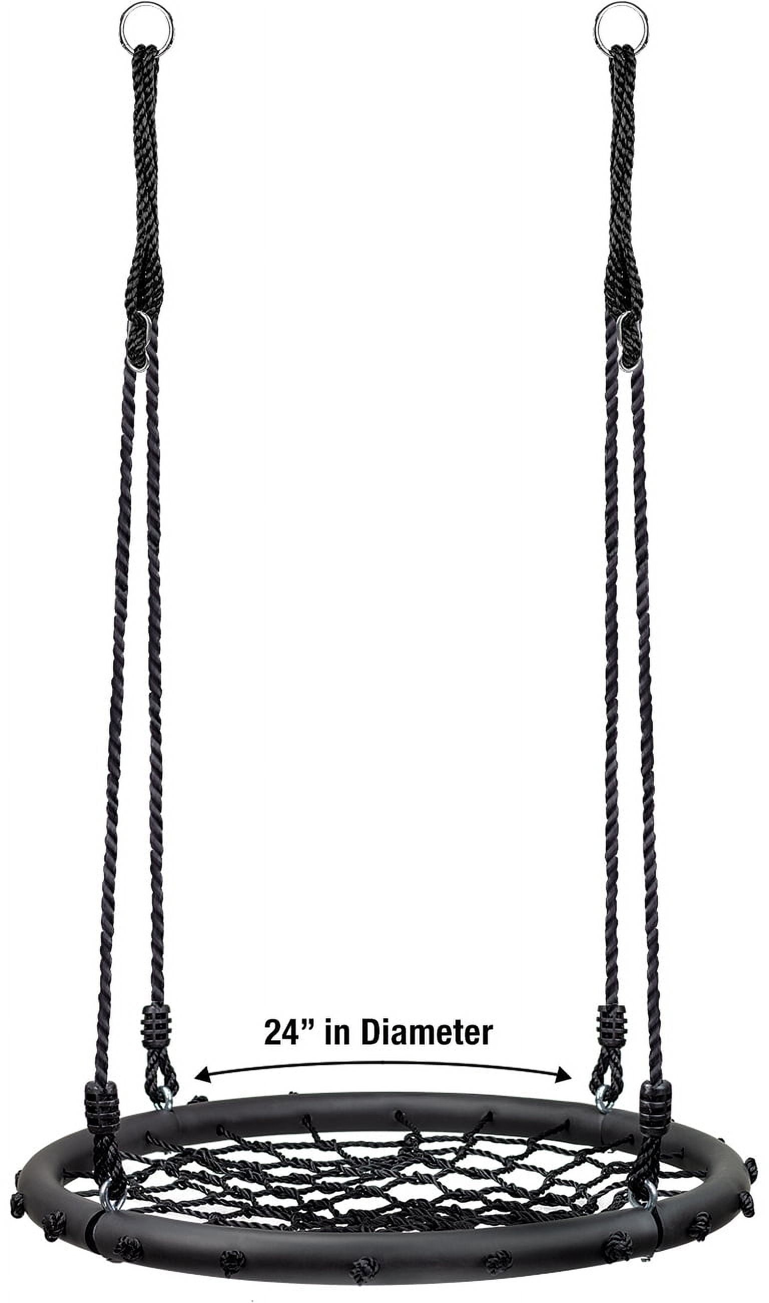 ADORABLE KID’S SPINNER SWING (24″ NET SEAT) – Provides a fun hang out space for kids to safely spin or swing into action during playtime GREAT FOR OUTDOOR PLAY – Can be used as chair swing for tree, hammock swing for swingset, nest swing chair, swings for playsets, and more to encourage imaginative play and promote balance – Creates the perfect lounging space to play, read, listen to music, daydream, relax, nestle into a cocoon, bounce, twist, spin, and enjoy playtime with friends and family – Perfect gift for kids, grandchildren, playmates, birthday, Christmas, outdoor picnic, BBQ, party COMFY HANGING SEAT – Rope seat cushion provides super comfy ride – 1 person swing kids will enjoy comfortably – Holds up to 220lbs for safe riding experience – Provides superior strength while keeping swing in place EASY TO INSTALL – Hang within minutes! Quick and easy assembly saves time and hassle – Designed for secure installation – Top of ropes have steel rings which connect to sturdy suspension rope up to approx. 63” long from base to connection point – Hangs almost anywhere from a sturdy tree branch to swing set – Can be re-located or taken down for easy storage DESIGN SPECIFICATIONS – Heavy-duty spider web design features tough rope net seat with thick woven nylon material (Rope seat is:5mm PE ), frame for kids swing is steel tube – Package includes swing, mounting accessories, and instructions – Adult supervision and assembly required – Recommended for children 5+ years – Fun for adults too! – Maximum Weight is 220 pounds – Maximum Tilt is 45° – Measures approximately 24” D x 63” H