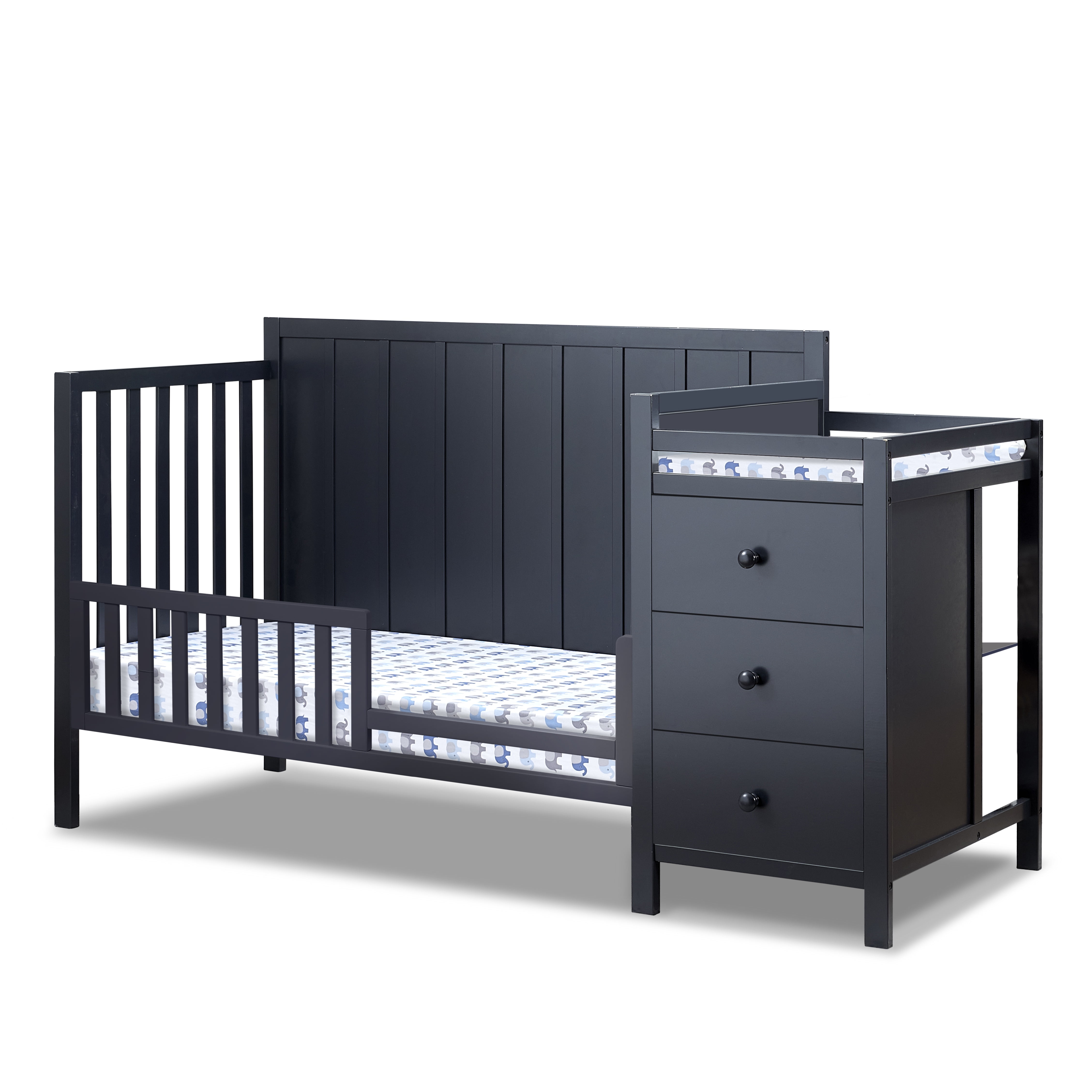 3 large storage draws with changer storage shelve on side of changer Convert to toddler bed Convert to full size bed