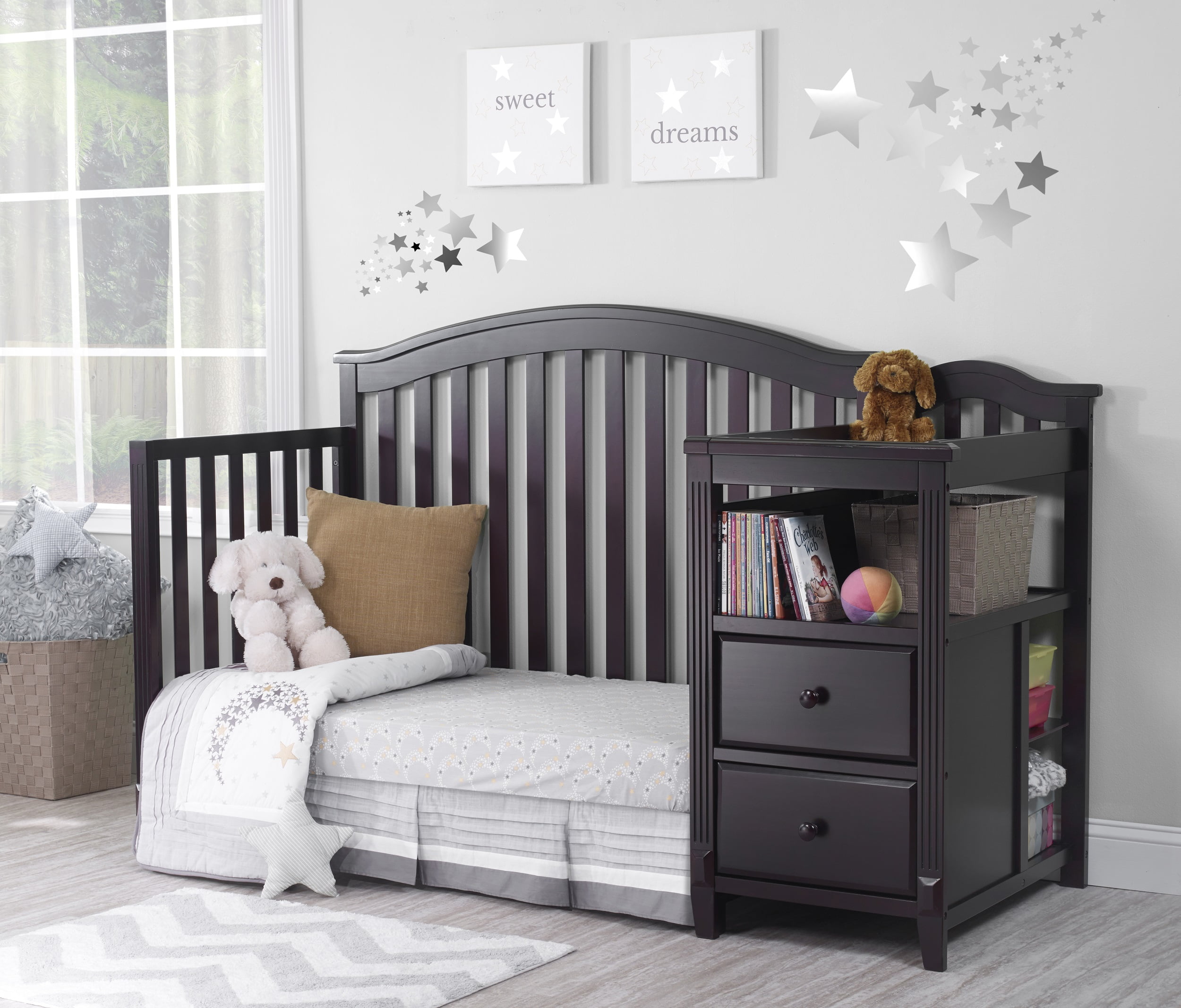 Built-in compartment and 2 storage drawers to stow away extra diapers, wipes, and clothes for baby Made without lead, phthalates, or formaldehyde Meets or exceeds all U.S. consumer product safety commission standards and conforms to ASTM standards to achieve JPMA certification The crib and changer convert into a toddler bed, daybed, and finally a full-size bed The toddler and adult rails are not included Sorelle Berkley crib and changer has a classic style with fluting and gently curved front and back panels Available color options: Espresso, gray, white