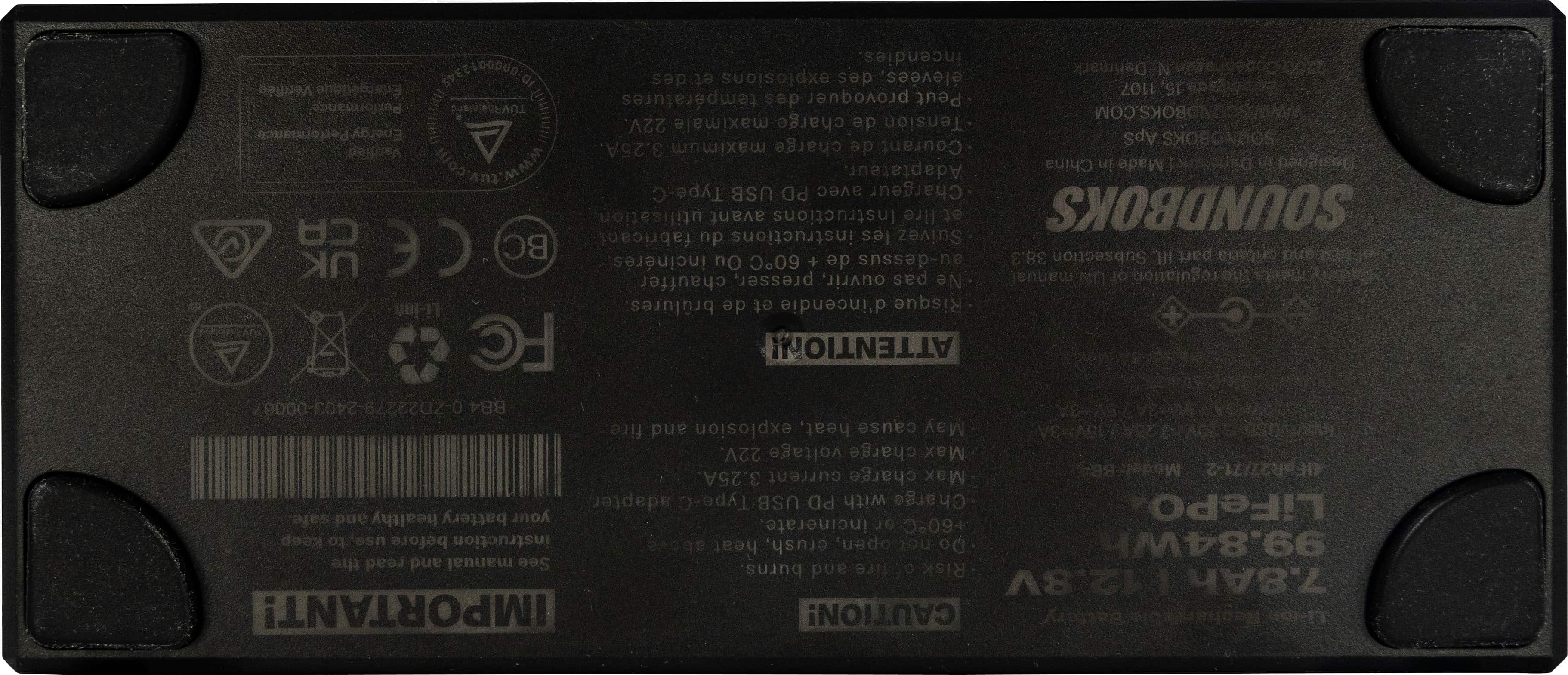 It only takes 2 hours to fully charge your battery from the official SOUNDBOKS charger or any 65W USB-C PD compliant power supply. (Does not come with charger)