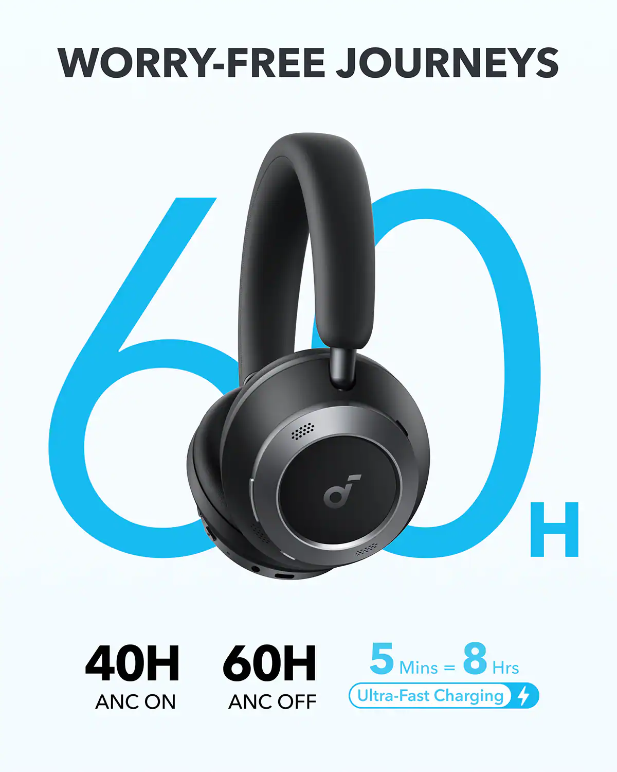 Enjoy audio that lasts for days, with ultra-fast charging for 8 hours of playback in just 5 minutes. Space One Pro boasts an impressive 40H battery life with ANC on, and 60H with ANC off.