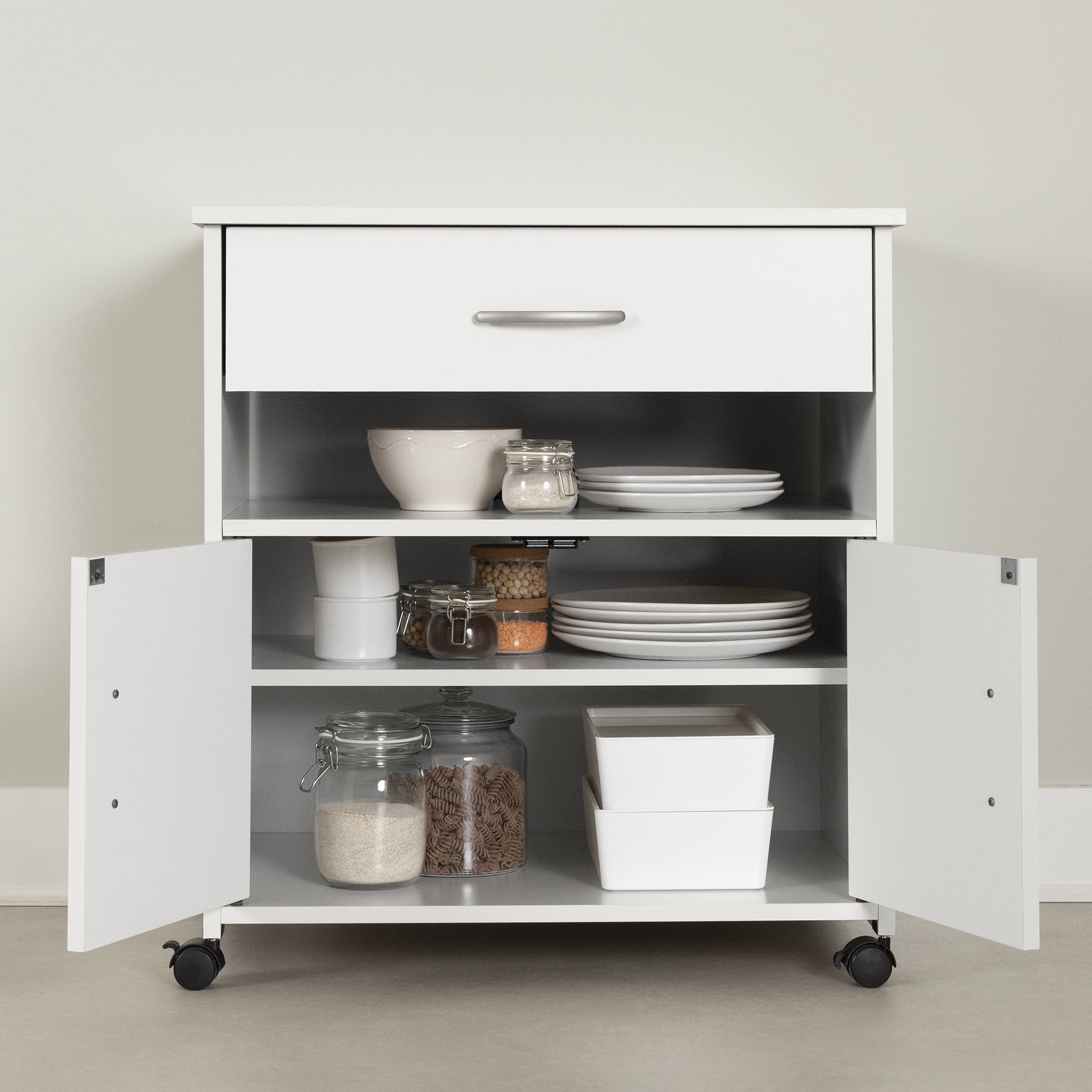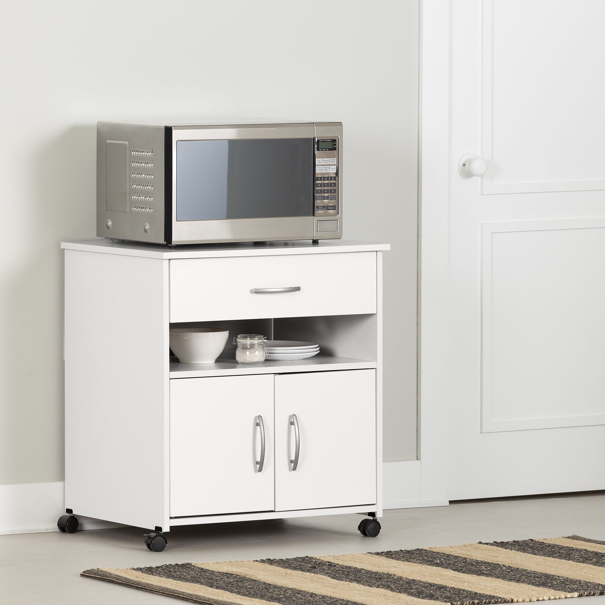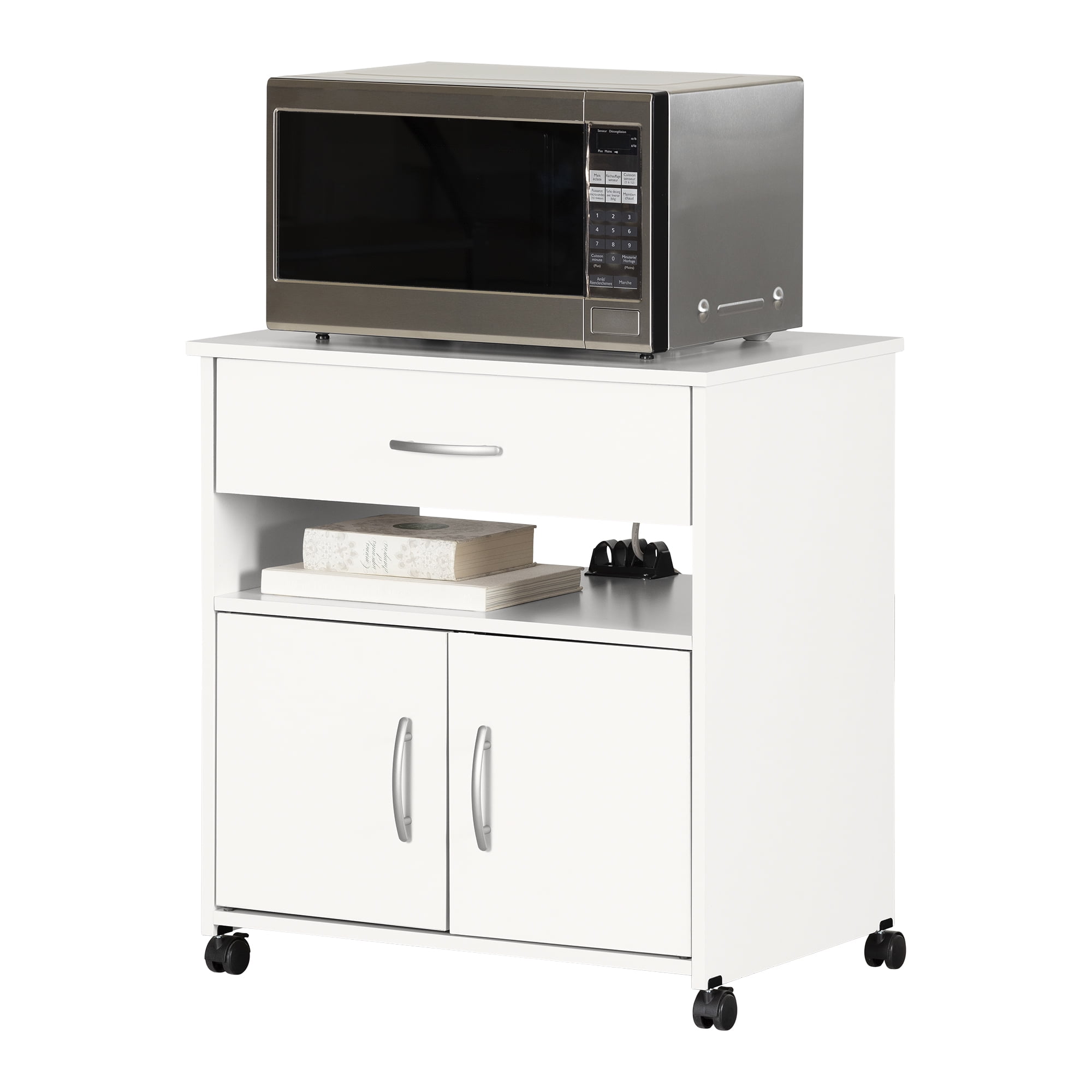 For REPLACING PARTS and HELP DURING ASSEMBLY, please contact us by phone at 1-800-290-0465, text message at 915-800-2833 (USA) (fees may apply), email at [email protected] or fill a part request form on . South Shore Axess, Contemporary Microwave Cart on Wheels, Pure White Plastic handles with a satin nickel finish Built-in brakes on two of the casters, so it can be moved around safely Behind the doors: 2 storage spaces separated by 1 adjustable shelf that can hold up to 15 lb Cable grip for keeping cords together 1 drawer, for optimum storage Metal drawer slides Made in North America with non-toxic, laminated particleboard. Accessories not included. 5-year limited warranty. Any questions? Contact South Shore, available 7/7: 1-800-290-0465 or Assembly is required and tools are not included. All products come with a clear assembly document that will guide you through all steps. If you have any questions during the assembly do not hesitate to contact South Shore Furniture for immediate support. This item is shipped in 1 box. Box dimensions : 36.75″ (L) x 19.75″ (W) x 5.75″ (H) 62 lb All our products meets or exceeds North American safety standards and our packaging are tested and certified to reduce the risk of damage during shipment. Clean with a dry cloth