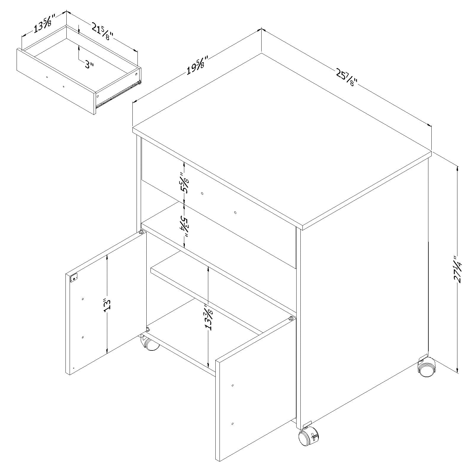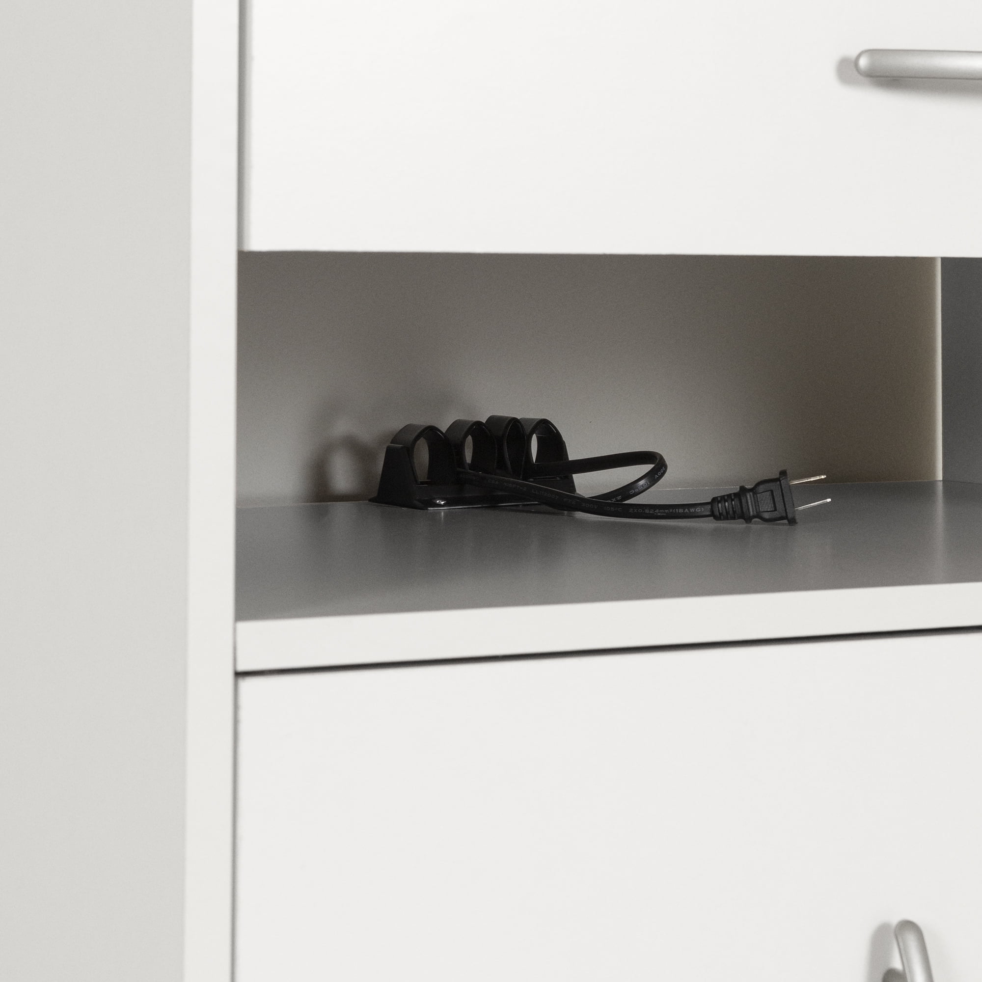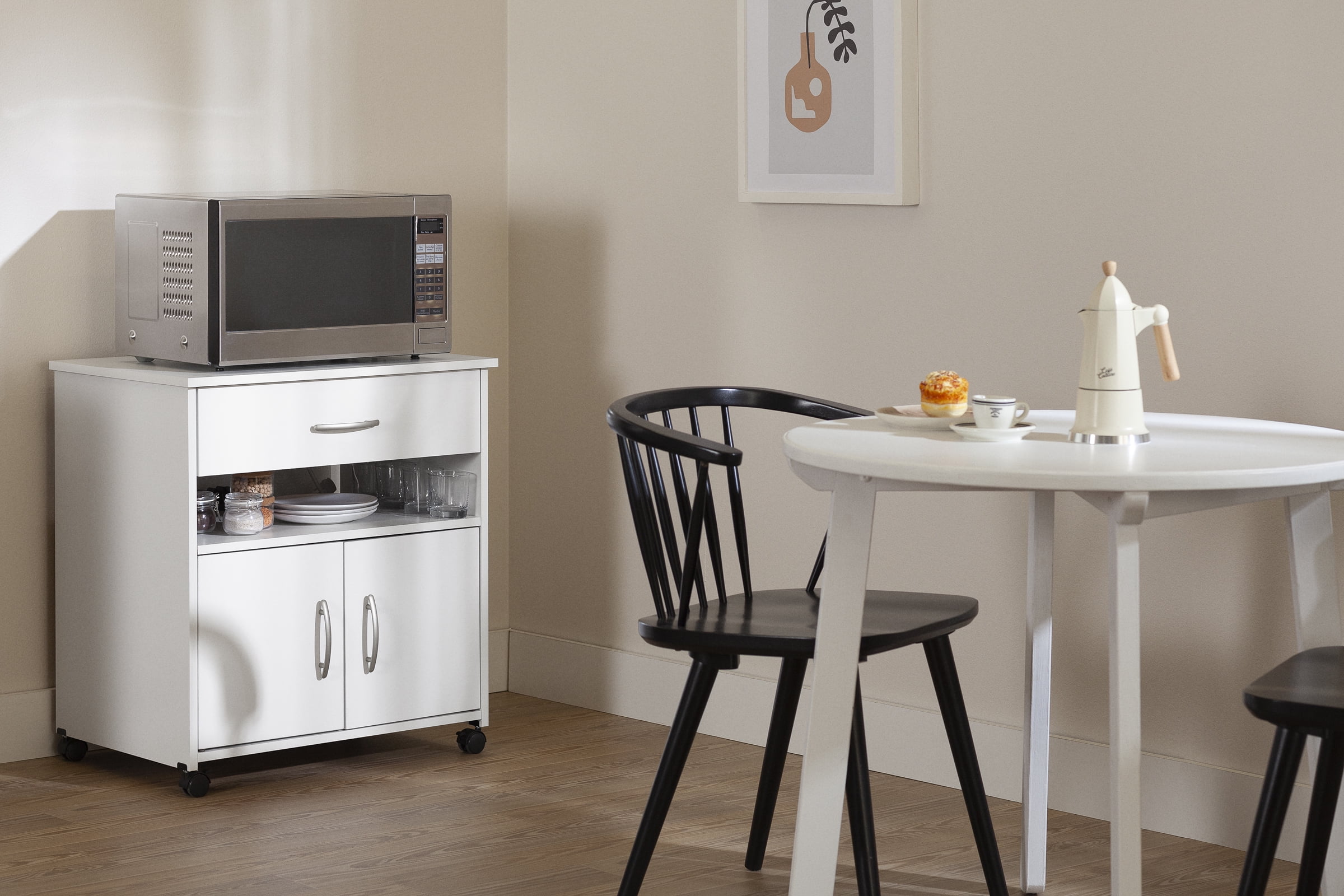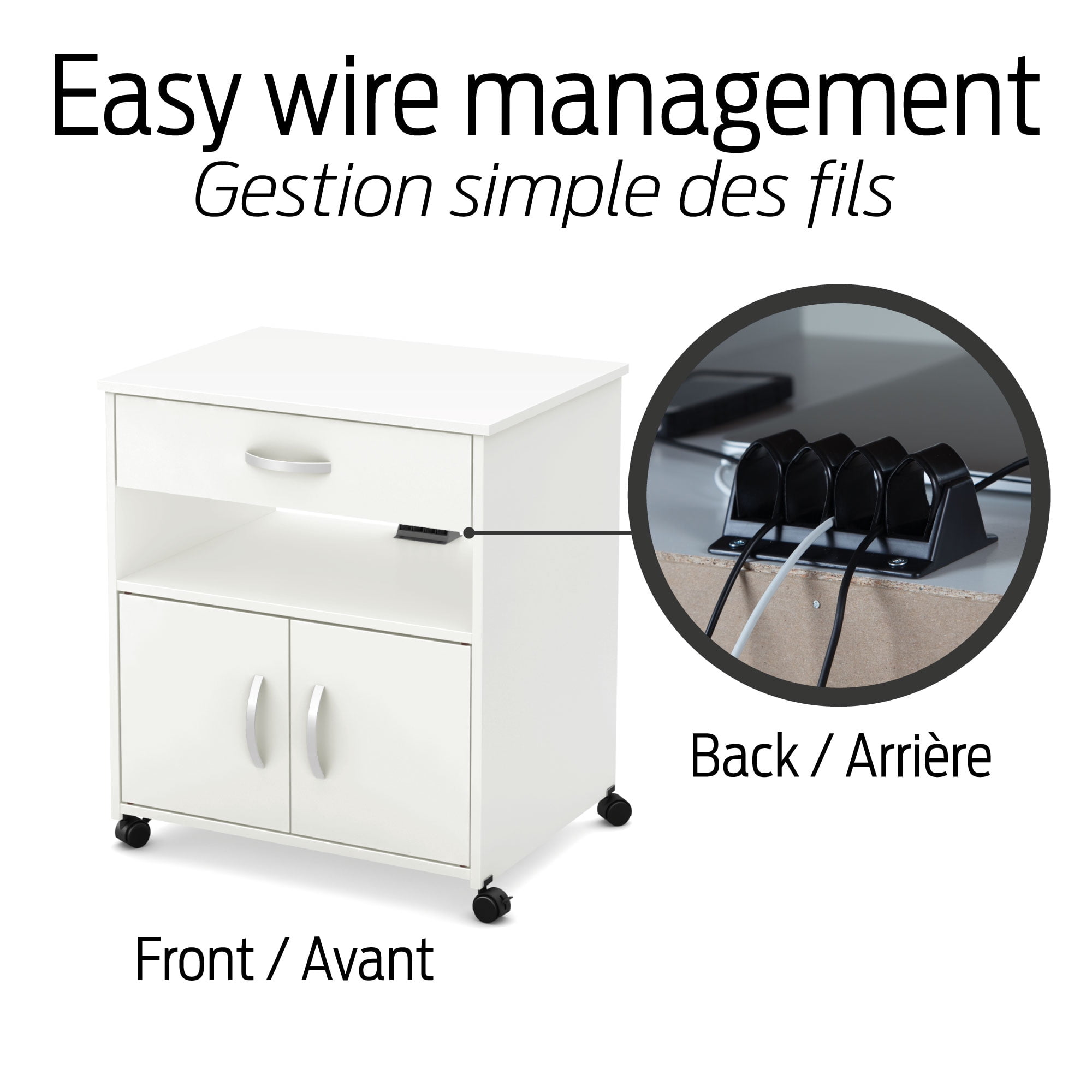 For REPLACING PARTS and HELP DURING ASSEMBLY, please contact us by phone at 1-800-290-0465, text message at 915-800-2833 (USA) (fees may apply), email at [email protected] or fill a part request form on . South Shore Axess, Contemporary Microwave Cart on Wheels, Pure White Plastic handles with a satin nickel finish Built-in brakes on two of the casters, so it can be moved around safely Behind the doors: 2 storage spaces separated by 1 adjustable shelf that can hold up to 15 lb Cable grip for keeping cords together 1 drawer, for optimum storage Metal drawer slides Made in North America with non-toxic, laminated particleboard. Accessories not included. 5-year limited warranty. Any questions? Contact South Shore, available 7/7: 1-800-290-0465 or Assembly is required and tools are not included. All products come with a clear assembly document that will guide you through all steps. If you have any questions during the assembly do not hesitate to contact South Shore Furniture for immediate support. This item is shipped in 1 box. Box dimensions : 36.75″ (L) x 19.75″ (W) x 5.75″ (H) 62 lb All our products meets or exceeds North American safety standards and our packaging are tested and certified to reduce the risk of damage during shipment. Clean with a dry cloth