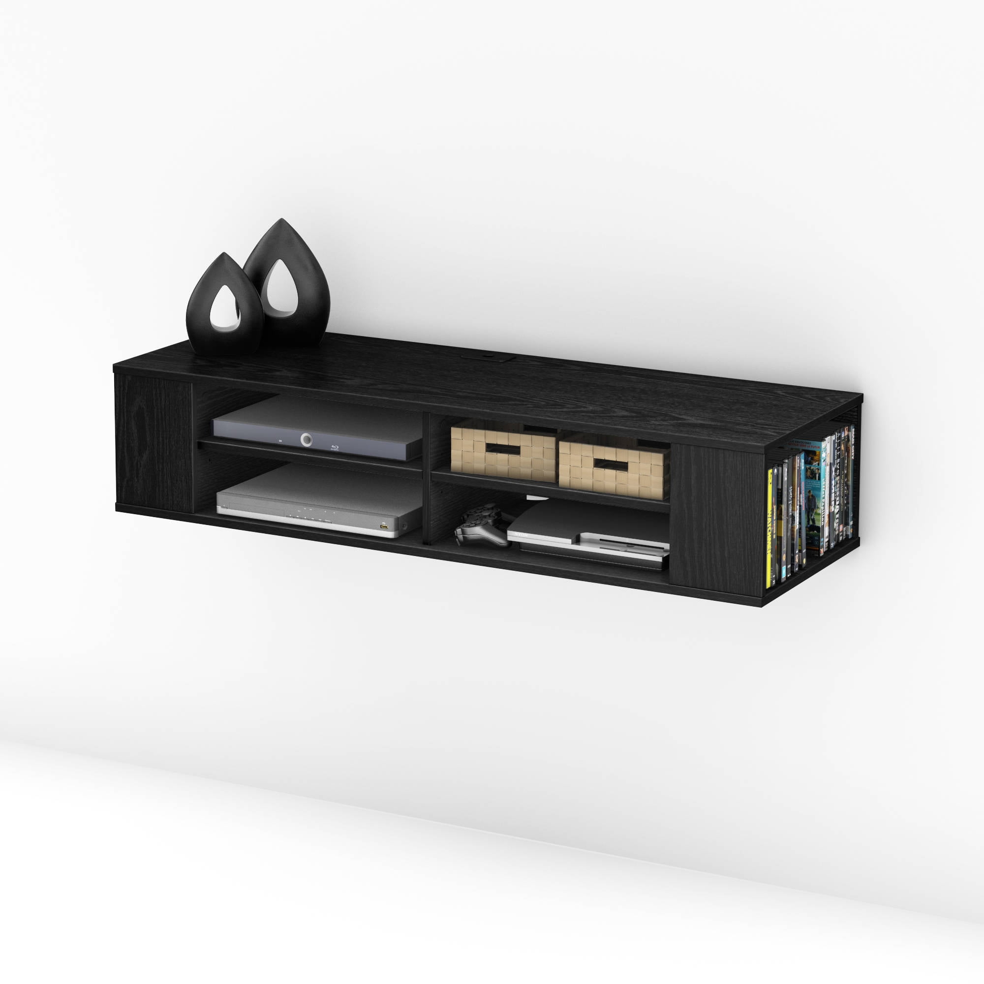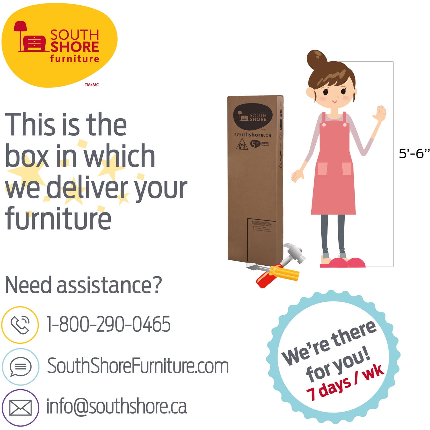 For REPLACING PARTS and HELP DURING ASSEMBLY, please contact us by phone at 1-800-290-0465, text message at 915-800-2833 (USA) (fees may apply), email at [email protected] or fill a part request form on . South Shore City Life, Contemporary Wall Mounted Media Console, Black Oak Features 4 open storage spaces perfect for electronic devices, including 2 adjustable shelves that can support a weight up to 25 pounds 2 lateral open spaces for CDs, DVDs and video games Not designed to hold a TV (top can support up to 100 lb) Includes metal hanging system for mounting TV stand firmly on wall (must be securely attached to a stud) Features a hole for easy and convenient wire management Fastening device for hanging TV on wall not included Made in North America with non-toxic, laminated particleboard. 5-year limited warranty. Any questions? Contact South Shore, available 7/7: 1-800-290-0465 or Assembly is required and tools are not included. All products come with a clear assembly document that will guide you through all steps. If you have any questions during the assembly do not hesitate to contact South Shore Furniture for immediate support. This item is shipped in 1 box. Box dimensions : 57″ (L) x 17″ (W) x 3.75″ (H) 51 lb All our products meets or exceeds North American safety standards and our packaging are tested and certified to reduce the risk of damage during shipment. Clean with a dry cloth