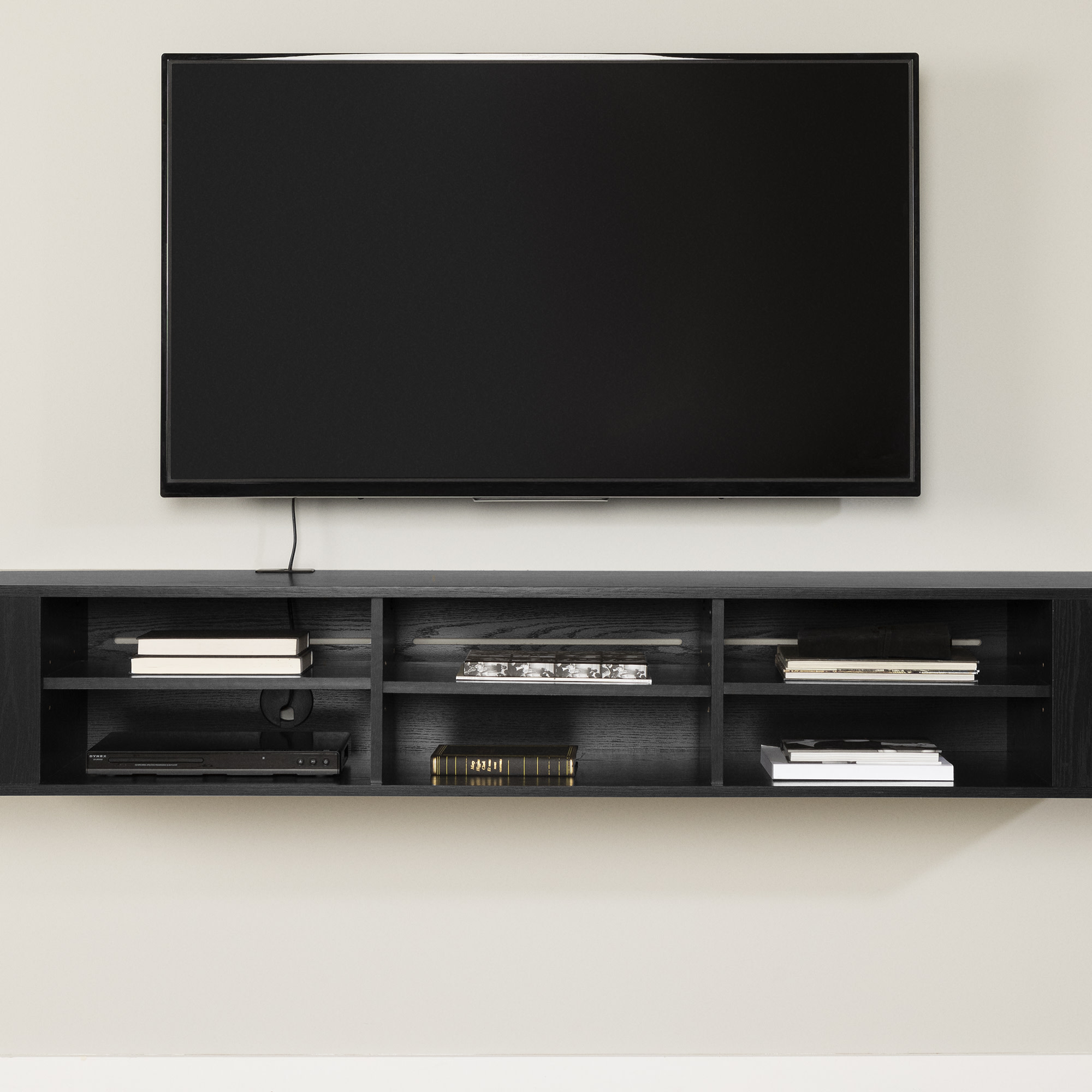 Add A Designer Touch To Your Media Center The contemporary, high-end designer look of this wall mounted media console will free up space and give your living room a light, airy look. It is not designed to support a TV; tv must be wall mounted as well. It’s available in several finishes, to blend right in with your suite of furniture. Multiple Open Storage Spaces You’ll have space for all of your A/V devices – six open spaces on the front with adjustable shelves that can house all of your electronics and a hole in the back that will help you organize all of their cords. Enjoy City Life With its rich finish and metal accents, the City Life collection is ideal for matching with any other furniture, and it blends well with a wide variety of interiors. This collection’s defining features are its clean lines and softened corners that add up to a simple design. In addition, each item’s size and shape allow it to fit neatly in your studio, apartment, loft or home office.