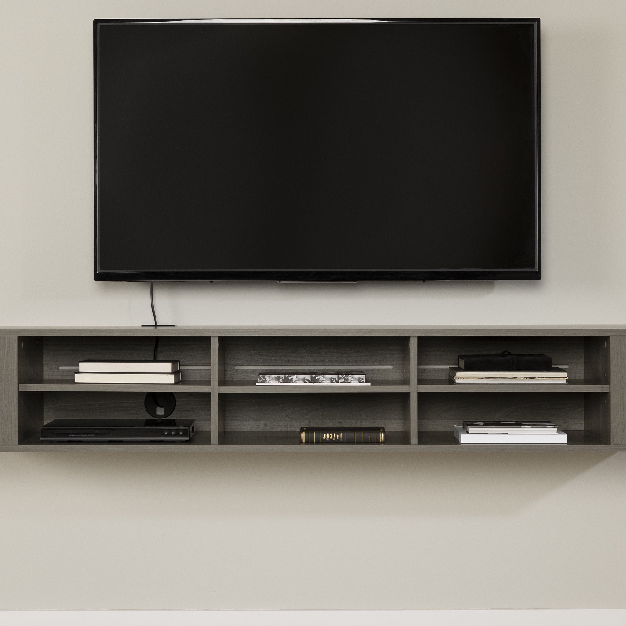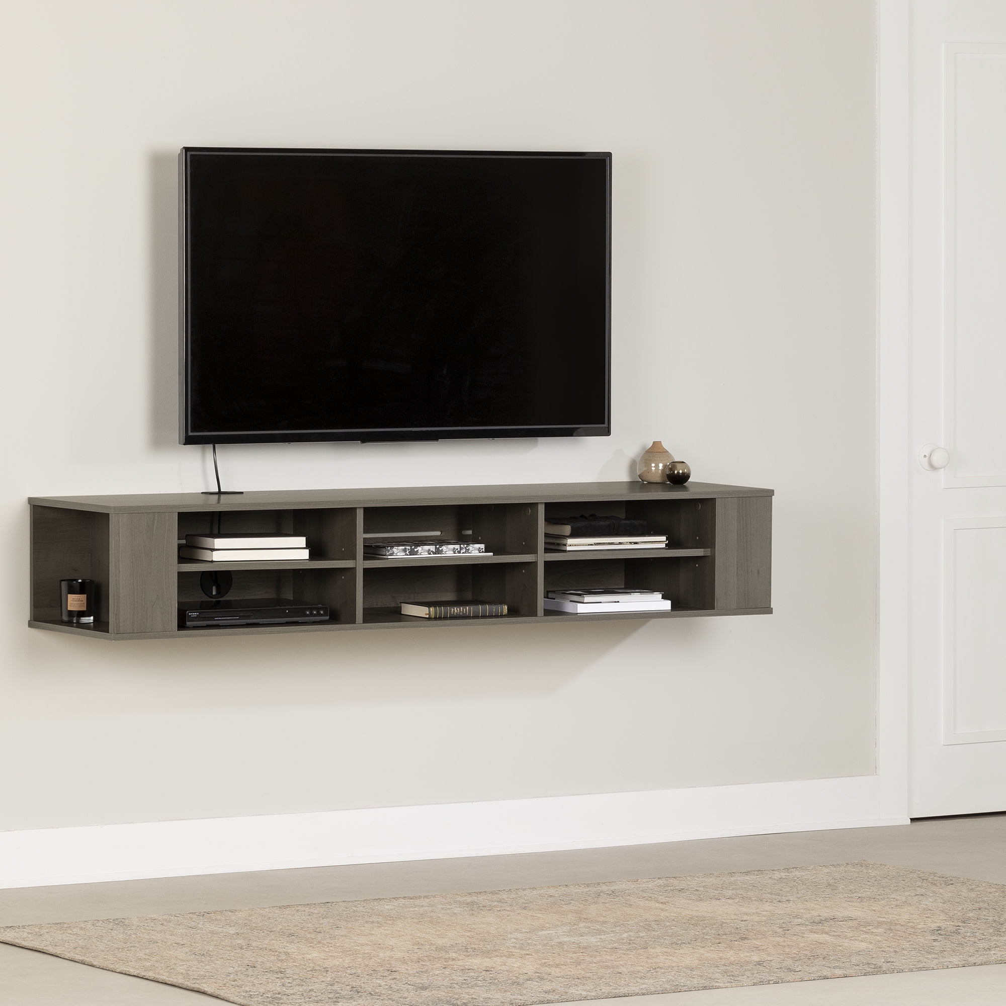 For REPLACING PARTS and HELP DURING ASSEMBLY, please contact us by phone at 1-800-290-0465, text message at 915-800-2833 (USA) (fees may apply), email at [email protected] or fill a part request form on . South Shore City Life, Contemporary Wide Wall Mounted Console, Gray Maple DESIGNER STYLE. This modern, designer look wall mount media console will free up space and give your living room a light, airy look. ELECTRONICS STORAGE. With multiple open storage spaces, you’ll have space for all of your A/V devices – six open spaces on the front with adjustable shelves and can house all of your electronics, and a hole in the back will help you organize all of their cords. MORE STORAGE ON THE SIDES. Two lateral open spaces on the sides give you more space for media storage. Features a hole for convenient wire management Made in North America with non-toxic, laminated particleboard. 5-year limited warranty. Any questions? Contact South Shore, available 7/7: 1-800-290-0465 or Assembly is required and tools are not included. All products come with a clear assembly document that will guide you through all steps. If you have any questions during the assembly do not hesitate to contact South Shore Furniture for immediate support. This item is shipped in 1 box. Box dimensions : 75.75″ (L) x 17″ (W) x 4″ (H) 71 lb All our products meets or exceeds North American safety standards and our packaging are tested and certified to reduce the risk of damage during shipment. Clean with a dry cloth