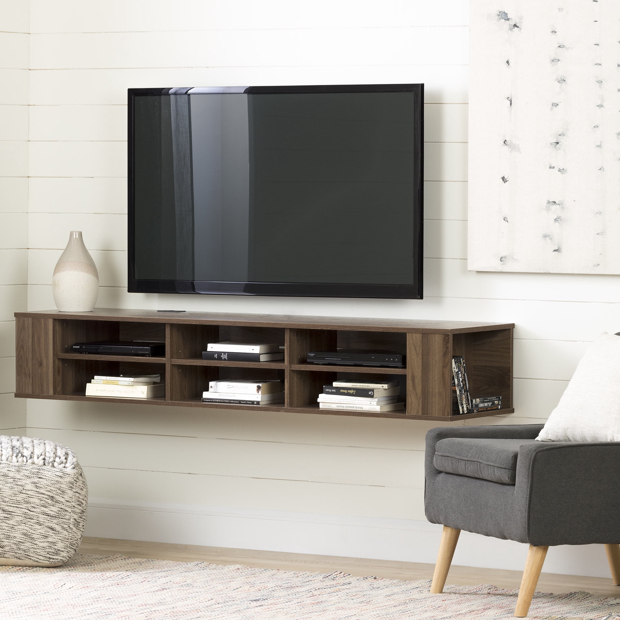 For REPLACING PARTS and HELP DURING ASSEMBLY, please contact us by phone at 1-800-290-0465, text message at 915-800-2833 (USA) (fees may apply), email at [email protected] or fill a part request form on . South Shore City Life, Contemporary Wide Wall Mounted Console, Natural Walnut DESIGNER STYLE. This modern, designer look wall mount media console will free up space and give your living room a light, airy look. ELECTRONICS STORAGE. With multiple open storage spaces, you’ll have space for all of your A/V devices – six open spaces on the front with adjustable shelves and can house all of your electronics, and a hole in the back will help you organize all of their cords. MORE STORAGE ON THE SIDES. Two lateral open spaces on the sides give you more space for media storage. Includes metal hanging system for mounting TV stand firmly on wall (must be securely attached to a stud) Fastening device for hanging TV on wall not included For TVs up to 70″ Made in North America with non-toxic, laminated particleboard. 5-year limited warranty. Any questions? Contact South Shore, available 7/7: 1-800-290-0465 or Assembly is required and tools are not included. All products come with a clear assembly document that will guide you through all steps. If you have any questions during the assembly do not hesitate to contact South Shore Furniture for immediate support. This item is shipped in 1 box. Box dimensions : 75.75″ (L) x 17″ (W) x 4″ (H) 71 lb All our products meets or exceeds North American safety standards and our packaging are tested and certified to reduce the risk of damage during shipment. Clean with a dry cloth