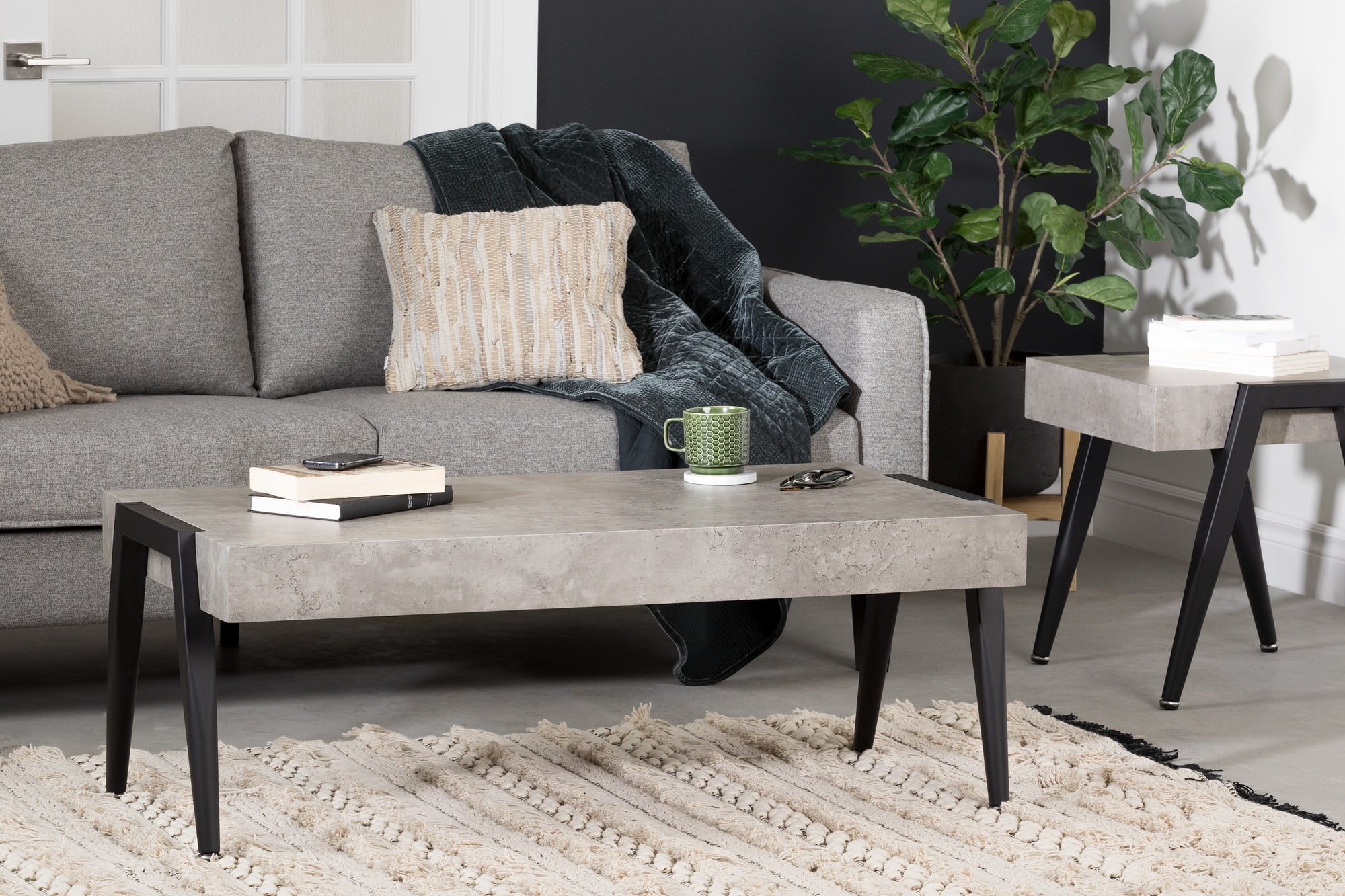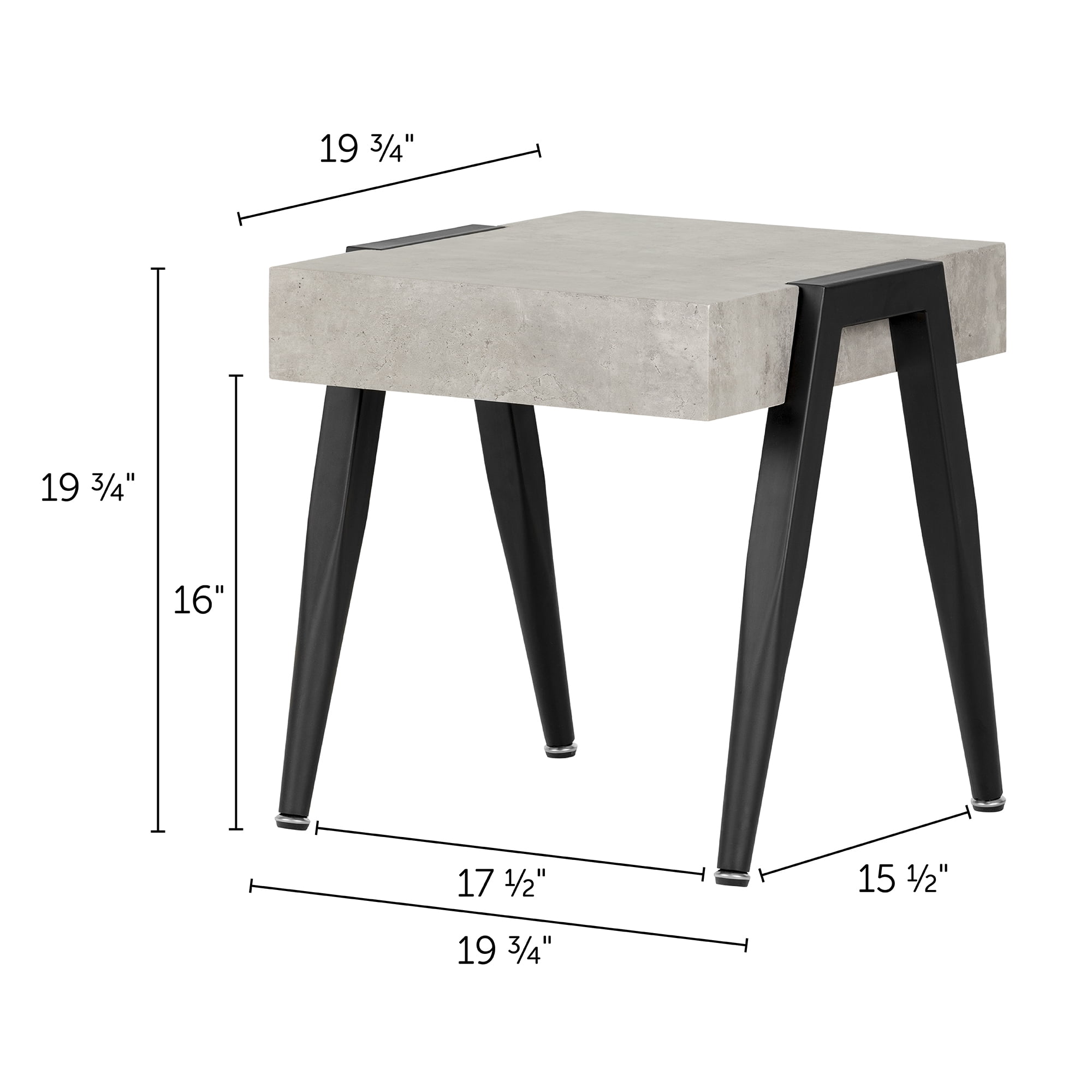 For REPLACING PARTS and HELP DURING ASSEMBLY, please contact us by phone at 1-800-290-0465, text message at 915-800-2833 (USA) (fees may apply), email at [email protected] or fill a part request form on . South Shore City Life, Contemporary End Table, Concrete 4 black metal legs Angled legs with a rounded shape Faux concrete top in MDF Can support up to 75 lbs Easy to clean Made in China. Accessories not included. 1-year limited warranty. Any questions? Contact South Shore, available 7/7: 1-800-290-0465 or Assembly is required and tools are not included. All products come with a clear assembly document that will guide you through all steps. If you have any questions during the assembly do not hesitate to contact South Shore Furniture for immediate support. This item is shipped in 1 box. Box dimensions : 23″ (L) x 24″ (W) x 11″ (H) 26 lb All our products meets or exceeds North American safety standards and our packaging are tested and certified to reduce the risk of damage during shipment. Clean with a dry cloth