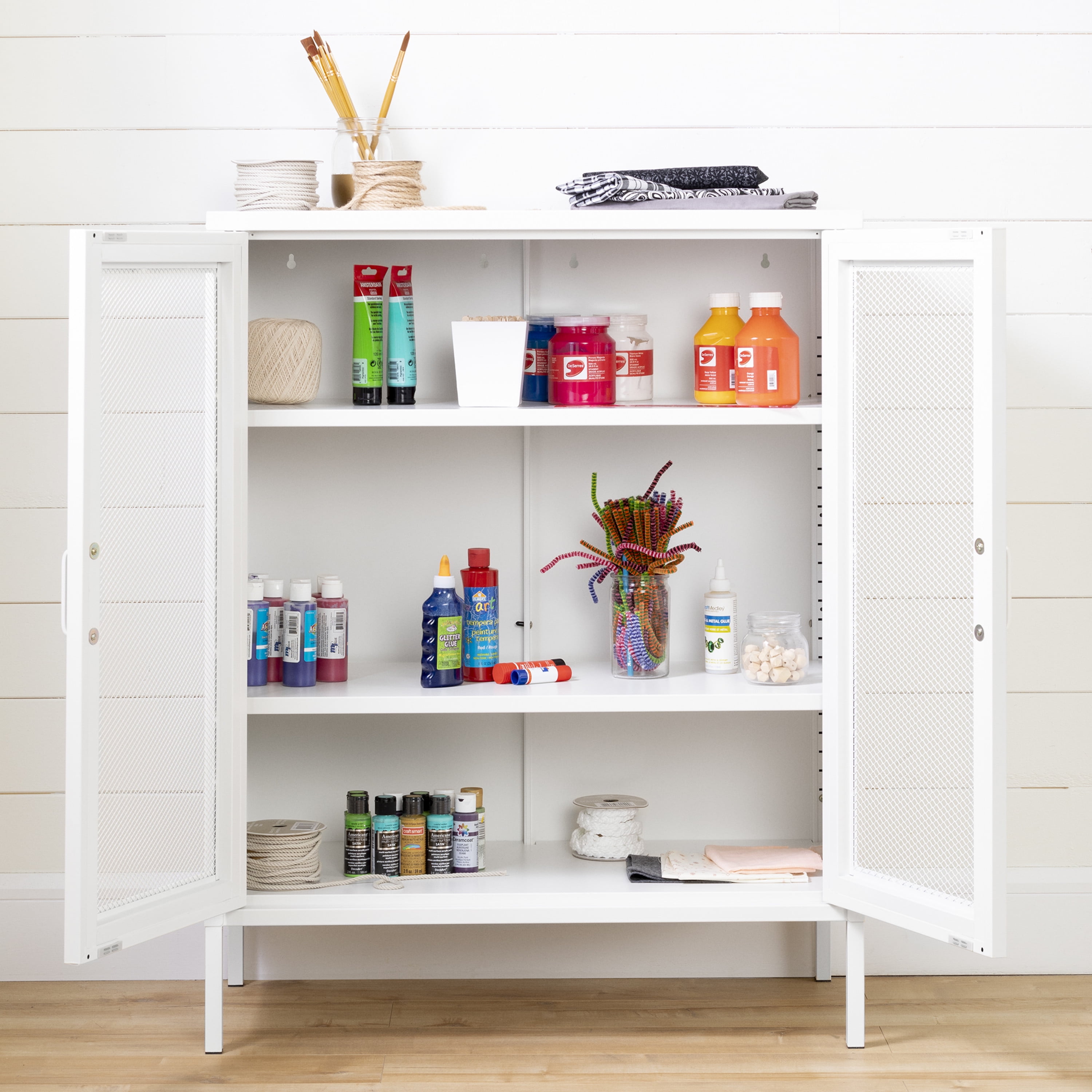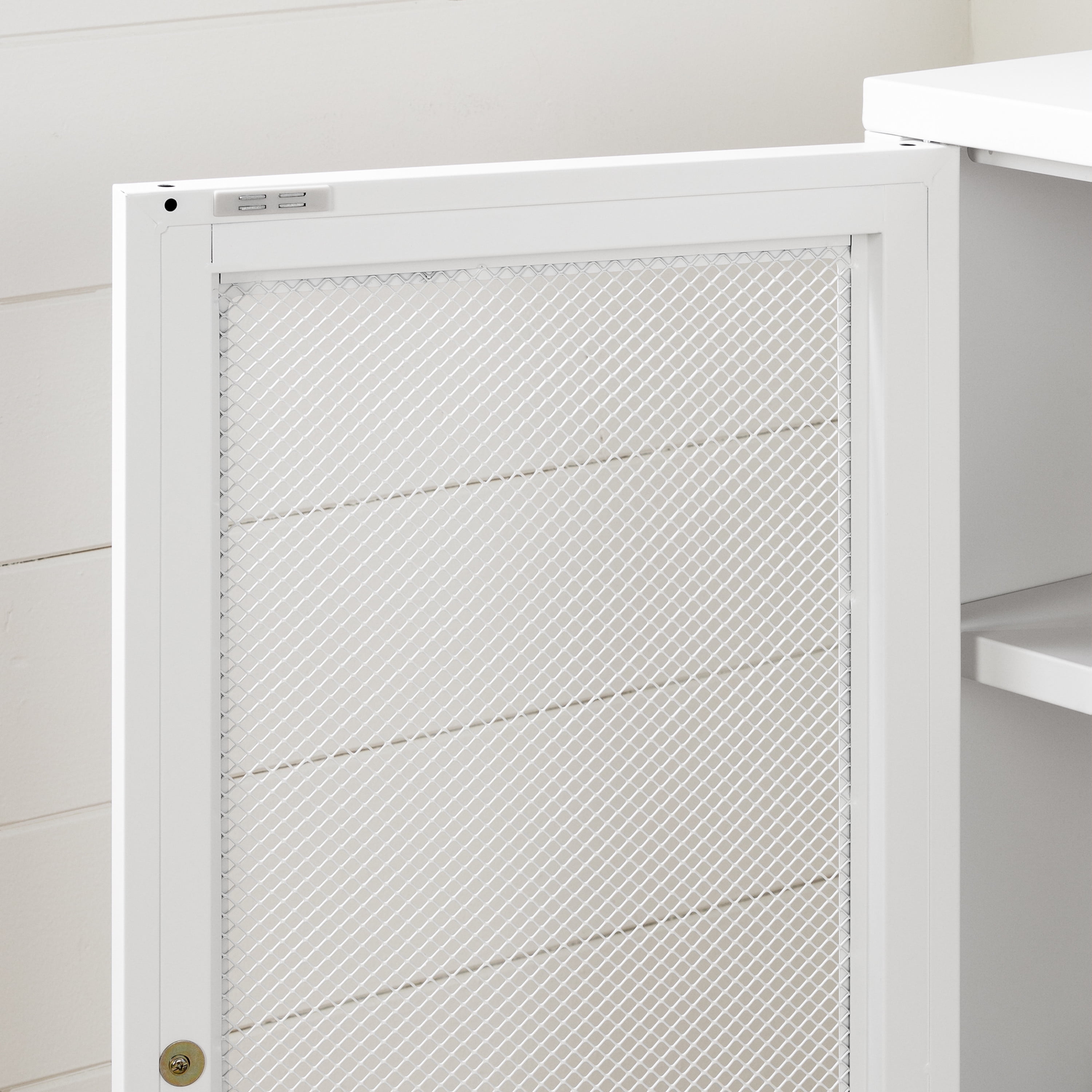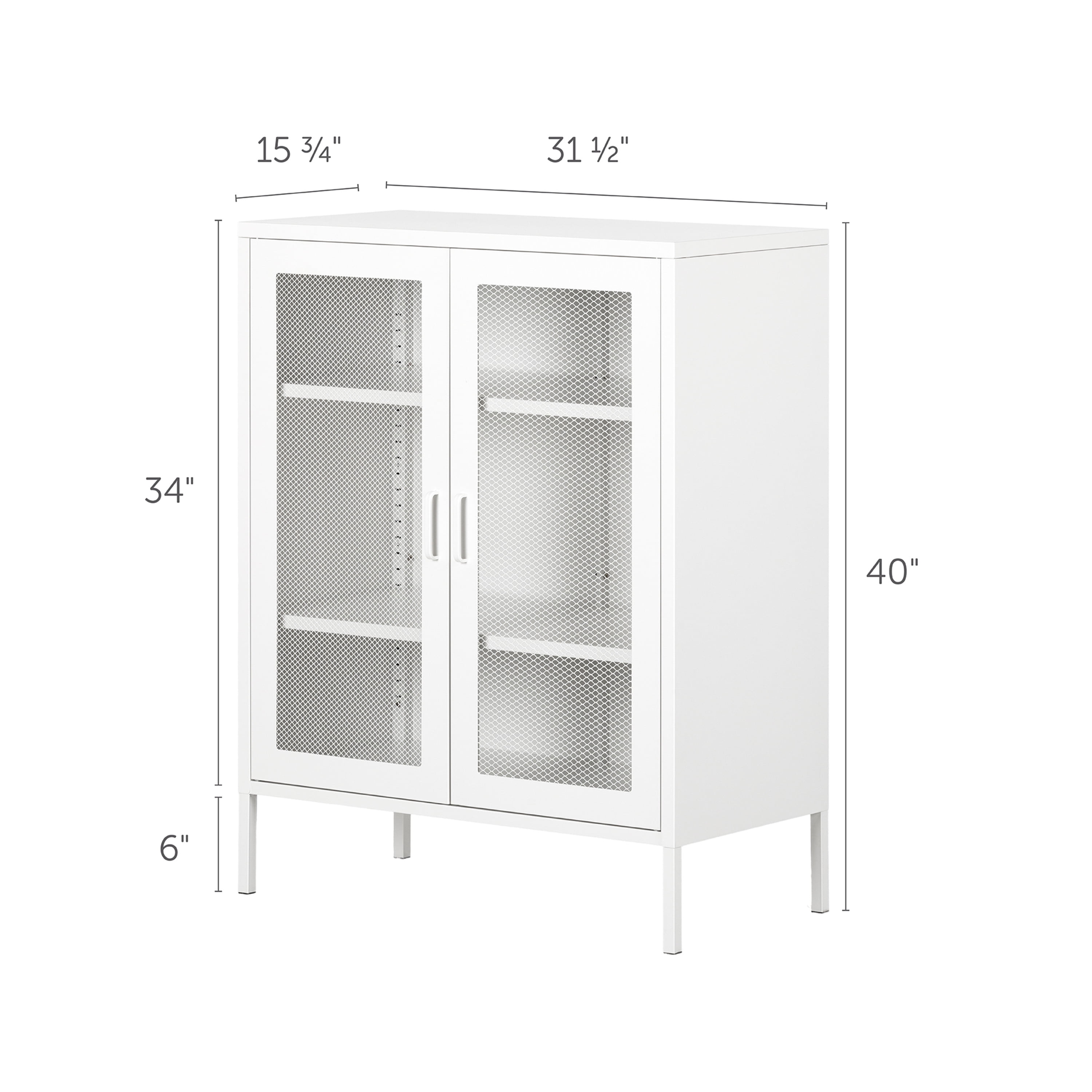 For REPLACING PARTS and HELP DURING ASSEMBLY, please contact us by phone at 1-800-290-0465, text message at 915-800-2833 (USA) (fees may apply), email at [email protected] or fill a part request form on . South Shore Crea, Contemporary Metal Mesh 2-Door Accent Cabinet, Pure White FUNCTIONAL STORAGE UNIT: This cabinet, with its one fixed shelf and two adjustable shelves, will become your new favorite storage space! SCANDINAVIAN STYLE: We like the minimalism and straight lines of this piece, which look great in any decor! SAFETY: Aside from the anchoring kit (included), this storage unit features a hole in back that helps you secure it to the wall. Made in China. Accessories not included. 5-year limited warranty. Any questions? Contact South Shore, available 7/7: 1-800-290-0465 or Assembly is required and tools are not included. All products come with a clear assembly document that will guide you through all steps. If you have any questions during the assembly do not hesitate to contact South Shore Furniture for immediate support. This item is shipped in 1 box. Box dimensions : 40.75″ (L) x 19.75″ (W) x 9.75″ (H) 50.75 lb All our products meets or exceeds North American safety standards and our packaging are tested and certified to reduce the risk of damage during shipment. Spot clean with damp cloth only.