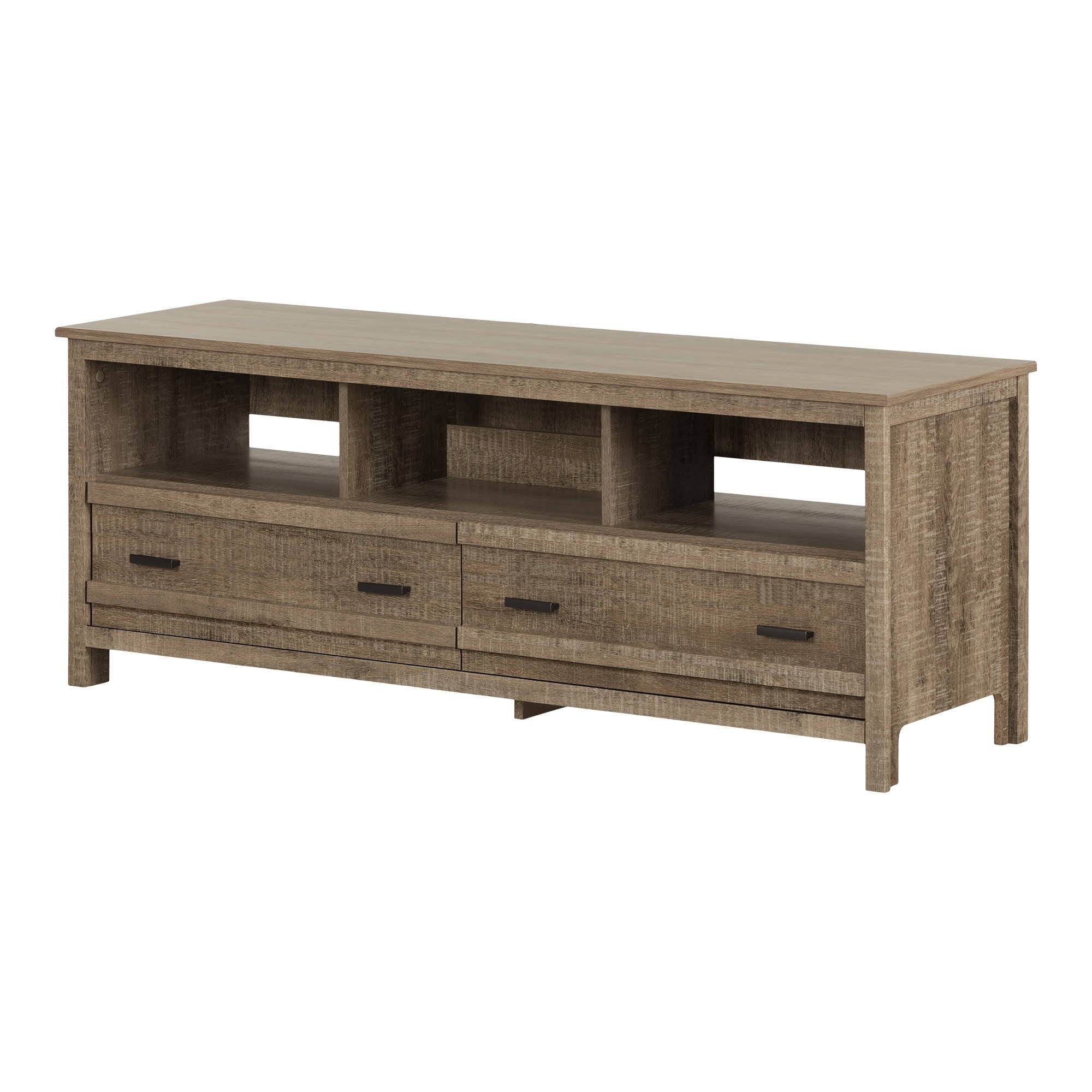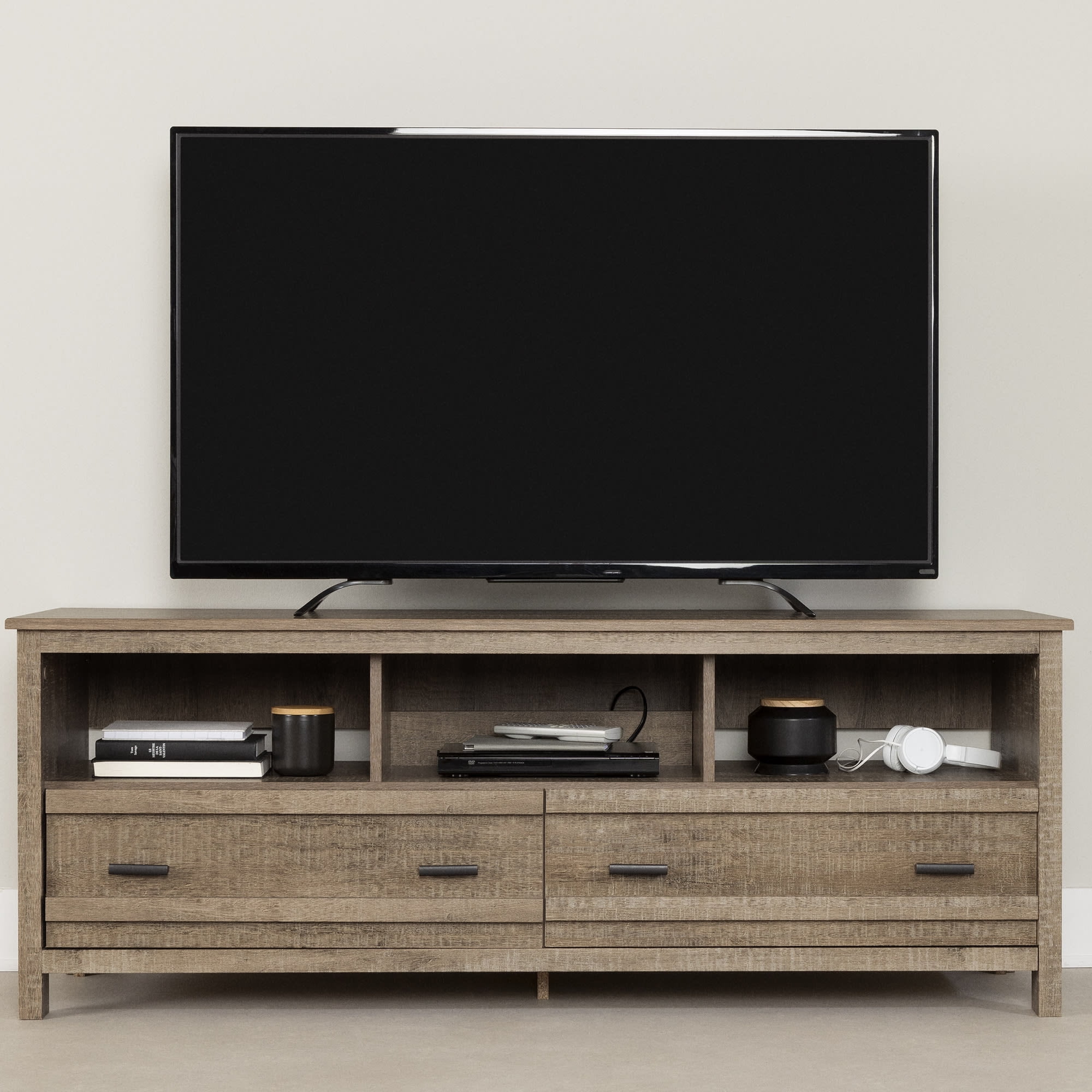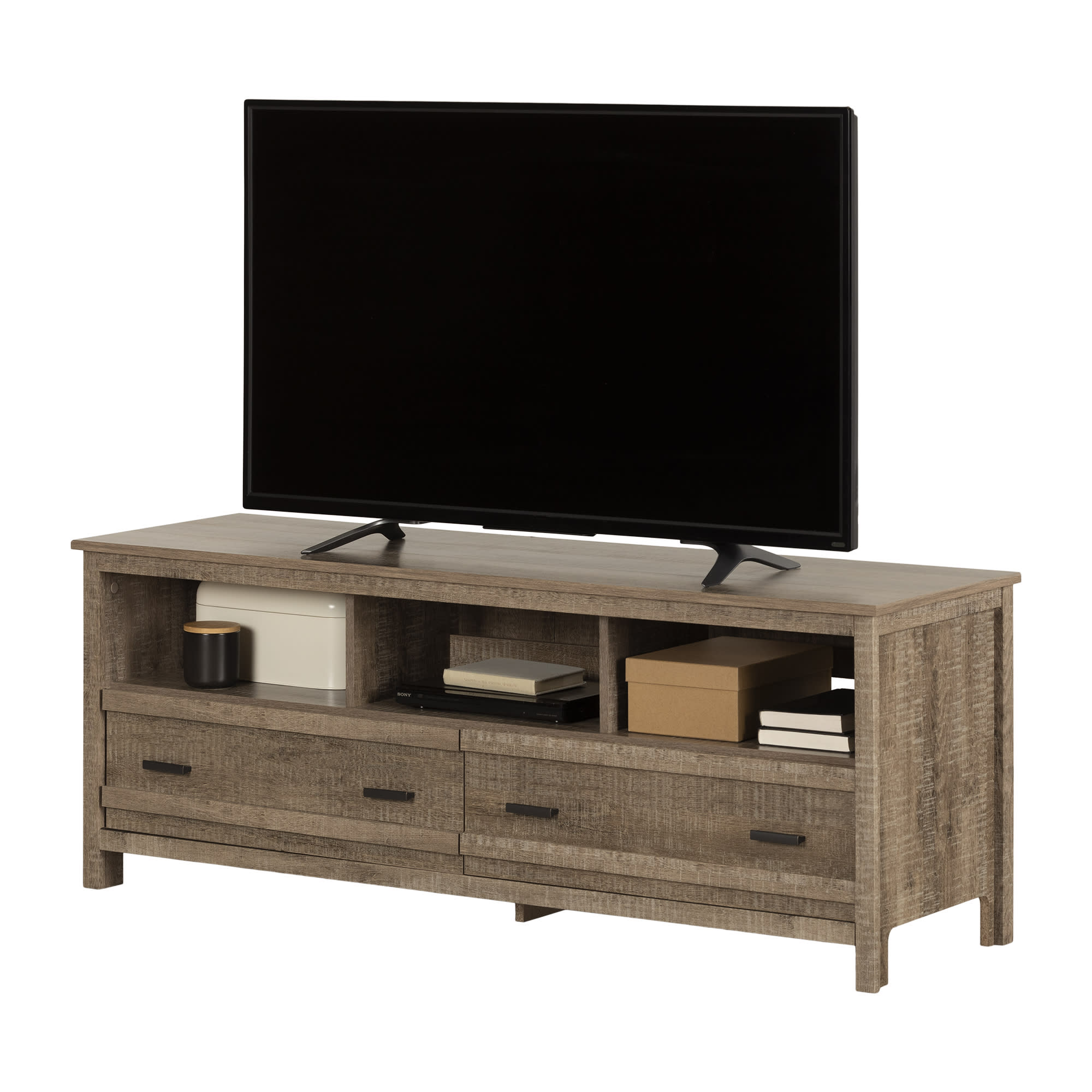 For REPLACING PARTS and HELP DURING ASSEMBLY, please contact us by phone at 1-800-290-0465, text message at 915-800-2833 (USA) (fees may apply), email at [email protected] or fill a part request form on . South Shore Exhibit, Farmhouse TV Stand, Weathered Oak FUNCTIONAL STORAGE: Accommodating LCD and plasma televisions up to 60”, this TV stand features 2 spacious drawers, and 3 open storage compartments. TRANSITIONAL STYLE: Combining contemporary lines and metal handles, this TV stand will complement any home décor. ADAPTED FOR MODERN LIVING: With plenty of compartments to hold all your media devices, the wide, open storage spaces ensure easy wire management and adequate ventilation for electronics. Features a hole in the back panel for easy and convenient wire and power bar management Wide and open storage spaces ensure adequate ventilation for electronic devices Opening at the back for easy wire management Metal drawer slides Made in North America with non-toxic, laminated particleboard. 5-year limited warranty. Any questions? Contact South Shore, available 7/7: 1-800-290-0465 or Assembly is required and tools are not included. All products come with a clear assembly document that will guide you through all steps. If you have any questions during the assembly do not hesitate to contact South Shore Furniture for immediate support. This item is shipped in 1 box. Box dimensions : 67″ (L) x 18.5″ (W) x 5.75″ (H) 88 lb All our products meets or exceeds North American safety standards and our packaging are tested and certified to reduce the risk of damage during shipment. Clean with a dry cloth