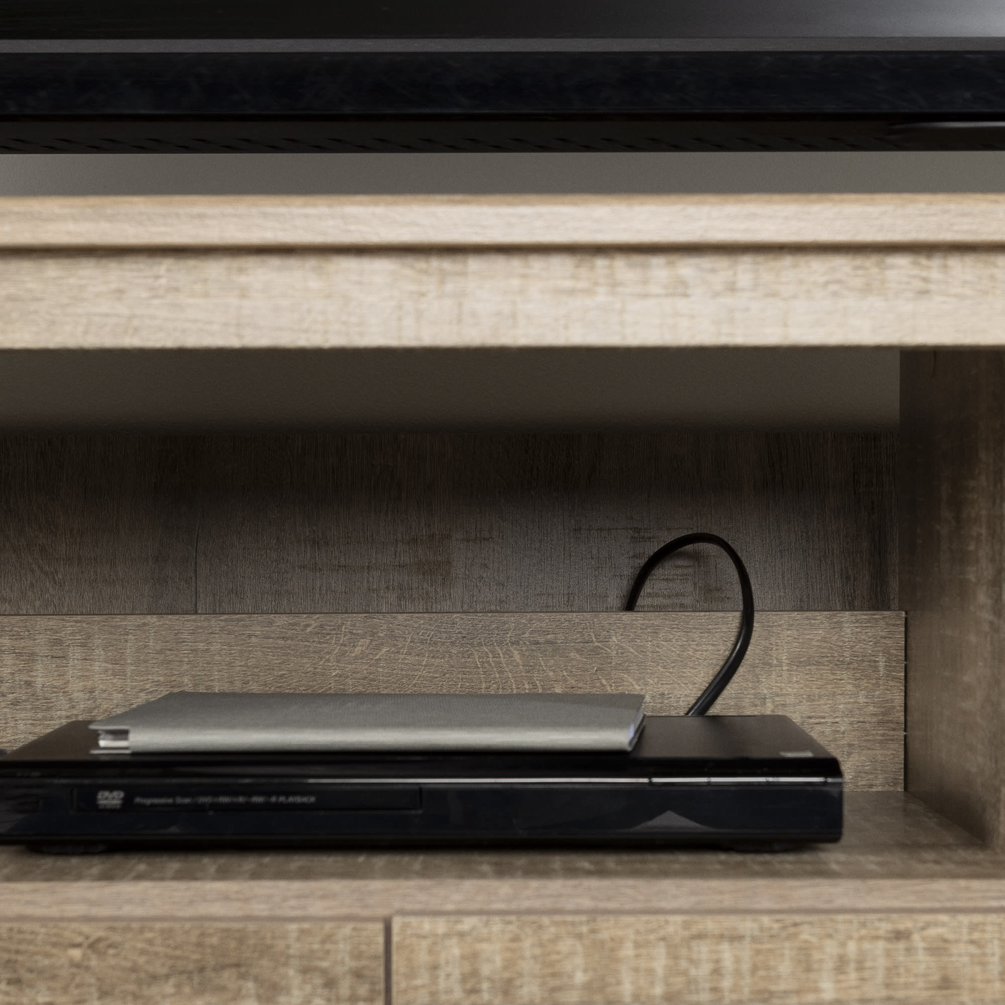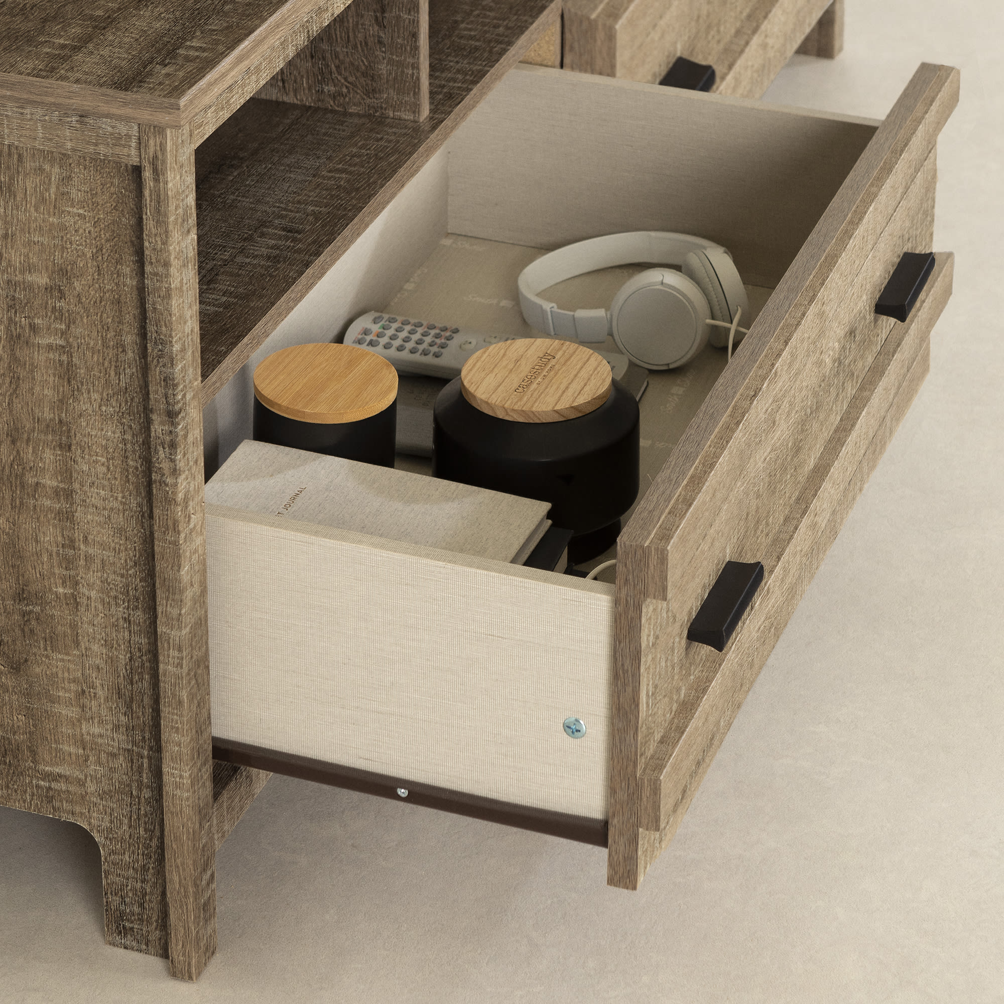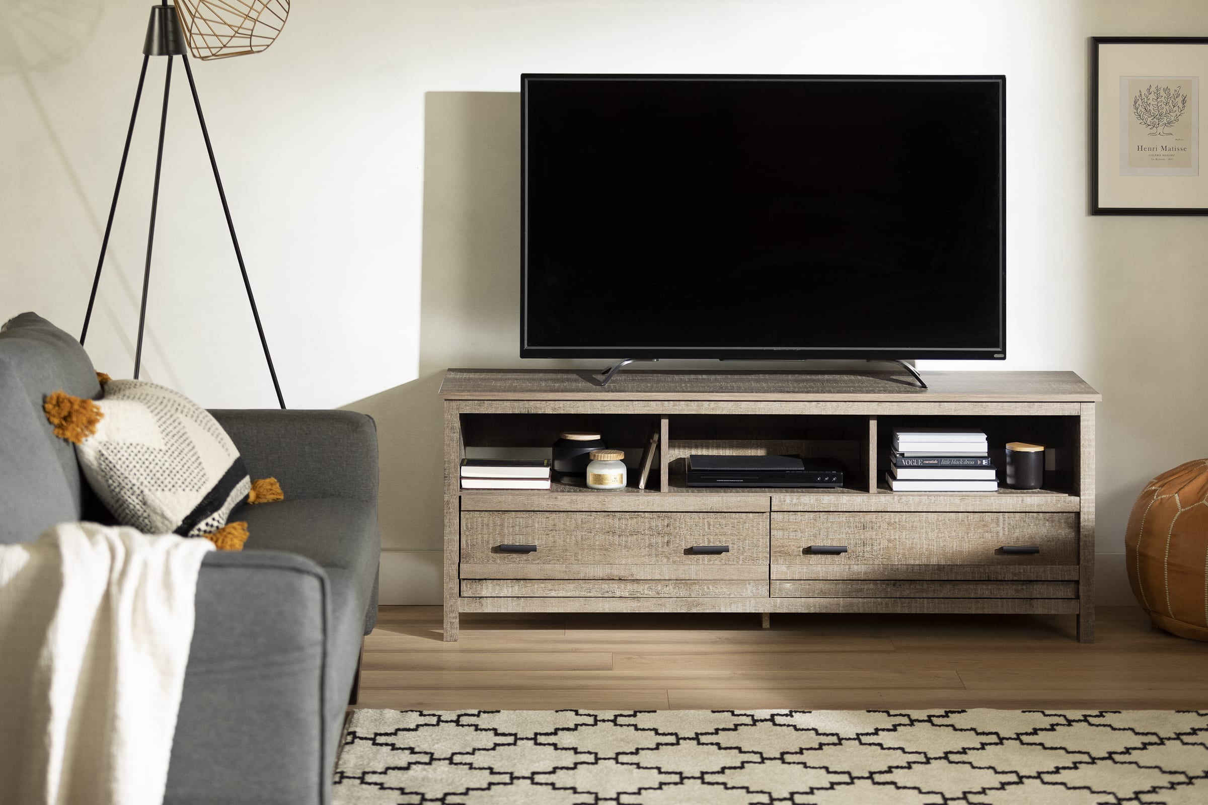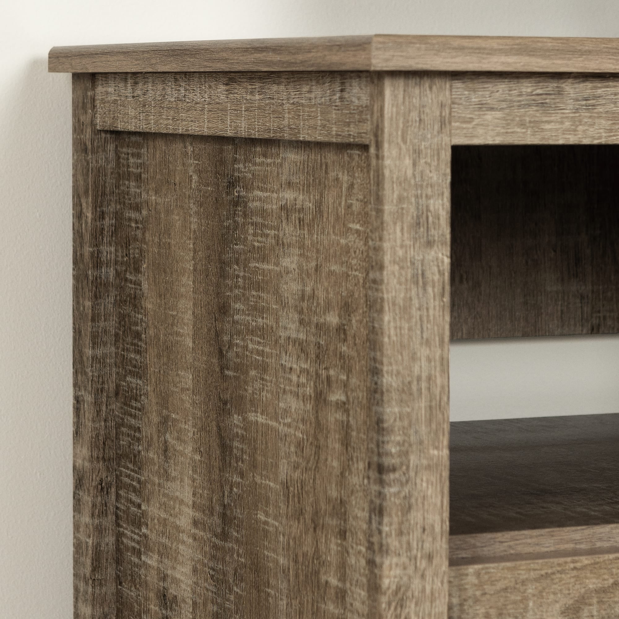 For REPLACING PARTS and HELP DURING ASSEMBLY, please contact us by phone at 1-800-290-0465, text message at 915-800-2833 (USA) (fees may apply), email at [email protected] or fill a part request form on . South Shore Exhibit, Farmhouse TV Stand, Weathered Oak FUNCTIONAL STORAGE: Accommodating LCD and plasma televisions up to 60”, this TV stand features 2 spacious drawers, and 3 open storage compartments. TRANSITIONAL STYLE: Combining contemporary lines and metal handles, this TV stand will complement any home décor. ADAPTED FOR MODERN LIVING: With plenty of compartments to hold all your media devices, the wide, open storage spaces ensure easy wire management and adequate ventilation for electronics. Features a hole in the back panel for easy and convenient wire and power bar management Wide and open storage spaces ensure adequate ventilation for electronic devices Opening at the back for easy wire management Metal drawer slides Made in North America with non-toxic, laminated particleboard. 5-year limited warranty. Any questions? Contact South Shore, available 7/7: 1-800-290-0465 or Assembly is required and tools are not included. All products come with a clear assembly document that will guide you through all steps. If you have any questions during the assembly do not hesitate to contact South Shore Furniture for immediate support. This item is shipped in 1 box. Box dimensions : 67″ (L) x 18.5″ (W) x 5.75″ (H) 88 lb All our products meets or exceeds North American safety standards and our packaging are tested and certified to reduce the risk of damage during shipment. Clean with a dry cloth