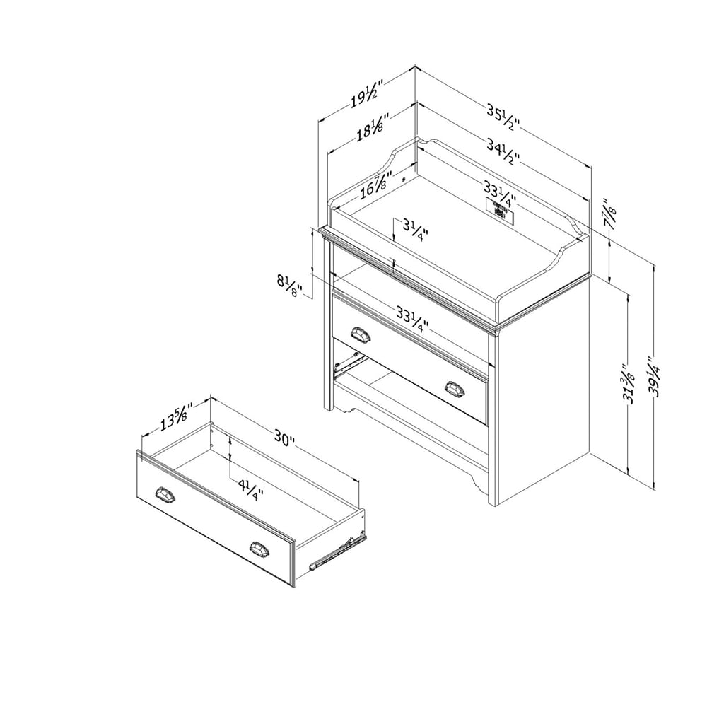 Finish: Espresso Metal handles in an Antique Bronze finish Open storage space is perfect to hold jars of cream and boxes The 2 large drawers are perfect for clothes, toys, and blankets Rounded features and secure front panel for added safety Perfect for babies of up to 30 lbs. For your children’s safety and your own: plastic drawer slides with safety stop and dampers SAFETY STANDARDS:tip-over safety standards required by the STURDY (Stop Tip-overs of Unstable, Risky Dressers on Youth) Act.