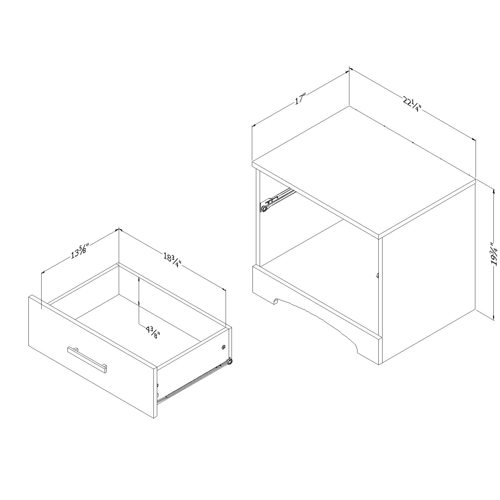 For REPLACING PARTS and HELP DURING ASSEMBLY, please contact us by phone at 1-800-290-0465, text message at 915-800-2833 (USA) (fees may apply), email at services@South Shore Furniture.com or fill a part request form on Shore Furniture/replacement-form South Shore Gramercy 1-Drawer Nightstand Black SIMPLE & MODERN DESIGN: This clean nightstand offers clean lines and a modern look that will complement any bedroom décor. Its versatile design will live through any remodels and bedding updates. BEDSIDE STORAGE: Featuring 1 roomy drawer with smooth metal slides and an open shelf, this nightstand is your perfect bedroom companion. TIDY & ORGANIZED: With a closed drawer, this nightstand promotes bedside tidiness, keeping small, loose items out of sight while storing decorative or awkward sized items in the open space. 5-YEAR LIMITED WARRANTY: South Shore is proud to stand behind this 1-drawer nightstand – end table with storage with an exclusive 5-year limited warranty. Shop with confidence knowing your purchase is always covered. EASY ASSEMBLY INSTRUCTIONS: All products come with a clear assembly document that will guide you through all steps. If you have any questions during the assembly do not hesitate to contact South Shore Furniture for immediate support.This item it shipped in 1 box Wipe with a dry cloth This product is made in North America with Laminated Particleboard BOX INFORMATION: Box #1 : 29.5″ D x 18″ W x 4.5″ H, 33 lb.