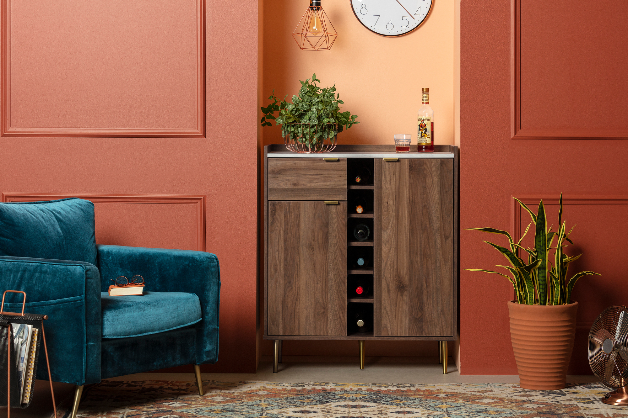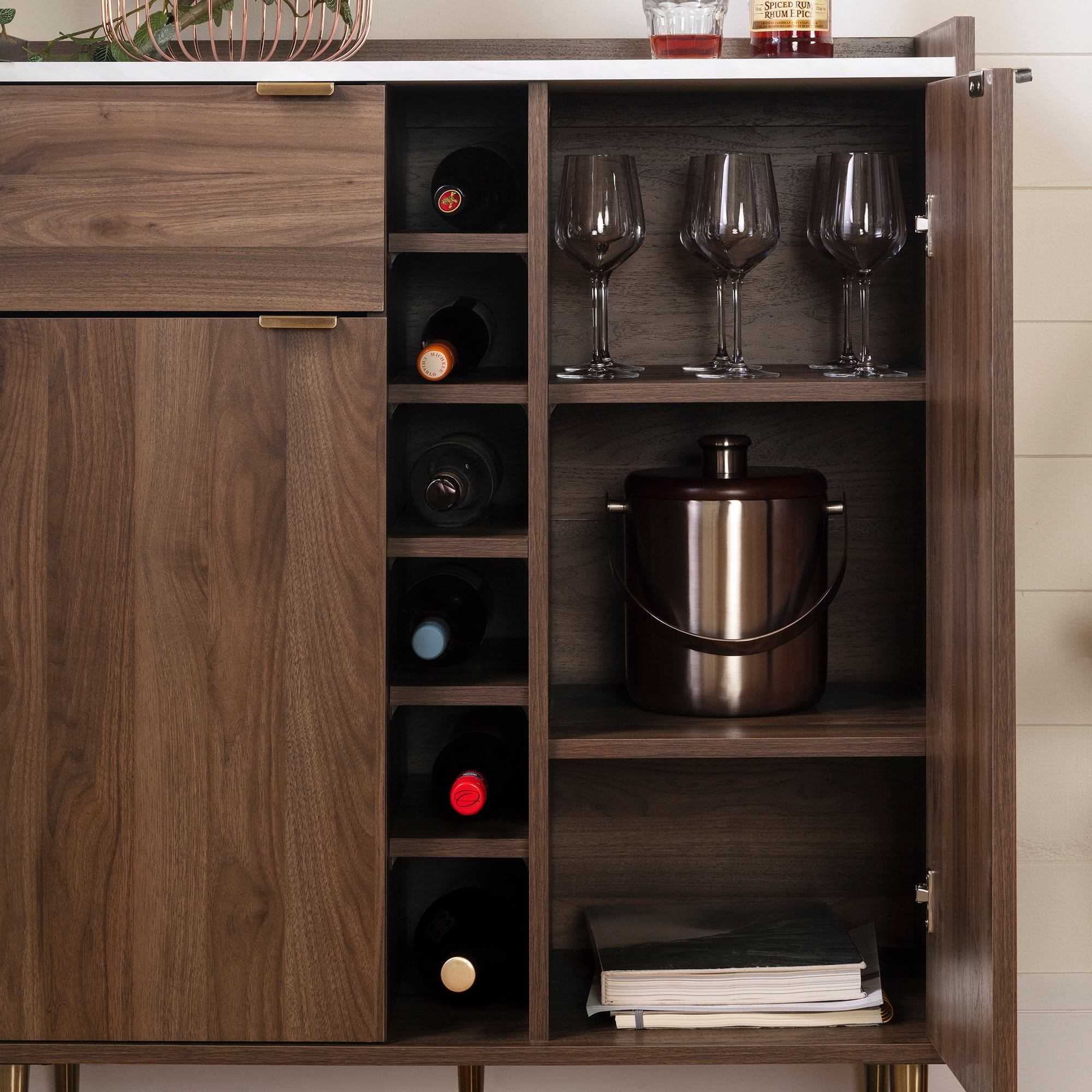 For REPLACING PARTS and HELP DURING ASSEMBLY, please contact us by phone at 1-800-290-0465, text message at 915-800-2833 (USA) (fees may apply), email at [email protected] or fill a part request form on . South Shore Hype, Mid-century Glam Buffet with Storage, Natural Walnut and Carrara Marble MIX OF STYLES: The beautiful legs and metal handles, mixed with the marble look surface and straight lines, make this furniture unique. The style combo makes this cabinet easy to pair with both natural and bright colors. Let go and have fun! AN INGENIOUS CONFIGURATION: This piece contains a lot of surprises! A center bottle rack, a large cabinet with a shelf, a wide slide-out storage space, and a small drawer… all at your disposal. METAL SLIDES: The small drawer and storage space on the left side of the cabinet are both equipped with metal slides… and their sturdiness means all your bottles will remain intact. Made in North America with non-toxic, laminated particleboard. Accessories not included. 5-year limited warranty. Any questions? Contact South Shore, available 7/7: 1-800-290-0465 or Assembly is required and tools are not included. All products come with a clear assembly document that will guide you through all steps. If you have any questions during the assembly do not hesitate to contact South Shore Furniture for immediate support. This item is shipped in 1 box. Box dimensions : 56″ (L) x 17.25″ (W) x 7.75″ (H) 103 lb All our products meets or exceeds North American safety standards and our packaging are tested and certified to reduce the risk of damage during shipment. Clean with a dry cloth
