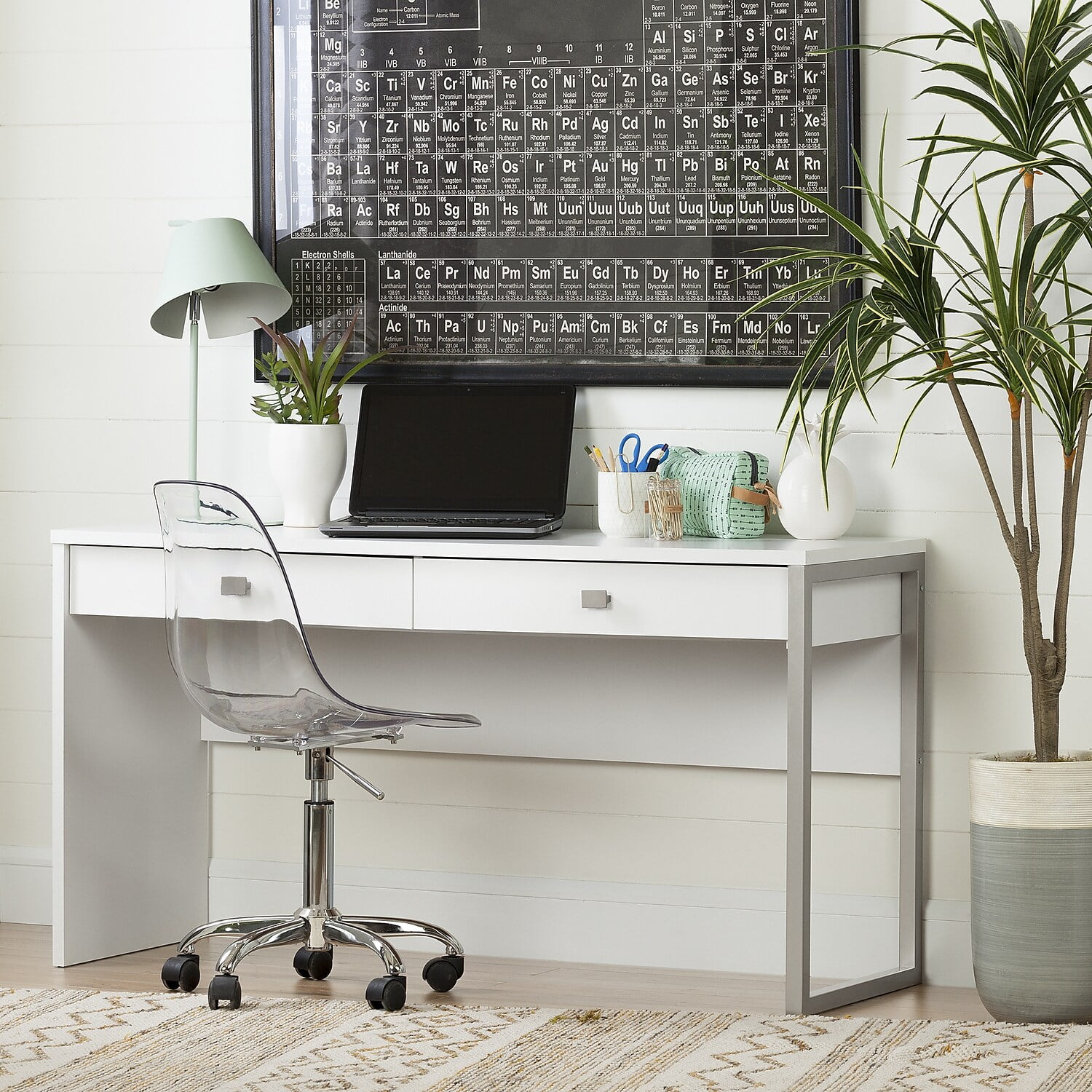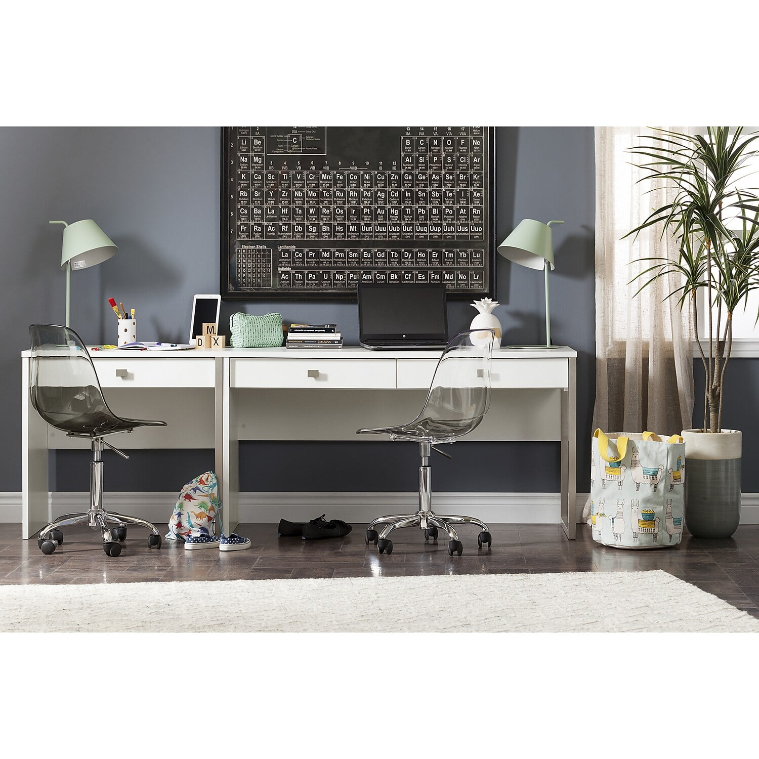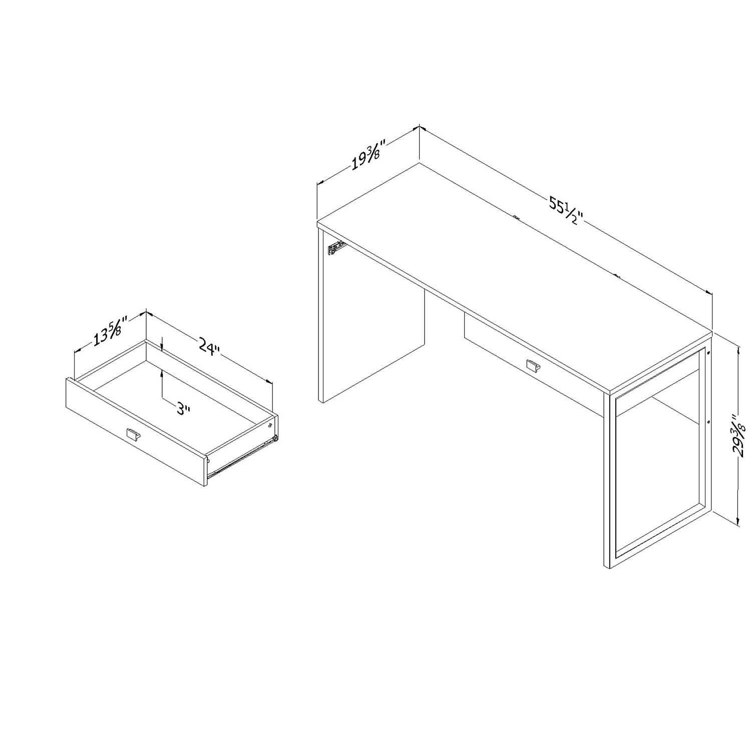 For REPLACING PARTS and HELP DURING ASSEMBLY, please contact us by phone at 1-800-290-0465, text message at 915-800-2833 (USA) (fees may apply), email at [email protected] or fill a part request form on South Shore Interface Desk with 2 Drawers White A TRULY VERSATILE DESK: This desk will meet your day to day needs, whatever they may be: doing your own work, the kids’ homework, or crafting.TWO LARGE DRAWERS: Use the drawers to store pens, files, notebooks, and small books. They’re mounted on metal slides, so they’re sturdy and silent!LARGE WORK SURFACE: You’ll have ample space for working every day. Your computer and monitor won’t be jammed into a tight space!CLAMP FOR CORDS INCLUDED: This desk comes with a clamp on the back, so no more tangled electronic cords! 5-YEAR LIMITED WARRANTY: South Shore is proud to stand behind this desk with 2 drawers with an exclusive 5-year limited warranty. Shop with confidence knowing your purchase is always covered.EASY ASSEMBLY INSTRUCTIONS: All products come with a clear assembly document that will guide you through all steps. If you have any questions during the assembly do not hesitate to contact South Shore Furniture for immediate support.This item is shipped in 1 box, make sure to have a friend with youWipe with a dry clothThis product is made in North America with Laminated Particleboard and MetalBOX INFORMATION:Box #1 : 59.5″ D x 20.5″ W x 5″ H, 74 lb.