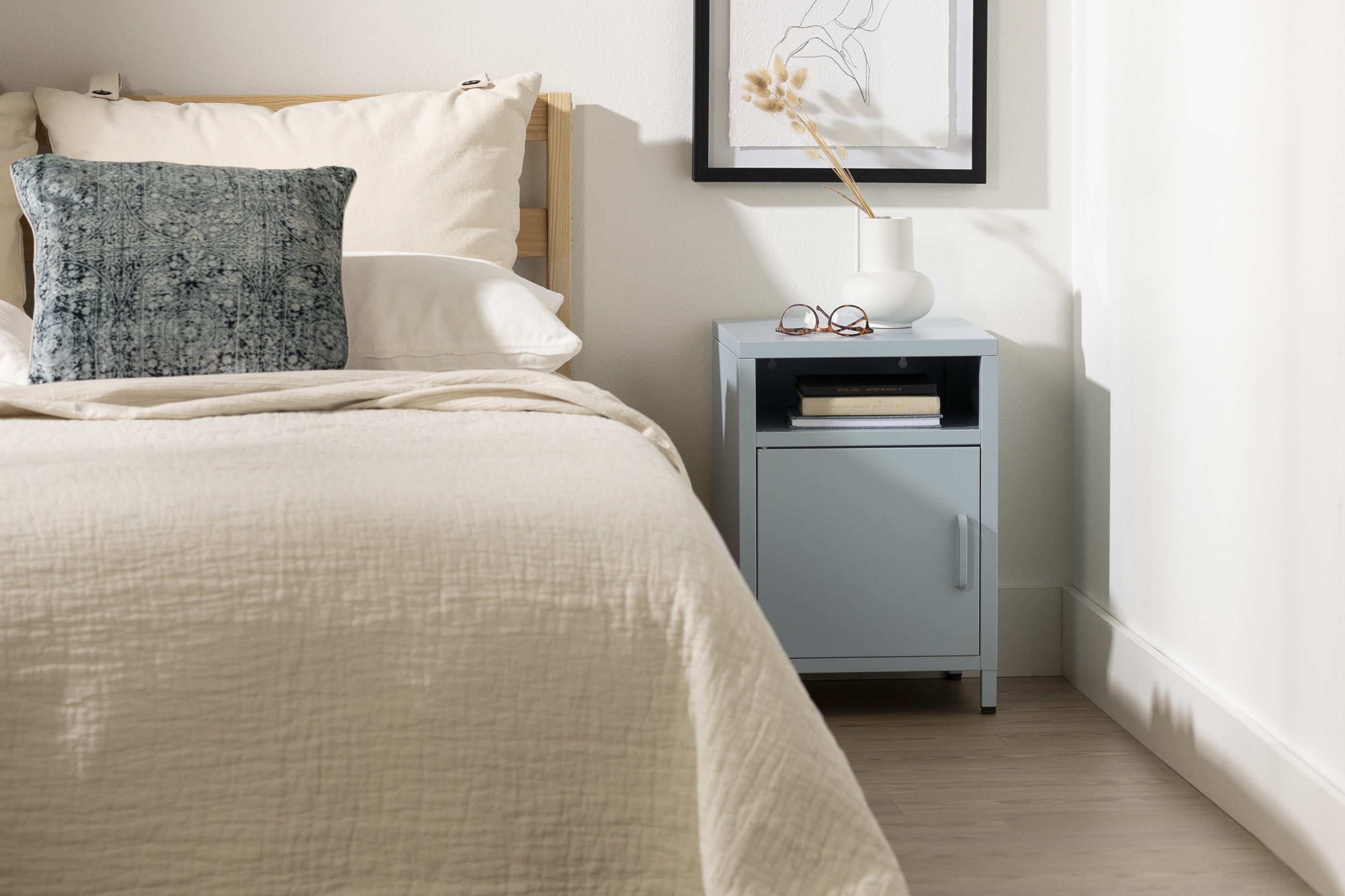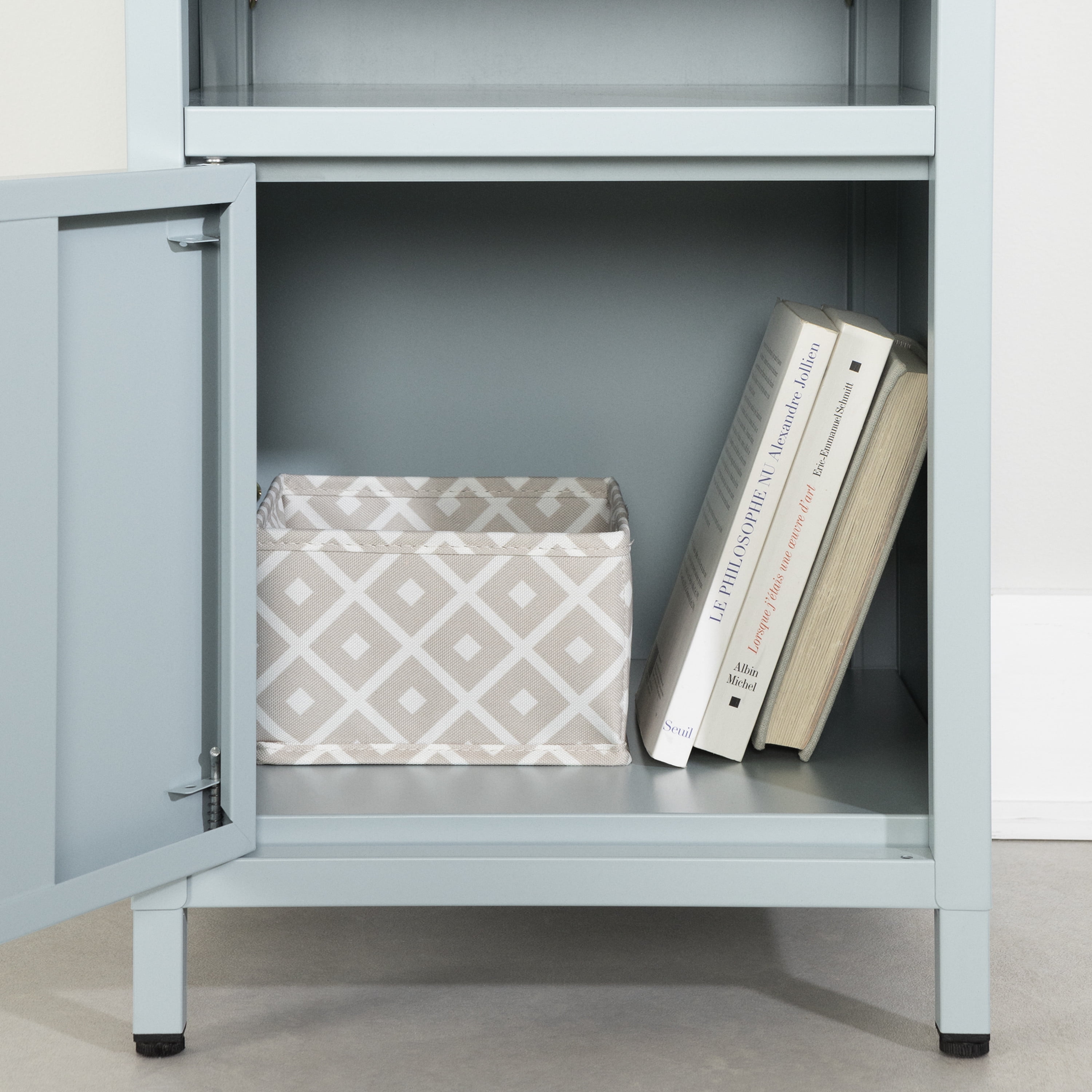 For REPLACING PARTS and HELP DURING ASSEMBLY, please contact us by phone at 1-800-290-0465, text message at 915-800-2833 (USA) (fees may apply), email at services@South Shore Furniture.com or fill a part request form on Shore Furniture.com/pages/contact-us-en. South Shore Kodali, Contemporary Nightstand, Light Blue PERFECT FOR THE BEDROOM: This nightstand has a classic style that – on its own or as part of a set – will create a familiar, comforting atmosphere in your bedroom. The short legs, straight lines, and slender handle are absolutely timeless. EXTRA STORAGE: The combination of open and closed compartments in this nightstand will help you keep your room tidy, even at night! It’ll be the perfect place for putting down your book, your phone, and your reading glasses before drifting off to sleep. FITS IN SMALL SPACES: The compact design of this bedside table will be perfect for your smaller rooms. It won’t take up too much floor space. REVERSIBLE DOOR: Install the door hinges on the right or left. Make sure the handle is close to your bed, for easy access. ANCHORING KIT: Attach your nightstand to the wall with the anchoring system included in this purchase. It won’t tip over! Made in China. Accessories not included. 5-year limited warranty. Any questions? Contact South Shore, available 7/7: 1-800-290-0465 or Shore Furniture.com Assembly is required and tools are not included. All products come with a clear assembly document that will guide you through all steps. If you have any questions during the assembly do not hesitate to contact South Shore Furniture for immediate support. This item is shipped in 1 box. Box dimensions : 21.75″ (L) x 17″ (W) x 7.75″ (H) 16 lb All our products meets or exceeds North American safety standards and our packaging are tested and certified to reduce the risk of damage during shipment. Spot clean with damp cloth.