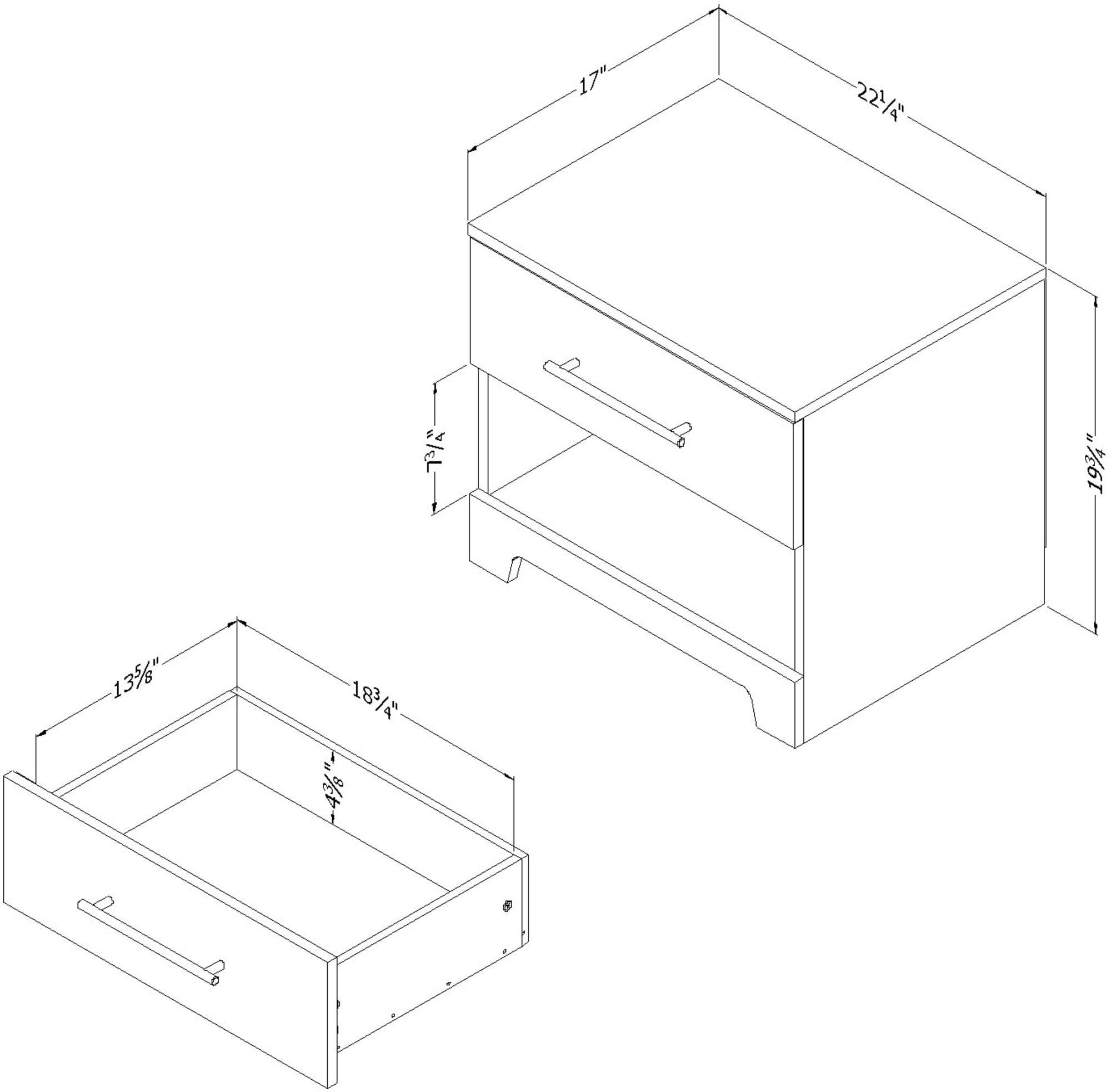 For REPLACING PARTS and HELP DURING ASSEMBLY, please contact us by phone at 1-800-290-0465, text message at 915-800-2833 (USA) (fees may apply), email at services@South Shore Furniture.com or fill a part request form on Shore Furniture/replacement-form South Shore Primo 1-Drawer Nightstand Rustic Oak SLEEK BEDROOM STORAGE: Keep your personal items organized and out of sight at your bedside with this elegant and practical nightstand. MODERN DESIGN: This bedside nightstand with contemporary, clean lines and contrasting metal handles will blend with any bedroom décor or furniture. PRACTICAL FURNITURE: The nightstand features a deep drawer and an open, easy-access storage space which makes it convenient for storing books, glasses or any type of personal items you may need next to you in your bedroom. 5-YEAR LIMITED WARRANTY: South Shore is proud to stand behind this 1-drawer nightstand – end table with storage with an exclusive 5-year limited warranty. Shop with confidence knowing your purchase is always covered. EASY ASSEMBLY INSTRUCTIONS: All products come with a clear assembly document that will guide you through all steps. If you have any questions during the assembly do not hesitate to contact South Shore Furniture for immediate support.This item it shipped in 1 box Wipe with a dry cloth This product is made in North America with Laminated Particleboard BOX INFORMATION: Box #1 : 29.5″ D x 18″ W x 4.5″ H, 33 lb.