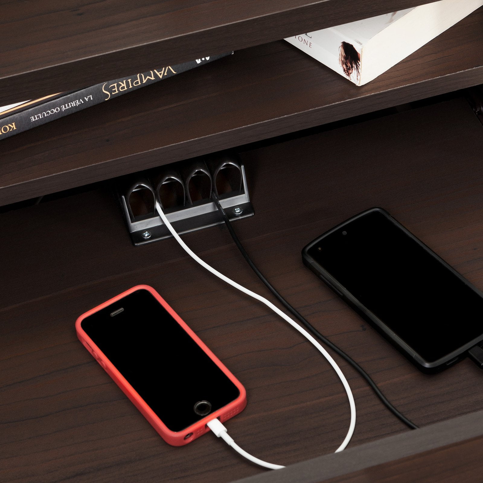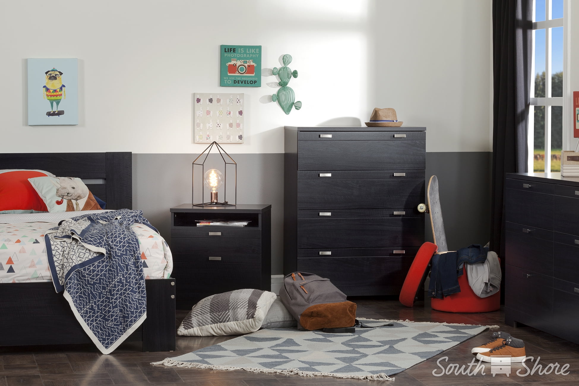 For REPLACING PARTS and HELP DURING ASSEMBLY, please contact us by phone at 1-800-290-0465, text message at 915-800-2833 (USA) (fees may apply), email at services@South Shore Furniture.com or fill a part request form on Shore Furniture/replacement-form South Shore Reevo Nightstand with Cord Catcher Black Oak BEDROOM STORAGE: Keep your books, eyeglasses and personal items organized and out of sight at your bedside with this elegant and practical nightstand. CONTEMPORARY STYLE: The bedside nightstand features modern design with clean lines that will blend with any bedroom décor or furniture. LIFESTYLE FURNITURE: The nightstand’s 2 deep drawers are finished with a convenient open storage compartment for books above and an open back with cable grip for easy wire management. 5-YEAR LIMITED WARRANTY: South Shore is proud to stand behind this nightstand with drawers and cord catcher with an exclusive 5-year limited warranty. Shop with confidence knowing your purchase is always covered. EASY ASSEMBLY INSTRUCTIONS: All products come with a clear assembly document that will guide you through all steps. If you have any questions during the assembly do not hesitate to contact South Shore Furniture for immediate support.This item it shipped in 1 box Wipe with a dry cloth This product is made in North America with Laminated Particleboard BOX INFORMATION: Box #1 : 29″ D x 18″ W x 6.75″ H, 48 lb.