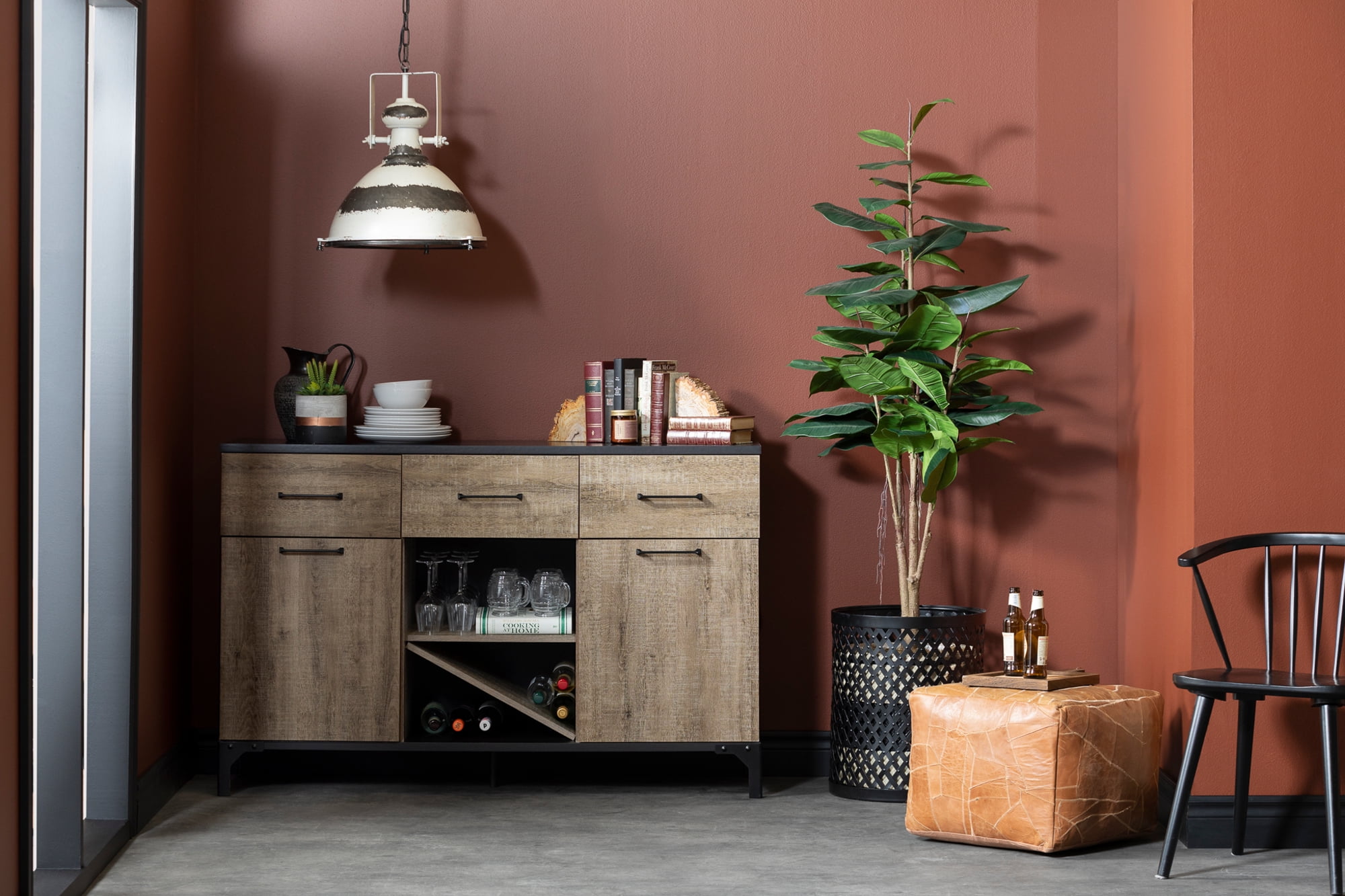 For REPLACING PARTS and HELP DURING ASSEMBLY, please contact us by phone at 1-800-290-0465, text message at 915-800-2833 (USA) (fees may apply), email at [email protected] or fill a part request form on . South Shore Valet, Industrial Buffet with Wine Storage, Rubbed Black and Weathered Oak INDUSTRIAL STYLE: Metal and wood give this piece an almost “raw,” untreated appearance – a blend of finishes that makes for a very Industrial look! WINE STORAGE: This cabinet is deep enough to hold your wine bottles. Change the height of the shelf, and you can also fit in some liquor bottles. SPACE FOR DISHES AND GLASSWARE: A storage compartment with doors and adjustable shelves that can hold up to 25 lbs. each. The perfect place for wine glasses, good china, and place mats. Made in North America with non-toxic, laminated particleboard. Accessories not included. 5-year limited warranty. Any questions? Contact South Shore, available 7/7: 1-800-290-0465 or Assembly is required and tools are not included. All products come with a clear assembly document that will guide you through all steps. If you have any questions during the assembly do not hesitate to contact South Shore Furniture for immediate support. This item is shipped in 1 box. Box dimensions : 64″ (L) x 20″ (W) x 7″ (H) 145 lb All our products meets or exceeds North American safety standards and our packaging are tested and certified to reduce the risk of damage during shipment. Clean with a dry cloth