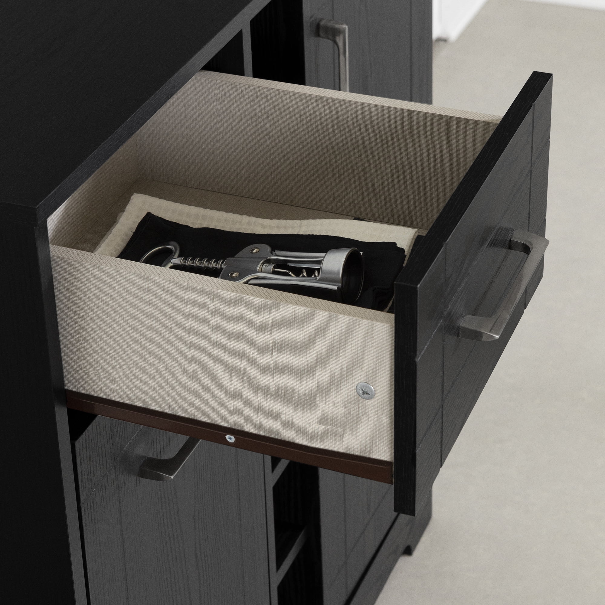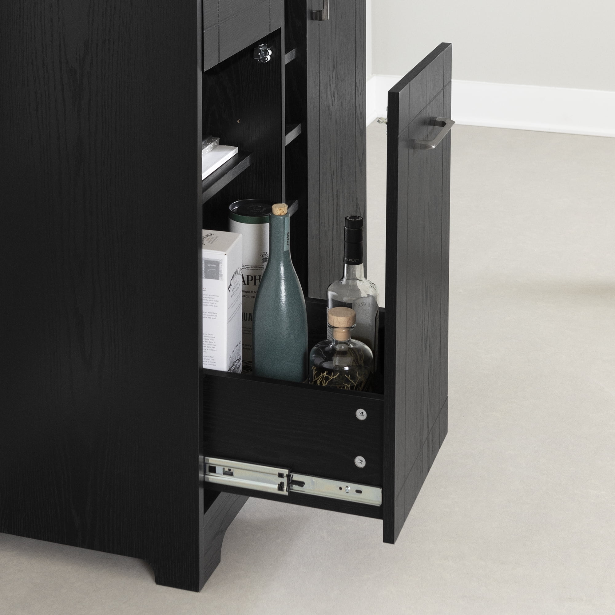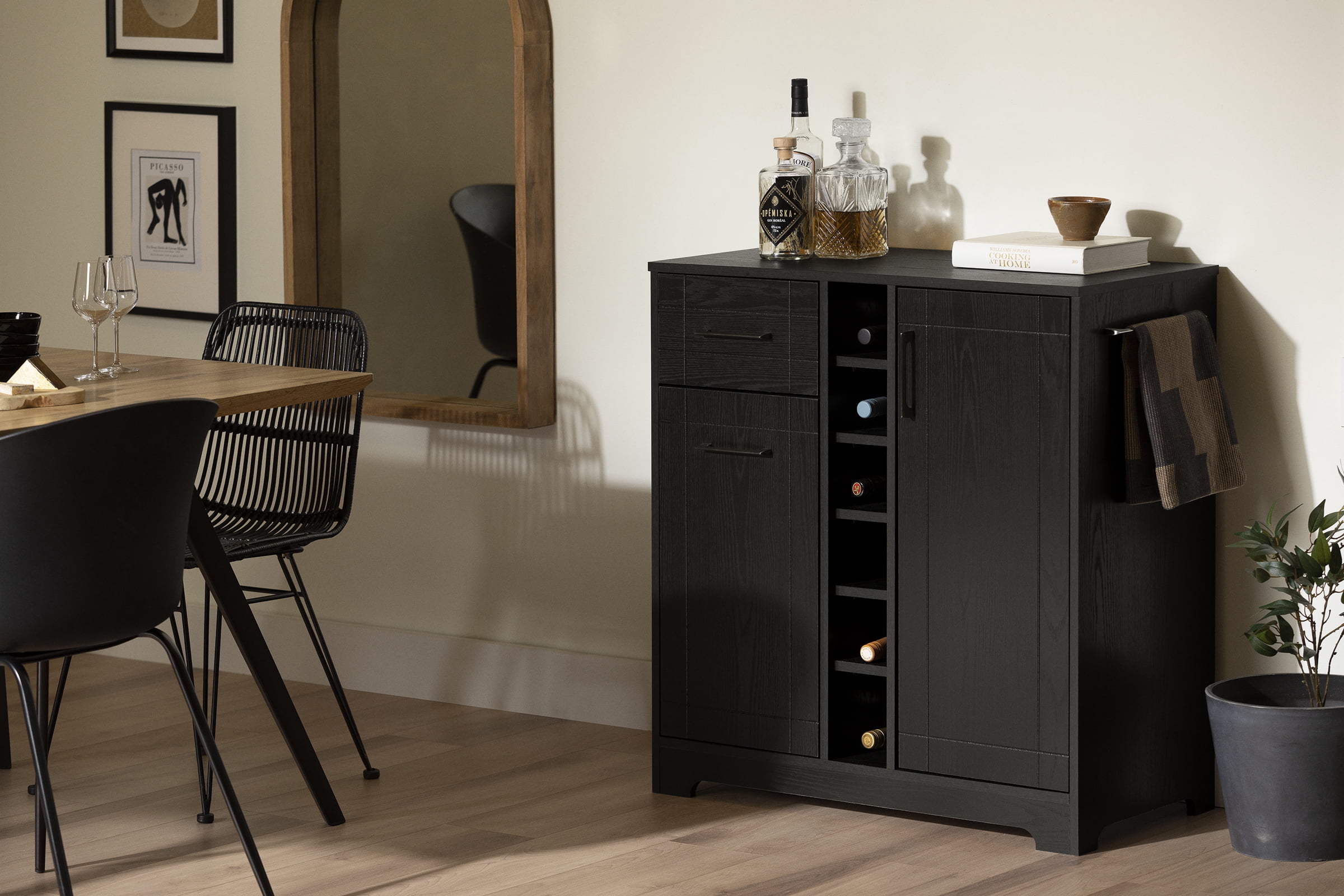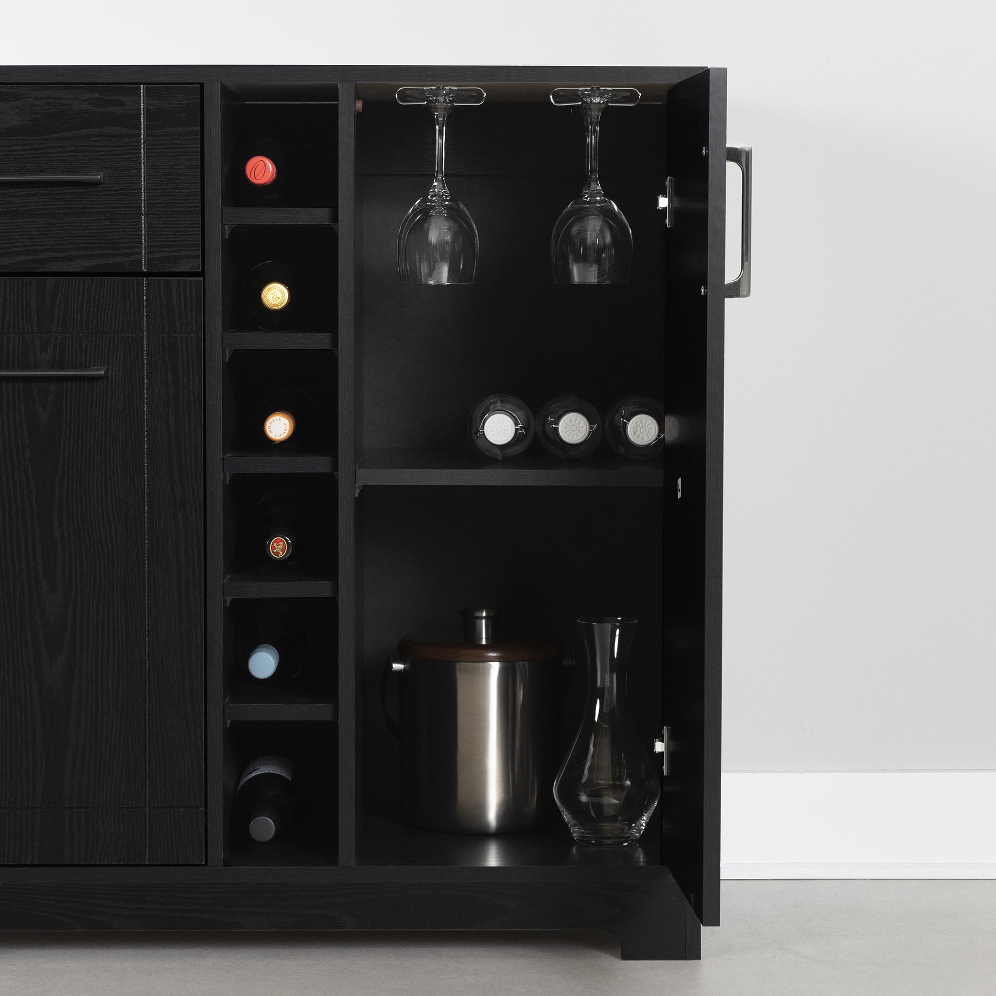 For REPLACING PARTS and HELP DURING ASSEMBLY, please contact us by phone at 1-800-290-0465, text message at 915-800-2833 (fees may apply) or fill a part request form on South Shore Furniture website. South Shore Vietti, Contemporary Bar Cabinet and Bottle Storage, Black Oak STORAGE DRAWER FOR BOTTLES: The drawer is just the right depth for arranging your wine and liquor bottles. STORAGE DRAWER FOR ACCESSORIES: It’s always handy to have a bottle opener and some coasters within easy reach! STORAGE COMPARTMENT: Set up with glass holders and a shelf, you’ll find it truly useful for organizing your space. A RACK FOR BOTTLES: Six shelves give you even more bottle storage space. TOWEL HOLDER INCLUDED: You can hang a towel on the right side. CONTEMPORARY STYLE: You’ll like the versatility and timelessness that make this bar cabinet a lasting purchase. Made with laminated particleboard. Accessories not included. 5-year limited warranty. Any questions? Contact South Shore, available 7/7: 1-800-290-0465 Assembly is required and tools are not included. All products come with a clear assembly document that will guide you through all steps. If you have any questions during the assembly do not hesitate to contact South Shore Furniture for immediate support. This item is shipped in 1 box. Box dimensions : 45.75″ (L) x 17.5″ (W) x 7.75″ (H) 98 lb Clean with a dry cloth