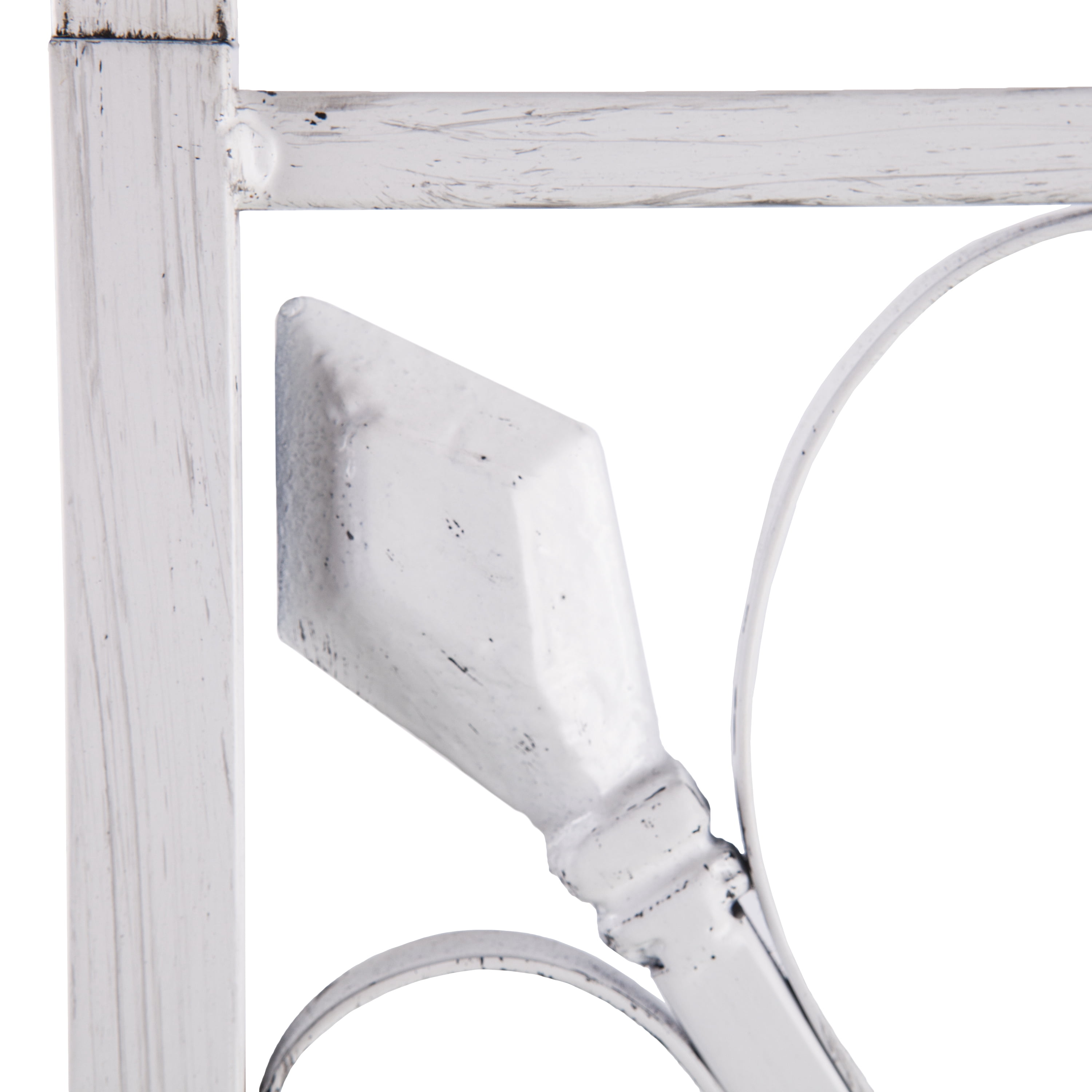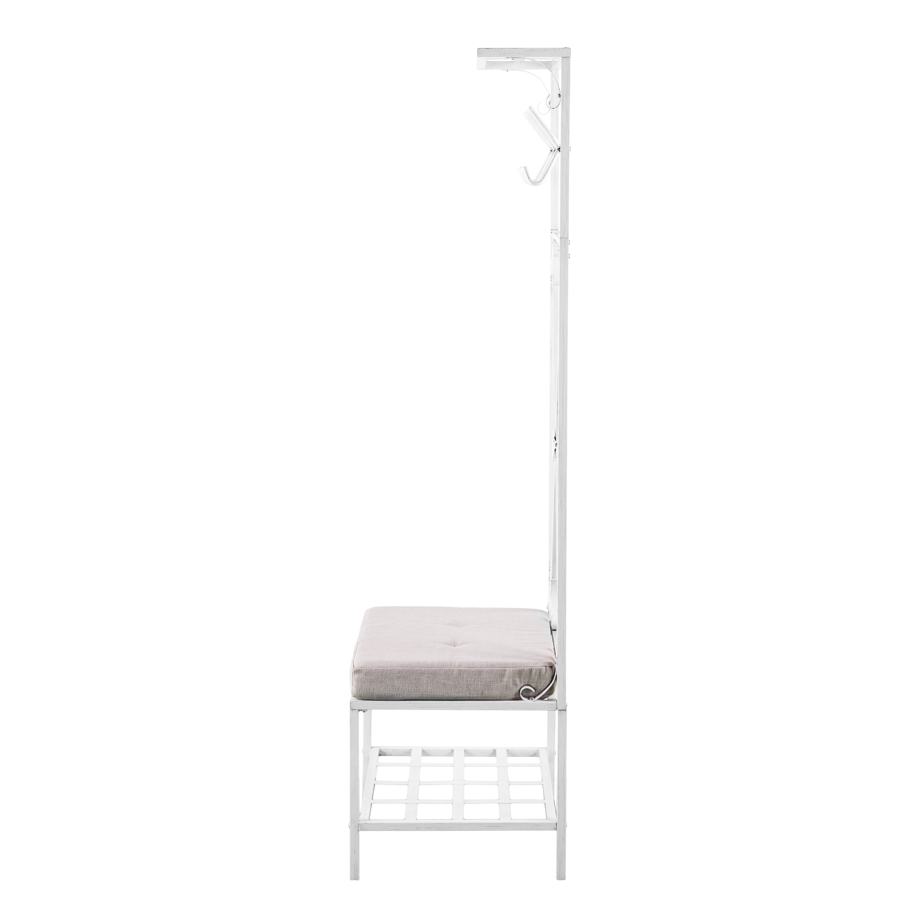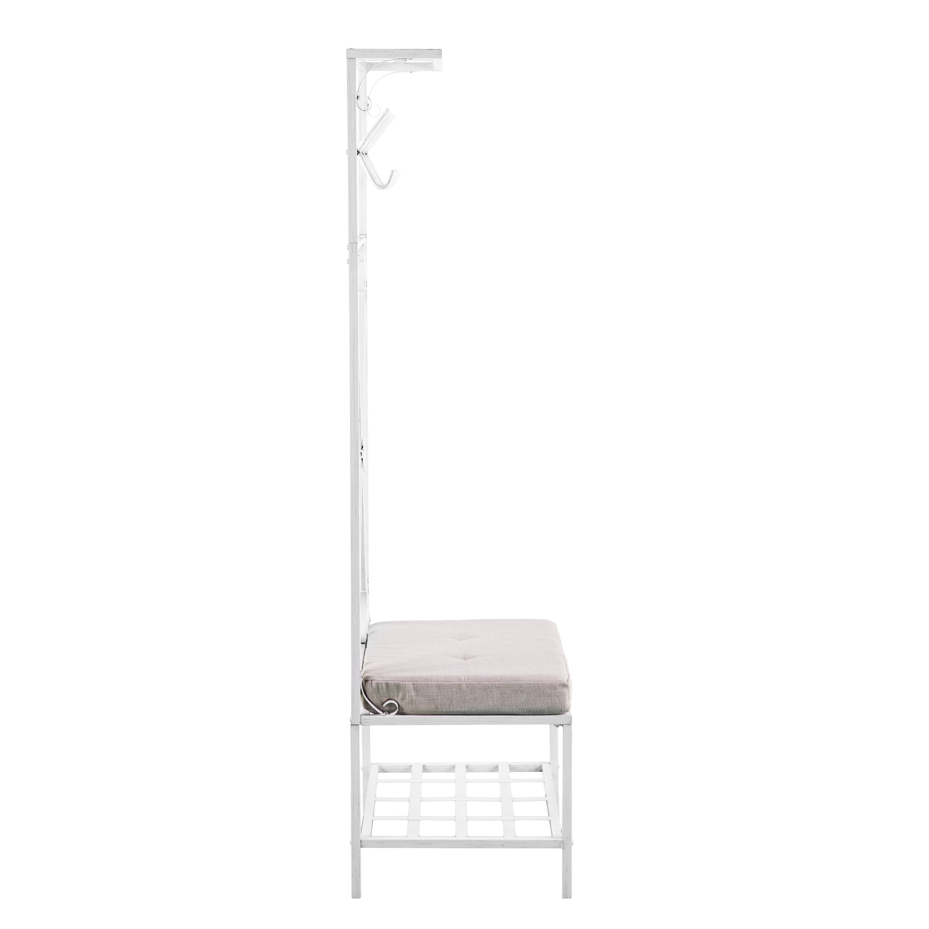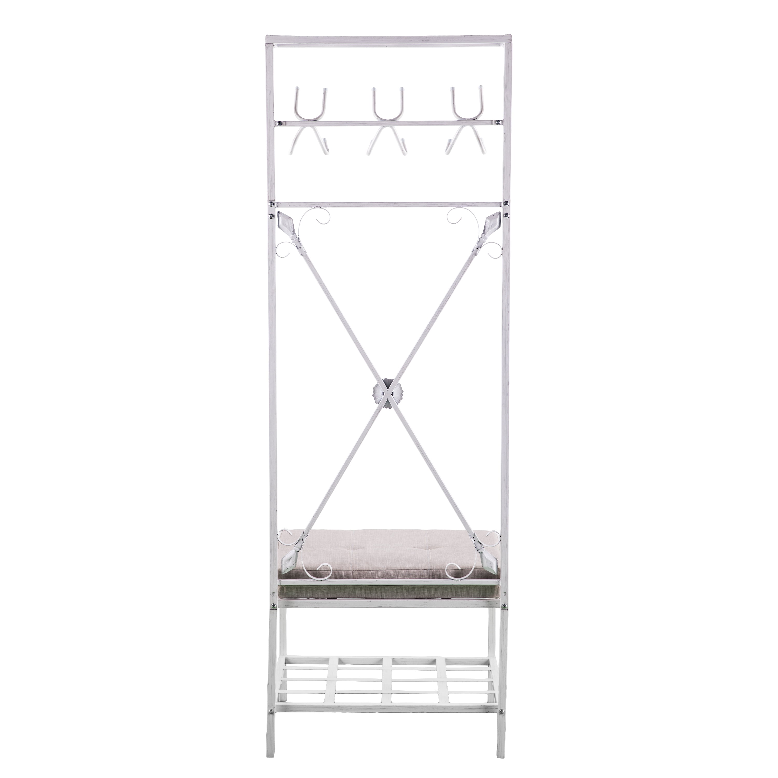 Southern Enterprises Heru Entryway Hall Tree Bench w/ Storage, Distressed White: FEATURES: ? All-in-one coat rack w/ bench seat ? 12 hooks and 2 ventilated shelves ? Elegant scrollwork adorns the composition ? Hall/entry or open concept living space ? Soft traditional inspired farmhouse style ? Distressed white w/ gray ? Overall: 24″ W x 19″ D x 72.5″ H ? Assembly: Required ? Seat: 23″ W x 18″ D x 19″ H ? Seat cushion: 23″ W x 18″ D x 3″ THK ? Shelves: 24″ W x 7.75″ D, 22.5″ W x 17.25″ D x 10.75″ H (top, bottom) ? Clearance: 22.5″ W x 17.25″ D x 3.75″ H ? Footprint: 24″ W x 19″ D ? Approx. weight: 19 lb. ? Supports up to: 250 lb. (seat), 20 lb. (each shelf), 3 lb. (each hook) ? Materials: Powder-coated iron tube, polyurethane foam, fabric ? Fabric: Linen/cotton blend ? Compliance: CPC/CPSIA
