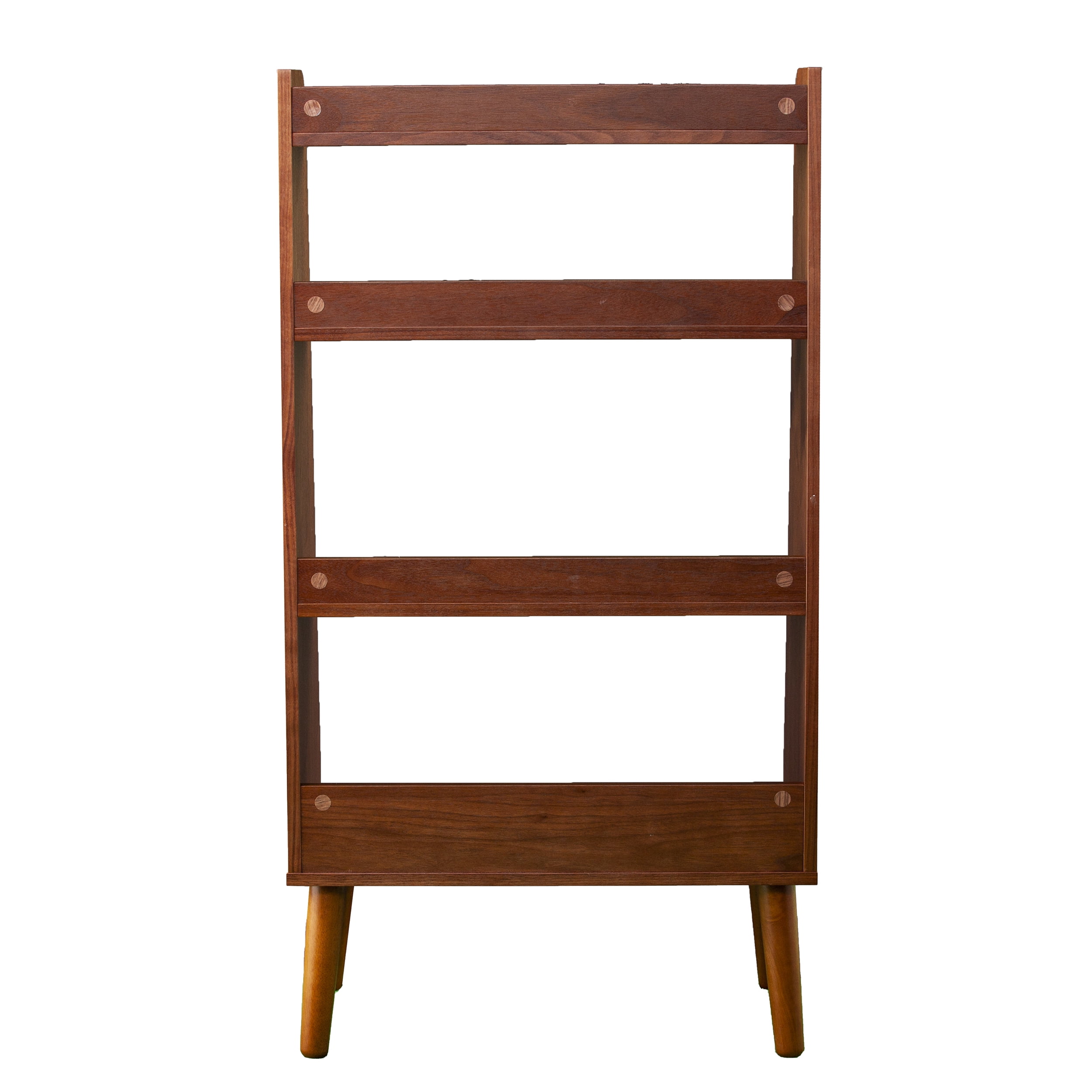 Max out your midcentury modern design with this wooden bookcase. Four shelves of varying sizes provide a home for books and notepads, while classic spindle legs leave a minimal footprint. Doubling as a home bar, your favorite spirits and bar accessories look elegant displayed on this walnut-finished bookshelf. Upgrade with midcentury flair when you place this storage shelf in your home office or bar area.