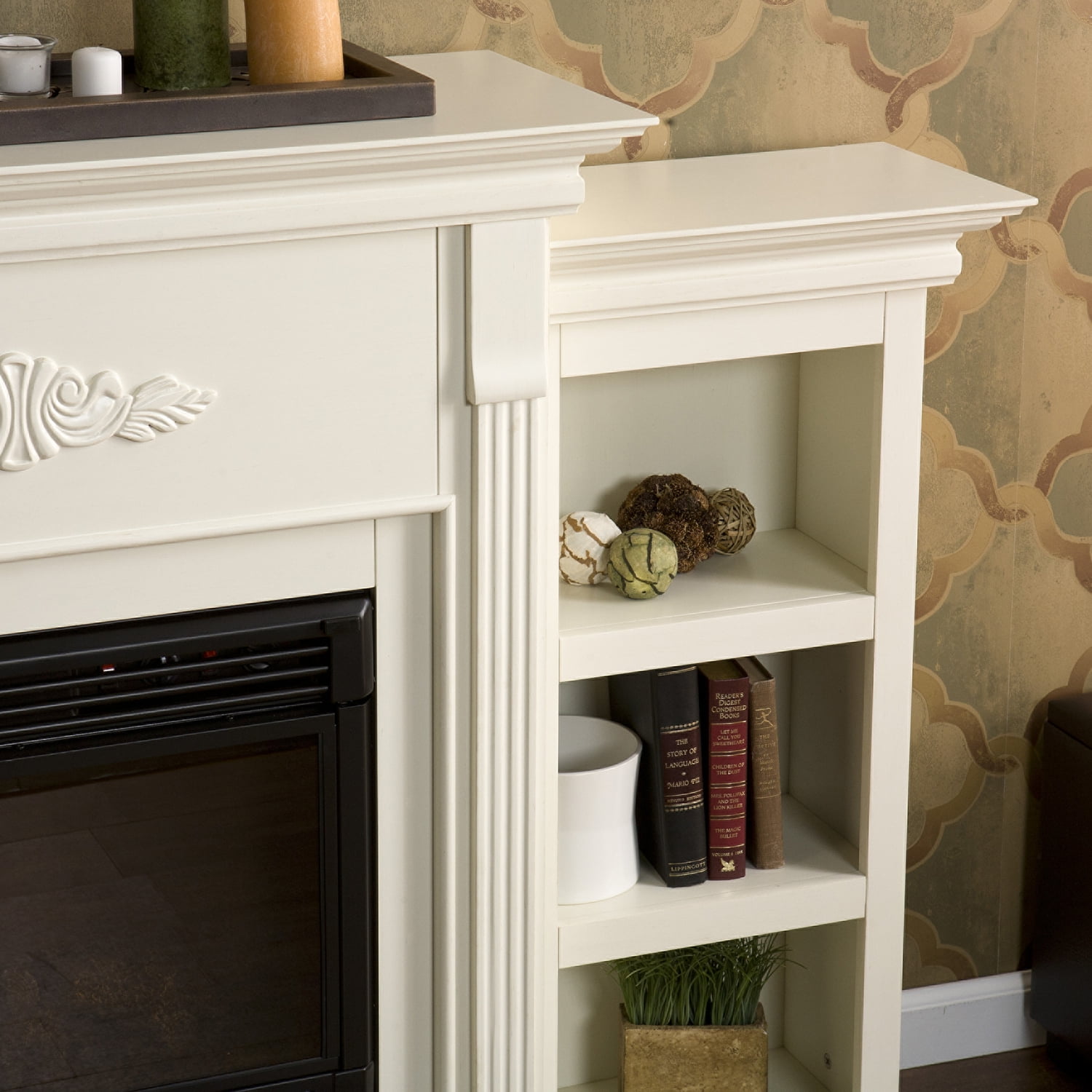 Southern Enterprises SEI Furniture Fredricksburg Wood Electric Fireplace with Bookcases in Brown Electric Fireplace: The bookshelves feature an electric fireplace that produces a warm and cozy ambiance in any room Remote Control: The included remote control allows you to adjust the thermostat, timer, logs, and life-like flames with ease Classic Mahogany Finish: Finished in a classic mahogany that combines with carved detailing for a soft traditional style Bookcase Shelves: Six fixed bookcase-style shelves provide ample space to display and store items, making it a great addition to any living room or bedroom TV Mantel Support: The mantel can support a flat panel TV that measures up to 68.25 inches wide overall with a base measuring up to 40 inches wide