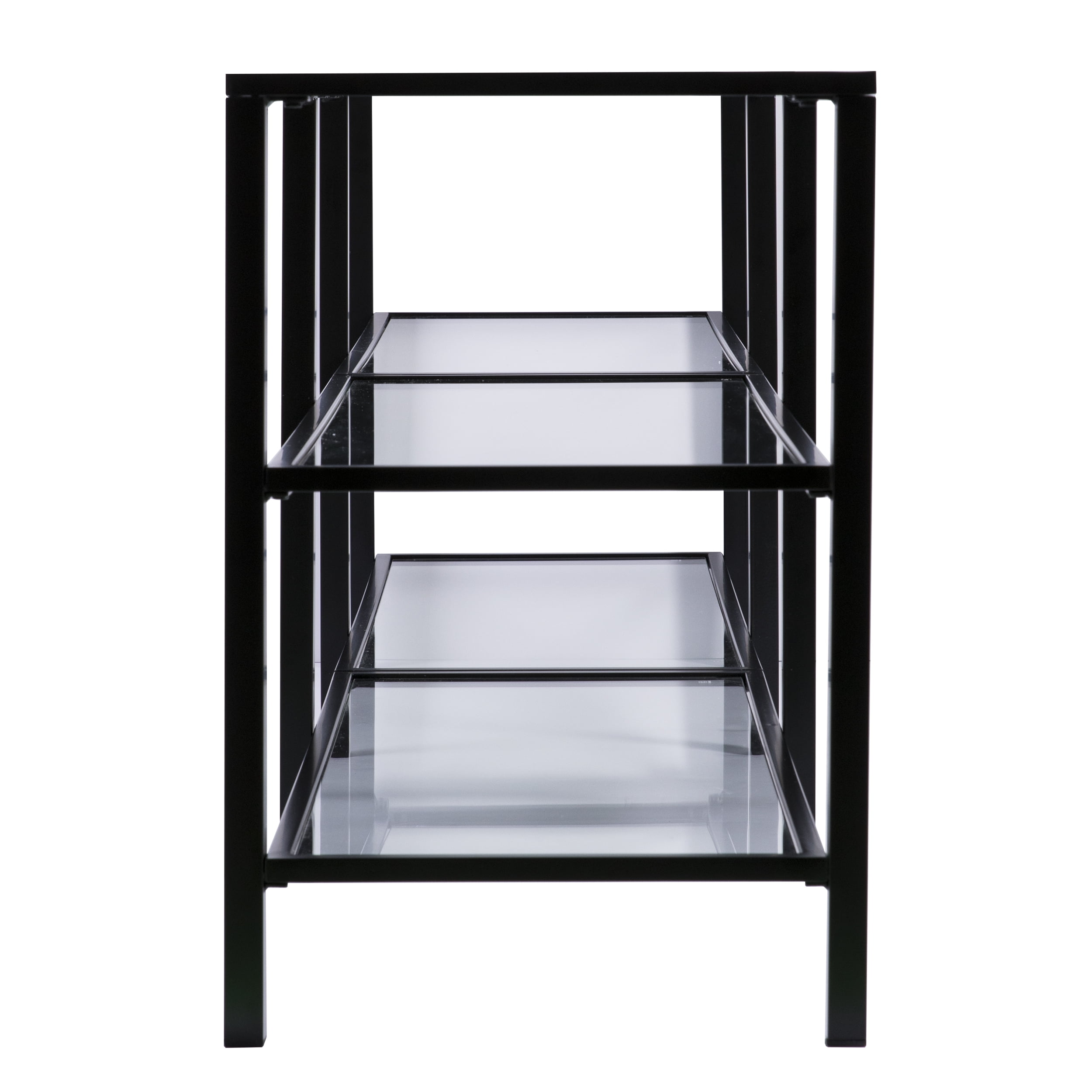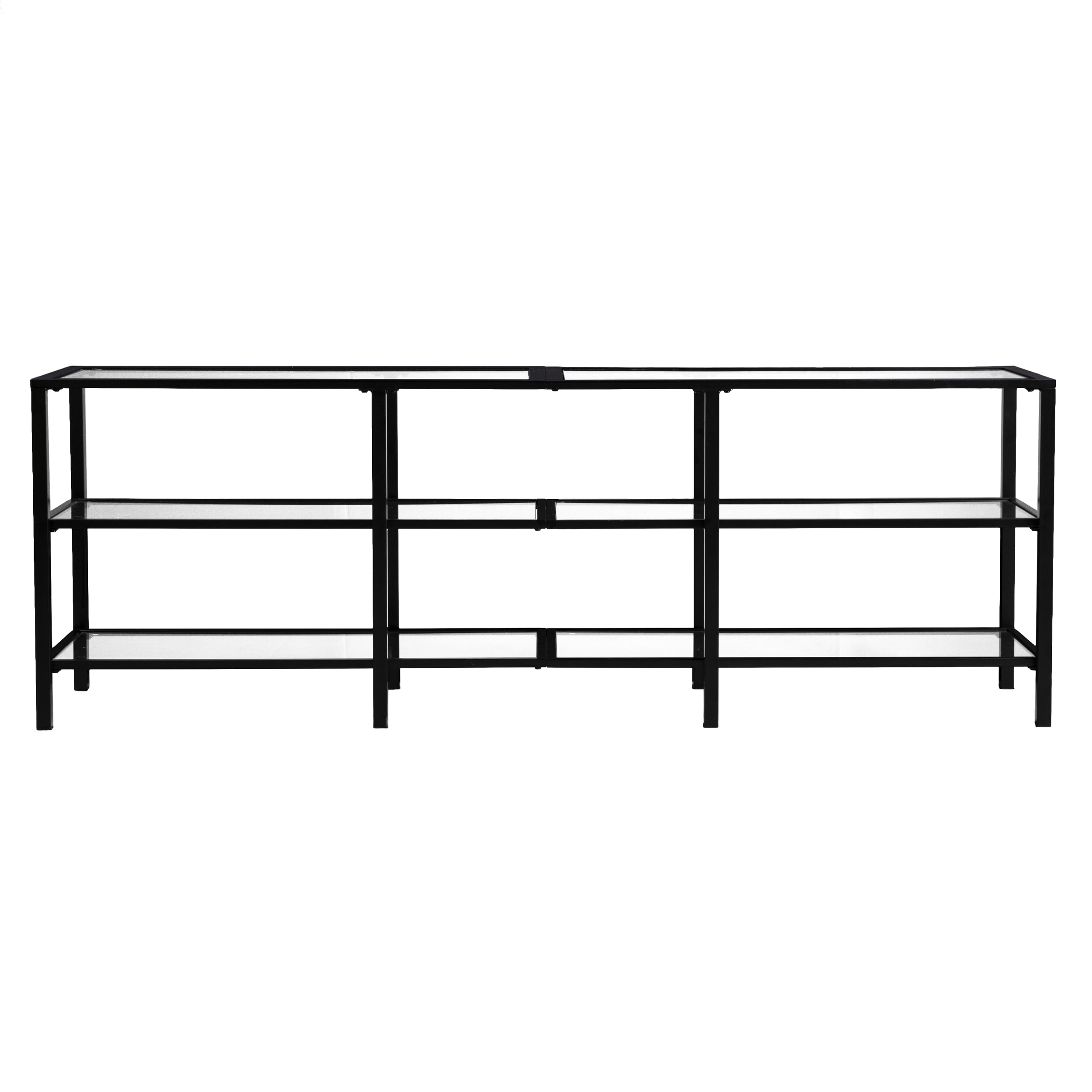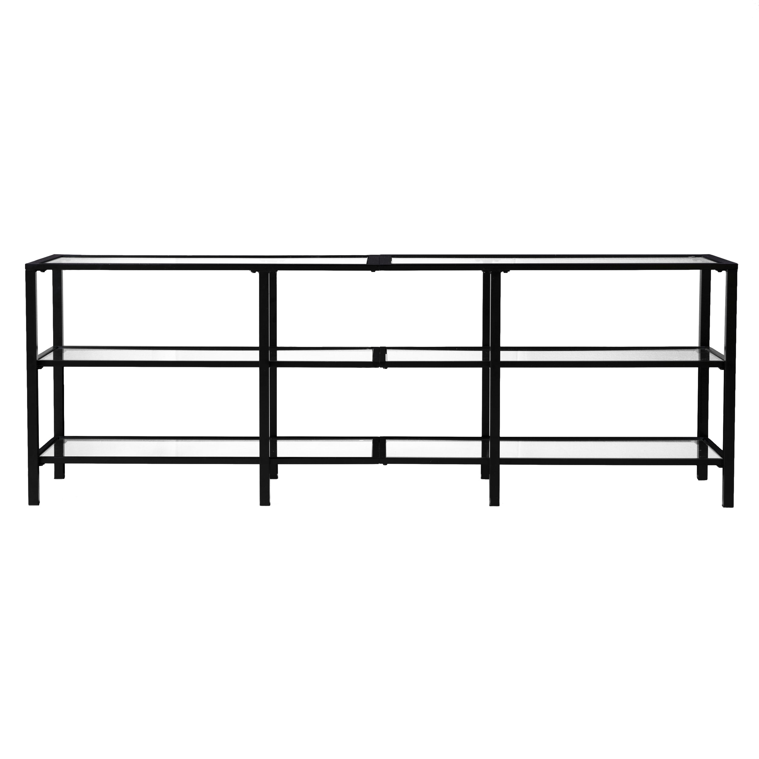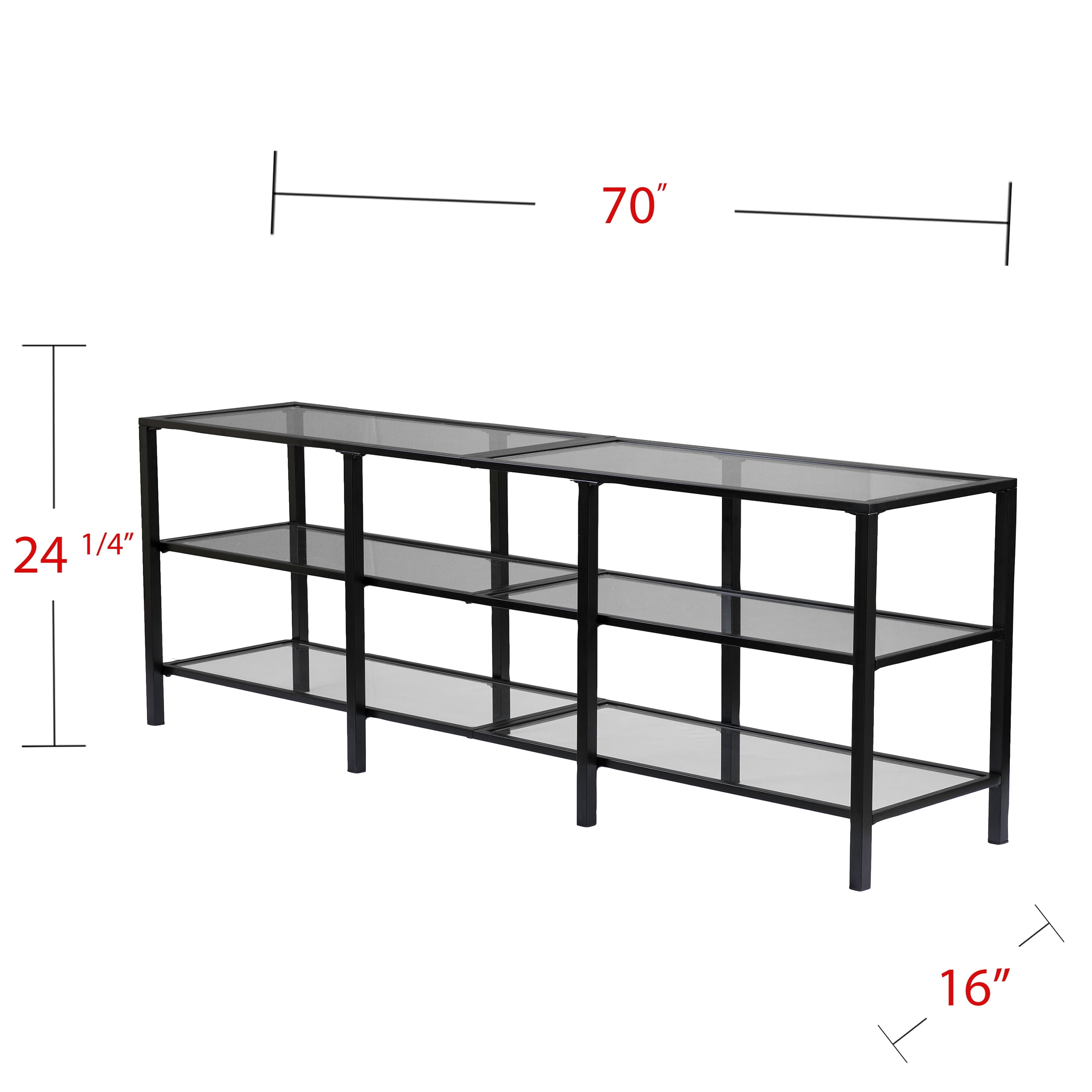 Features Wide-scale media stand Accommodates a 68″ W overall flat-screen TV 2 sleek, tempered glass shelves Airy space provides room for multiple devices Living room, hall/entry, or open concept living space Transitional, contemporary style Matte black finish Overall: 70″ W x 16″ D x 24.25″ H Assembly: Easy to assemble Top: 70″ W x 16″ D x 24.25″ H x .75″ THINK Each shelf: 67.5″ W x 14″ D x 9.25″ H Shelf openings: 22″ W x 14″ D x 9.25″ H (3 openings on each shelf) Glass surfaces: 32.5″ W x 13.5″ D x 5 mm THINK (each) Base type: 4 legs Clearance: 22″ W x 14″ D x 4.25″ H Footprint: 70″ W x 16″ D Legs: 1″ W x 1″ D x 23.5″ H Approx. weight: 73 lb. Supports up to 85 lb. (top), 20 lb. (each shelf) Materials: Powder-coated iron, 5 mm tempered glass Materials breakdown: Top: 5 mm tempered glass, 25 mm DIAMETER iron; Frame: 15 mm DIAMETER iron, 16 mm DIAMETER iron Compliance: CPC/CPSIA CARE: Dust with a soft, dry cloth. Clean glass w/ glass cleaner.
