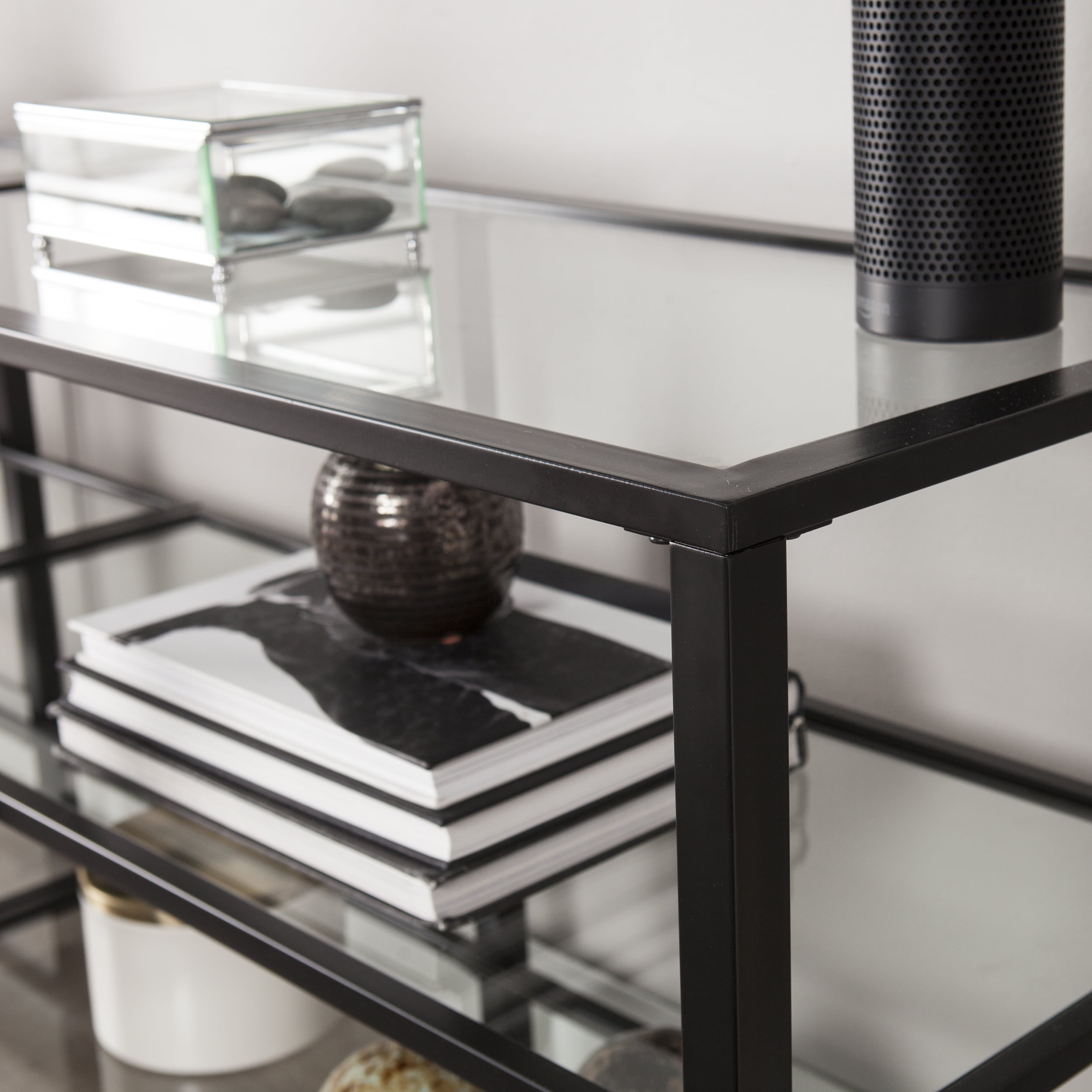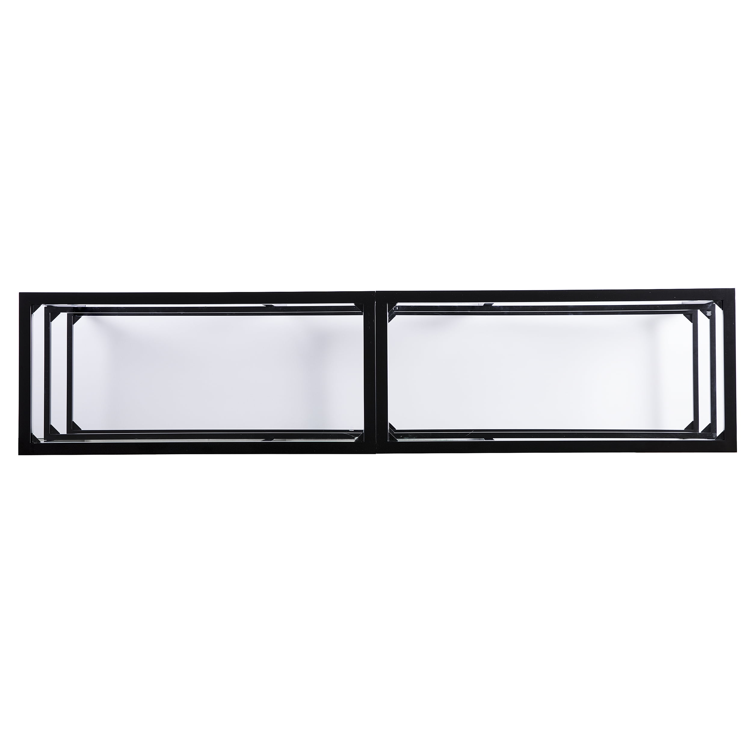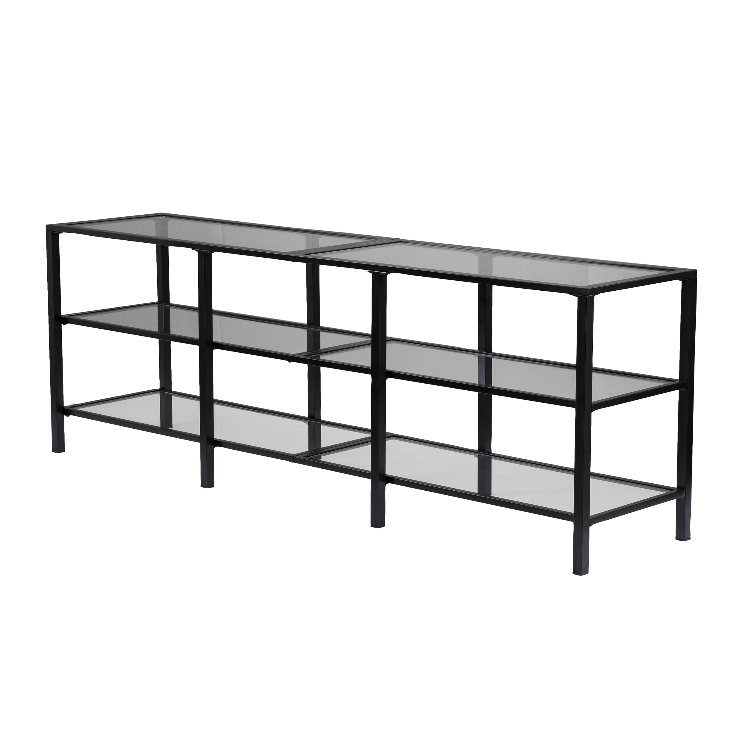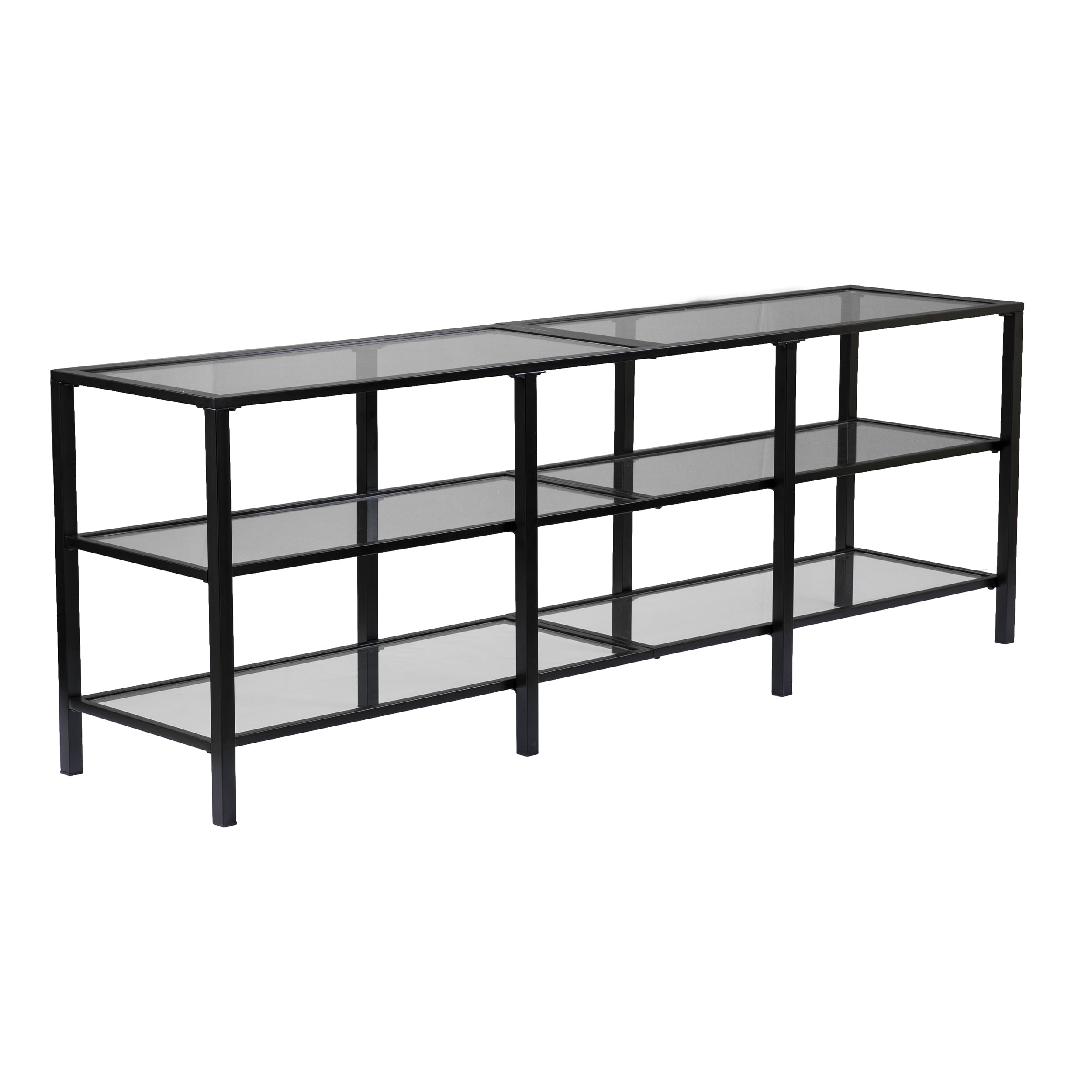 Features Wide-scale media stand Accommodates a 68″ W overall flat-screen TV 2 sleek, tempered glass shelves Airy space provides room for multiple devices Living room, hall/entry, or open concept living space Transitional, contemporary style Matte black finish Overall: 70″ W x 16″ D x 24.25″ H Assembly: Easy to assemble Top: 70″ W x 16″ D x 24.25″ H x .75″ THINK Each shelf: 67.5″ W x 14″ D x 9.25″ H Shelf openings: 22″ W x 14″ D x 9.25″ H (3 openings on each shelf) Glass surfaces: 32.5″ W x 13.5″ D x 5 mm THINK (each) Base type: 4 legs Clearance: 22″ W x 14″ D x 4.25″ H Footprint: 70″ W x 16″ D Legs: 1″ W x 1″ D x 23.5″ H Approx. weight: 73 lb. Supports up to 85 lb. (top), 20 lb. (each shelf) Materials: Powder-coated iron, 5 mm tempered glass Materials breakdown: Top: 5 mm tempered glass, 25 mm DIAMETER iron; Frame: 15 mm DIAMETER iron, 16 mm DIAMETER iron Compliance: CPC/CPSIA CARE: Dust with a soft, dry cloth. Clean glass w/ glass cleaner.